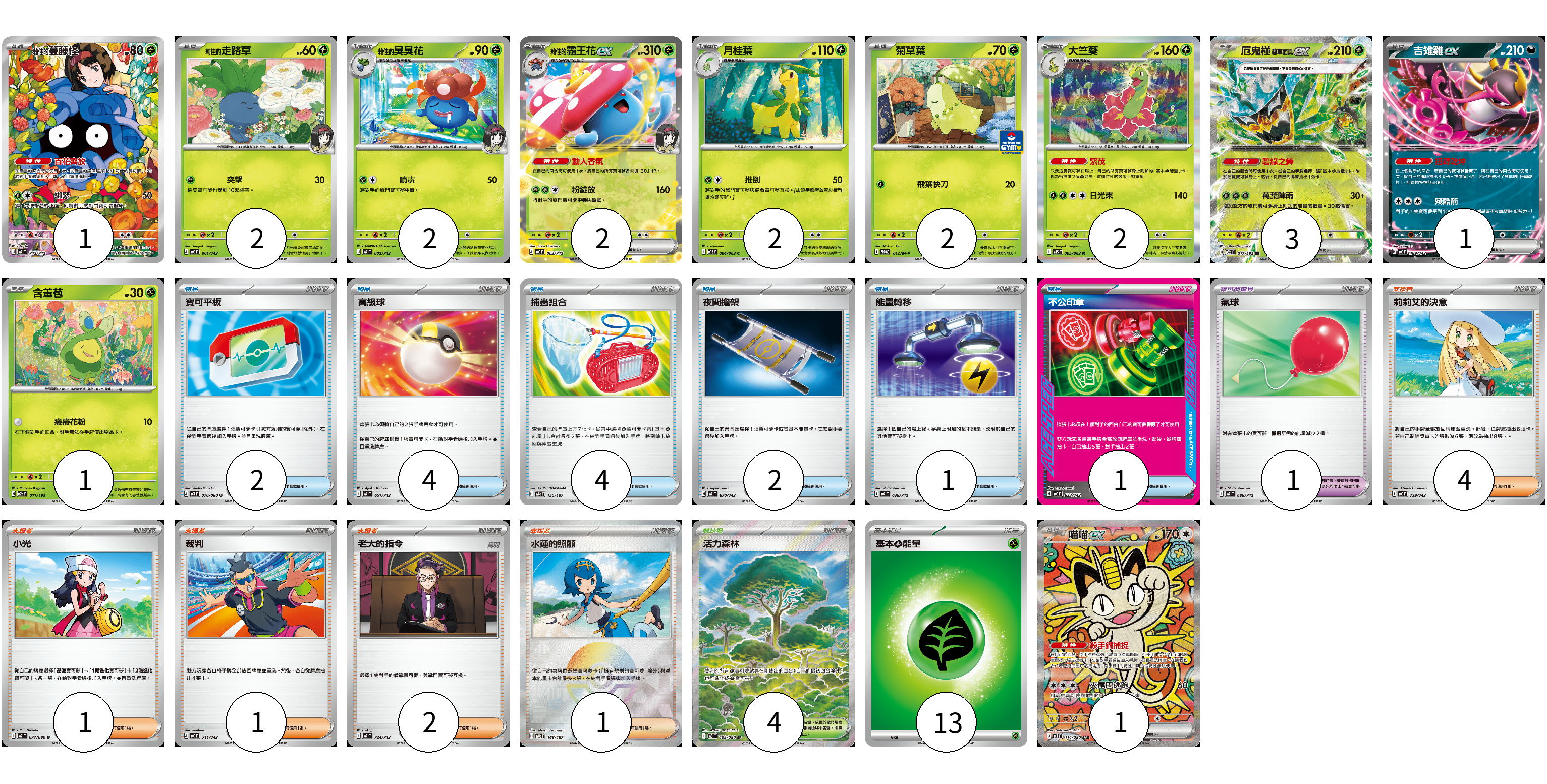 牌組構築方案 以此牌組為基礎新構築牌組 顯示卡面 顯示列表 寶可夢卡(19) 1 2 2 2 2 2 2 3 1 1 1 寶可夢道具(1) 1 物品卡(14) 2 4 4 2 1 1 支援者卡(9) 4 1 1 2 1 競技場卡(4) 4 能量卡(13) 13 寶可夢卡(19) 卡牌名稱 張數 卡牌名稱 張數 莉佳的蔓藤怪 MC 743/742 01 <莉佳的>走路草 MC 001/742 02 <莉佳的>臭臭花 MC 002/742 02 <莉佳的>霸王花ex MC 003/742 02 月桂葉 M1S 004/063 02 菊草葉 M-P 012/M-P 02 大竺葵 M1S 005/063 02 厄鬼椪 碧草面具ex M2a 017/193 03 吉雉雞ex MC 489/742 01 含羞苞 M2a 011/193 01 喵喵ex M3 114/080 01 寶可夢道具(1) 卡牌名稱 張數 卡牌名稱 張數 氣球 MC 688/742 01 物品卡(14) 卡牌名稱 張數 卡牌名稱 張數 寶可平板 M3 070/080 02 高級球 MC 651/742 04 捕蟲組合 SV8a 150/187 04 夜間擔架 MC 670/742 02 能量轉移 MC 638/742 01 不公印章 MC 633/742 01 支援者卡(9) 卡牌名稱 張數 卡牌名稱 張數 莉莉艾的決意 MC 729/742 04 小光 M2 077/080 01 裁判 MC 711/742 01 老大的指令 MC 724/742 02 水蓮的照顧 SV8a 168/187 01 競技場卡(4) 卡牌名稱 張數 卡牌名稱 張數 活力森林 M3 109/080 04 能量卡(13) 卡牌名稱 張數 卡牌名稱 張數 基本【草】能量 MJ GRA 13 以此牌組為基礎新構築牌組 牌組編碼 ftdPSu-wzCLFt-QJLzpU copy 列印牌組單 牌組編碼已複製 分享至SNS