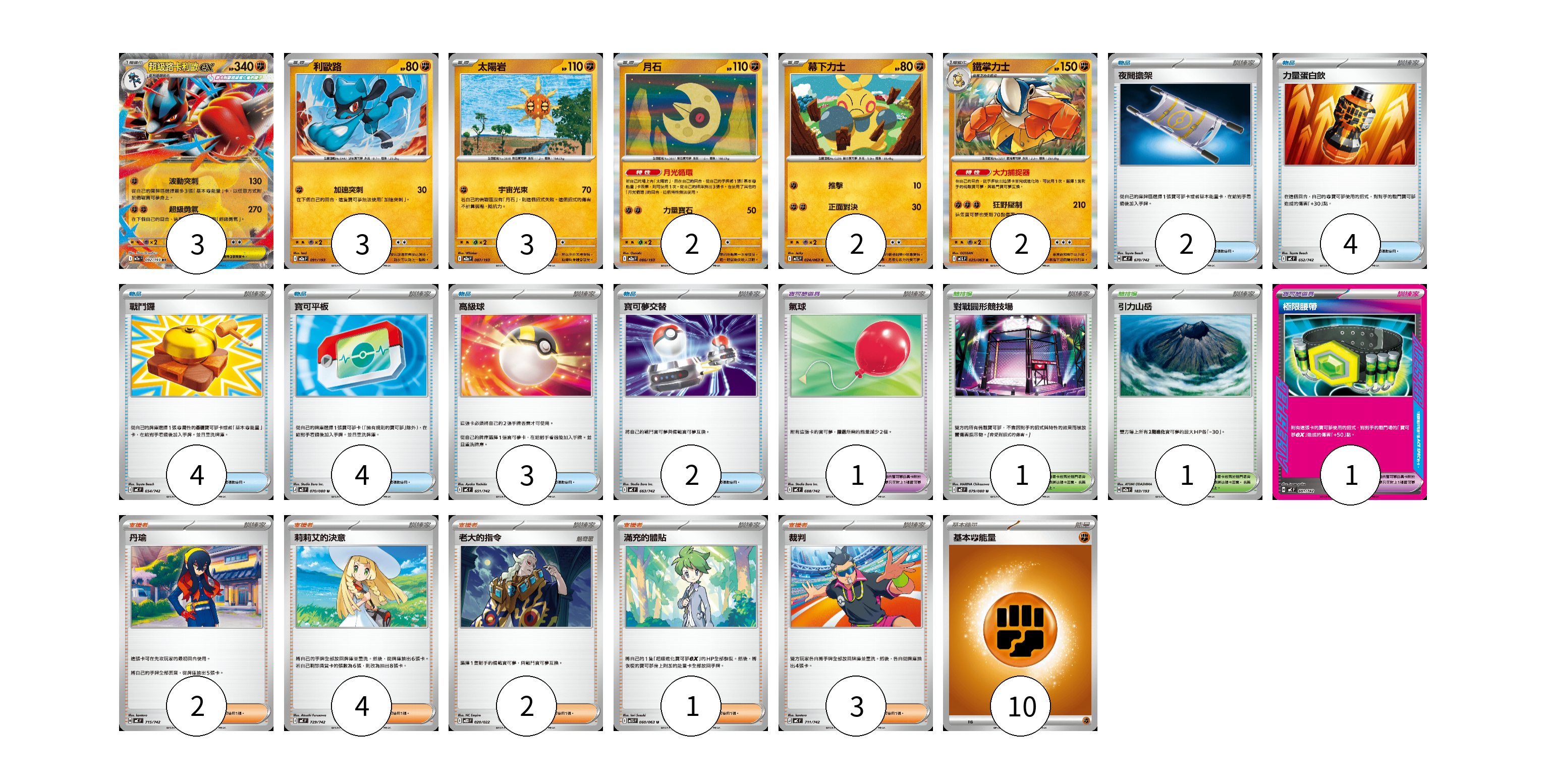 牌組構築方案 以此牌組為基礎新構築牌組 顯示卡面 顯示列表 寶可夢卡(15) 3 3 3 2 2 2 寶可夢道具(2) 1 1 物品卡(19) 2 4 4 4 3 2 支援者卡(12) 2 4 2 1 3 競技場卡(2) 1 1 能量卡(10) 10 寶可夢卡(15) 卡牌名稱 張數 卡牌名稱 張數 超級路卡利歐ex M2a 092/193 03 利歐路 M2a 091/193 03 太陽岩 M2a 087/193 03 月石 M2a 086/193 02 幕下力士 M1L 024/063 02 鐵掌力士 M1L 025/063 02 寶可夢道具(2) 卡牌名稱 張數 卡牌名稱 張數 氣球 MC 688/742 01 極限腰帶 MC 691/742 01 物品卡(19) 卡牌名稱 張數 卡牌名稱 張數 夜間擔架 MC 670/742 02 力量蛋白飲 MC 652/742 04 戰鬥鑼 MC 654/742 04 寶可平板 M3 070/080 04 高級球 MC 651/742 03 寶可夢交替 MC 663/742 02 支援者卡(12) 卡牌名稱 張數 卡牌名稱 張數 丹瑜 MC 715/742 02 莉莉艾的決意 MC 729/742 04 老大的指令 MBD 020/022 02 滿充的體貼 M1S 060/063 01 裁判 MC 711/742 03 競技場卡(2) 卡牌名稱 張數 卡牌名稱 張數 對戰圓形競技場 M2 079/080 01 引力山岳 M2a 183/193 01 能量卡(10) 卡牌名稱 張數 卡牌名稱 張數 基本【鬥】能量 MC FIG 10 以此牌組為基礎新構築牌組 牌組編碼 fuGLUV-BnJoxV-uWJwBr copy 列印牌組單 牌組編碼已複製 分享至SNS