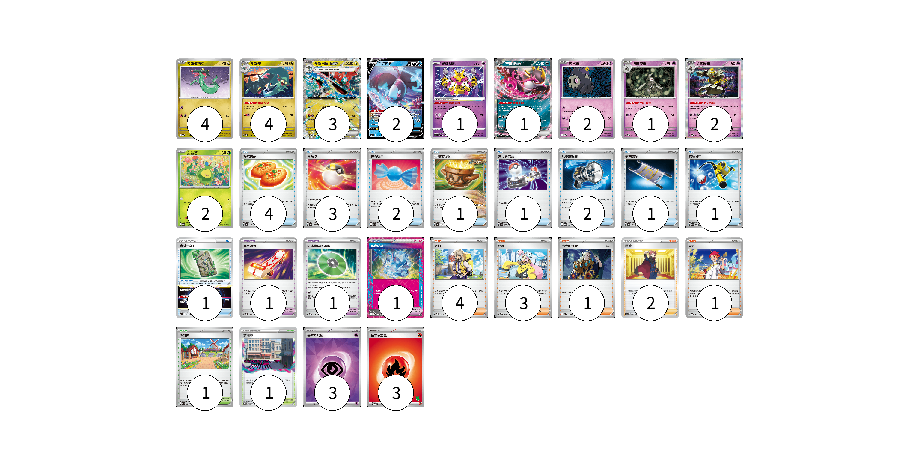 牌組構築方案 以此牌組為基礎新構築牌組 顯示卡面 顯示列表 寶可夢卡(22) 4 4 3 2 1 1 2 1 2 2 寶可夢道具(3) 1 1 1 物品卡(16) 4 3 2 1 1 2 1 1 1 支援者卡(11) 4 3 1 2 1 競技場卡(2) 1 1 能量卡(6) 3 3 寶可夢卡(22) 卡牌名稱 張數 卡牌名稱 張數 多龍梅西亞 SV8a 118/187 04 多龍奇 SV8a 119/187 04 多龍巴魯托ex SV8a 120/187 03 霓虹魚V SVHK 004/022 02 光輝胡地 SVTM 006/022 01 吉雉雞ex SV8a 104/187 01 夜巡靈 SV8a 064/187 02 彷徨夜靈 SV8a 065/187 01 黑夜魔靈 SV8a 066/187 02 含羞苞 SV8a 001/187 02 寶可夢道具(3) 卡牌名稱 張數 卡牌名稱 張數 緊急滑板 SV8a 153/187 01 招式學習器 演進 SV8a 160/187 01 璀璨結晶 SV8a 152/187 01 物品卡(16) 卡牌名稱 張數 卡牌名稱 張數 好友寶芬 SV8a 147/187 04 高級球 SVM 134/175 03 神奇糖果 SVM 135/175 02 大地之容器 SV8a 143/187 01 寶可夢交替 SVM 136/175 01 反擊捕捉器 SV8a 139/187 02 夜間擔架 SV8a 151/187 01 厲害釣竿 SVK 011/042 01 森林封印石 SVF 024/038 01 支援者卡(11) 卡牌名稱 張數 卡牌名稱 張數 派帕 SVK 035/042 04 奇樹 SVM 160/175 03 老大的指令 SVM 172/175 01 阿渡 S12 096/098 02 赤松 SV8a 163/187 01 競技場卡(2) 卡牌名稱 張數 卡牌名稱 張數 深缽鎮 SVK 039/042 01 放逐市 S11 099/100 01 能量卡(6) 卡牌名稱 張數 卡牌名稱 張數 基本【超】能量 SVK PSY 03 基本【火】能量 SVI FIR 03 以此牌組為基礎新構築牌組 牌組編碼 fwEYZe-lcyVrl-qbwtMi copy 列印牌組單 牌組編碼已複製 分享至SNS
