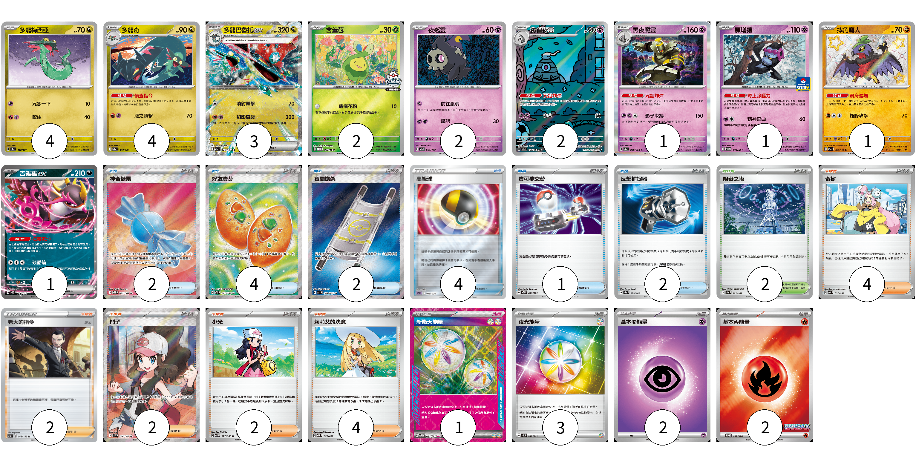 牌組構築方案 以此牌組為基礎新構築牌組 顯示卡面 顯示列表 寶可夢卡(21) 4 4 3 2 2 2 1 1 1 1 物品卡(15) 2 4 2 4 1 2 支援者卡(14) 4 2 2 2 4 競技場卡(2) 2 能量卡(8) 1 3 2 2 寶可夢卡(21) 卡牌名稱 張數 卡牌名稱 張數 多龍梅西亞 SV8a 118/187 04 多龍奇 SV8a 119/187 04 多龍巴魯托ex SV8a 120/187 03 含羞苞 M-P 037/M-P 02 夜巡靈 SV8a 064/187 02 彷徨夜靈 SV6a 069/064 02 黑夜魔靈 SV6a 020/064 01 願增猿 M-P 014/M-P 01 摔角鷹人 SV4a 282/190 01 吉雉雞ex SVOD 004/020 01 物品卡(15) 卡牌名稱 張數 卡牌名稱 張數 神奇糖果 M1S 082/063 02 好友寶芬 M1S 081/063 04 夜間擔架 M1L 083/063 02 高級球 SPD 010/020 04 寶可夢交替 SVQL 016/022 01 反擊捕捉器 SV8a 139/187 02 支援者卡(14) 卡牌名稱 張數 卡牌名稱 張數 奇樹 SVK 031/042 04 老大的指令(坂木) SC1b 148/153 02 鬥子 SV11W 166/086 02 小光 M2 077/080 02 莉莉艾的決意 MBD 021/022 04 競技場卡(2) 卡牌名稱 張數 卡牌名稱 張數 阻礙之塔 SV8a 181/187 02 能量卡(8) 卡牌名稱 張數 卡牌名稱 張數 新衝天能量 SV5K 071/071 01 夜光能量 SVK 042/042 03 基本【超】能量 MBD PSY 02 基本【火】能量 M-P 032/M-P 02 以此牌組為基礎新構築牌組 牌組編碼 fwkVnb-vCXCRG-bfOohN copy 列印牌組單 牌組編碼已複製 分享至SNS