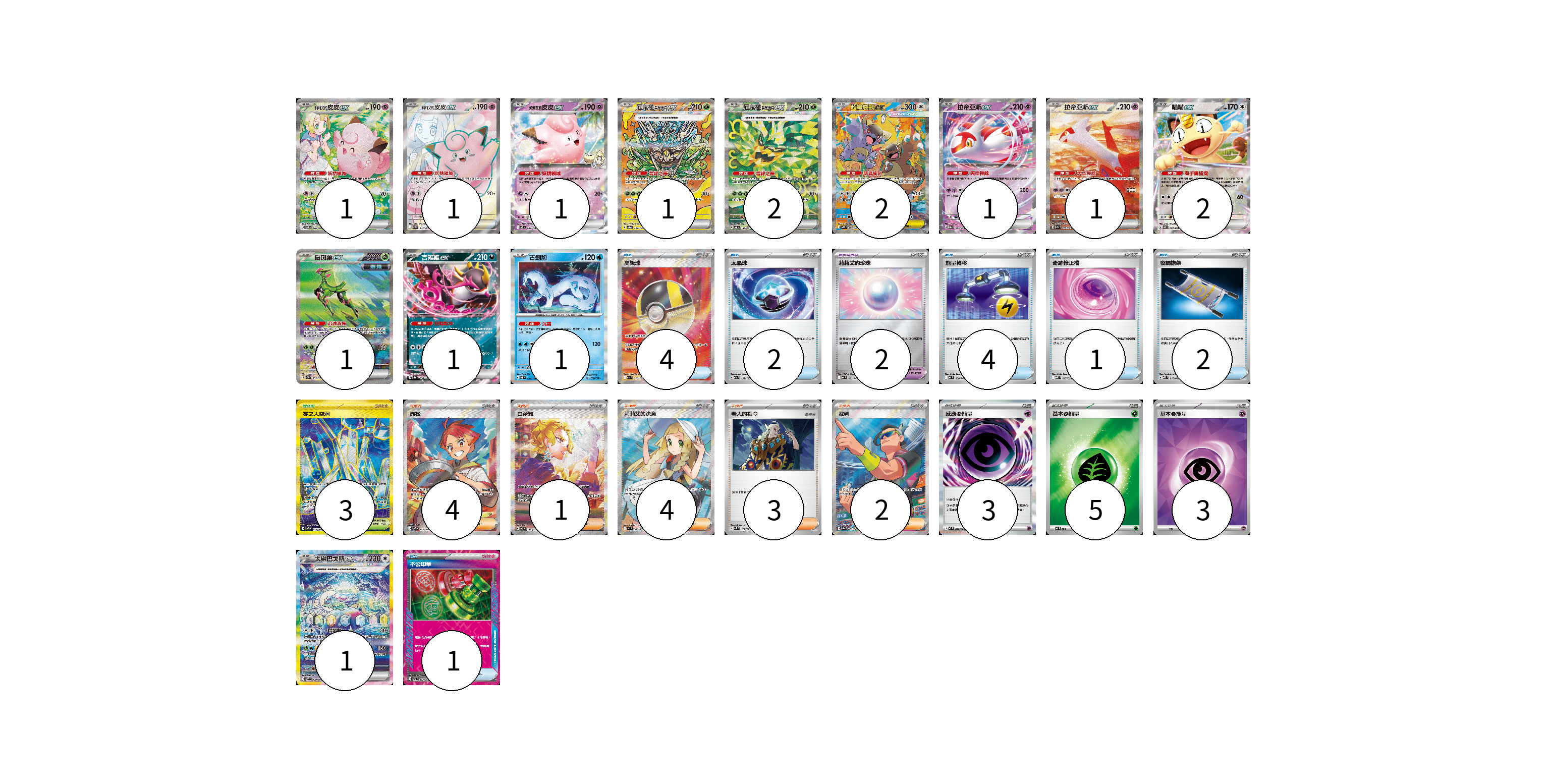 牌組構築方案 以此牌組為基礎新構築牌組 顯示卡面 顯示列表 寶可夢卡(16) 1 1 1 1 2 2 1 1 2 1 1 1 1 寶可夢道具(2) 2 物品卡(14) 4 2 4 1 2 1 支援者卡(14) 4 1 4 3 2 競技場卡(3) 3 能量卡(11) 3 5 3 寶可夢卡(16) 卡牌名稱 張數 卡牌名稱 張數 莉莉艾的皮皮ex SV9 126/100 01 莉莉艾的皮皮ex SV9 115/100 01 莉莉艾的皮皮ex SV9 033/100 01 厄鬼椪 碧草面具ex SV8a 201/187 01 厄鬼椪 碧草面具ex SV6 125/101 02 超級袋獸ex M1S 089/063 02 拉帝亞斯ex M2a 075/193 01 拉帝亞斯ex SV7a 087/064 01 喵喵ex M3 061/080 02 鐵斑葉ex SV5M 093/071 01 吉雉雞ex SV8a 104/187 01 古劍豹 SV8 032/106 01 太樂巴戈斯ex SV7 130/102 01 寶可夢道具(2) 卡牌名稱 張數 卡牌名稱 張數 莉莉艾的珍珠 MC 692/742 02 物品卡(14) 卡牌名稱 張數 卡牌名稱 張數 高級球 M2a 216/193 04 太晶珠 M2a 152/193 02 能量轉移 MC 638/742 04 奇跡修正檔 MBD 017/022 01 夜間擔架 MBD 016/022 02 不公印章 SV5a 053/066 01 支援者卡(14) 卡牌名稱 張數 卡牌名稱 張數 赤松 SV7 123/102 04 白蕾雅 SV7 132/102 01 莉莉艾的決意 M1L 086/063 04 老大的指令 SVM 172/175 03 裁判 SV9a 083/063 02 競技場卡(3) 卡牌名稱 張數 卡牌名稱 張數 零之大空洞 SV7 135/102 03 能量卡(11) 卡牌名稱 張數 卡牌名稱 張數 感應【超】能量 M3 079/080 03 基本【草】能量 MC GRA 05 基本【超】能量 SVOD PSY 03 以此牌組為基礎新構築牌組 牌組編碼 fxBoZw-vsdtfS-crdWtf copy 列印牌組單 牌組編碼已複製 分享至SNS