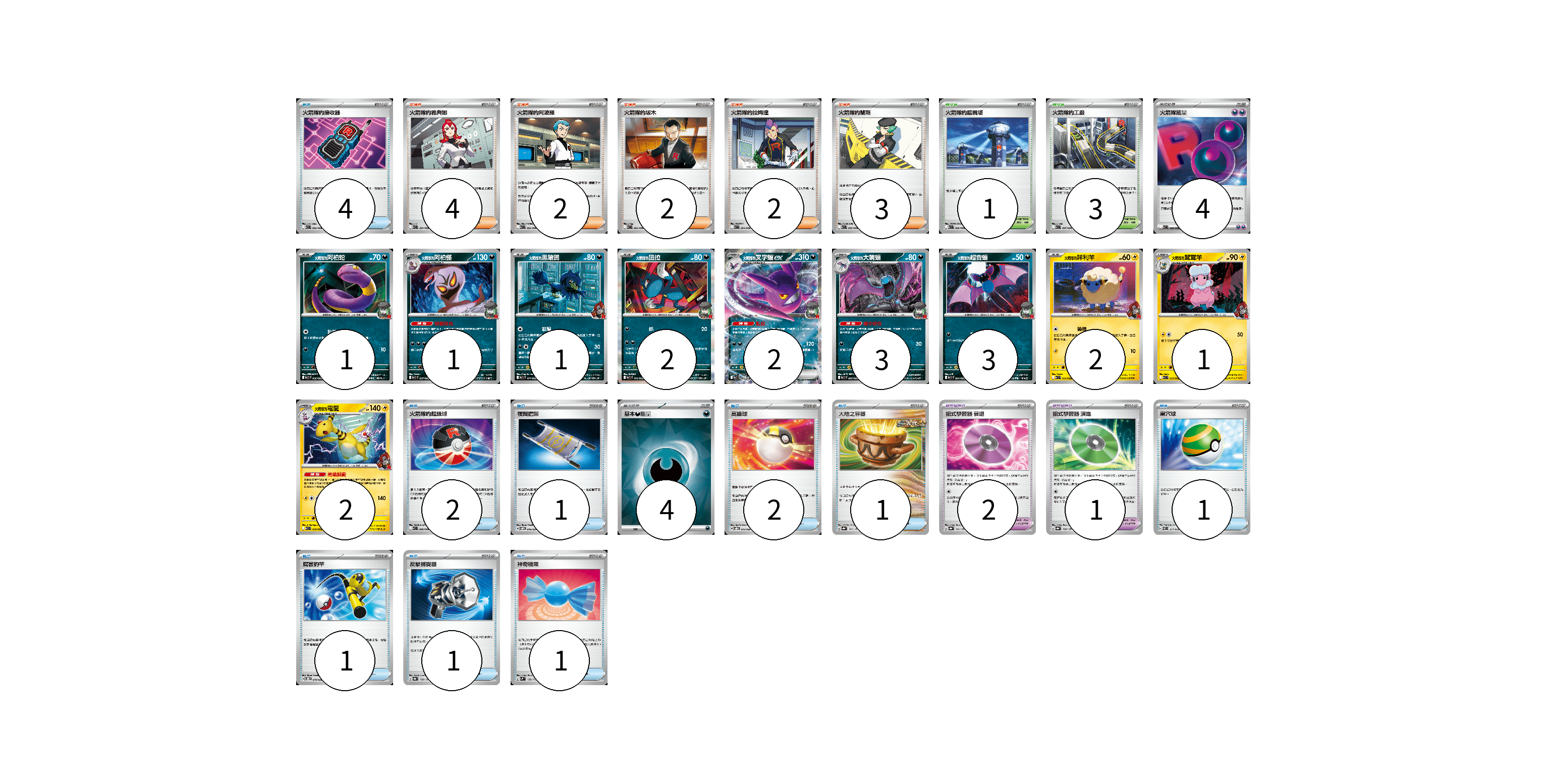 牌組構築方案 以此牌組為基礎新構築牌組 顯示卡面 顯示列表 寶可夢卡(18) 1 1 1 2 2 3 3 2 1 2 寶可夢道具(3) 2 1 物品卡(14) 4 2 1 2 1 1 1 1 1 支援者卡(13) 4 2 2 2 3 競技場卡(4) 1 3 能量卡(8) 4 4 寶可夢卡(18) 卡牌名稱 張數 卡牌名稱 張數 <火箭隊的>阿柏蛇 SV10 056/098 01 <火箭隊的>阿柏怪 SV10 057/098 01 <火箭隊的>黑暗鴉 SV10 071/098 01 <火箭隊的>狃拉 SV10 072/098 02 <火箭隊的>叉字蝠ex SV10 066/098 02 <火箭隊的>大嘴蝠 SV10 065/098 03 <火箭隊的>超音蝠 SV10 064/098 03 <火箭隊的>咩利羊 SV10 034/098 02 <火箭隊的>茸茸羊 SV10 035/098 01 <火箭隊的>電龍 SV10 036/098 02 寶可夢道具(3) 卡牌名稱 張數 卡牌名稱 張數 招式學習器 衰退 SV8a 161/187 02 招式學習器 演進 SV8a 160/187 01 物品卡(14) 卡牌名稱 張數 卡牌名稱 張數 火箭隊的接收器 SV10 090/098 04 火箭隊的超級球 SV10 088/098 02 夜間擔架 SVOM 016/021 01 高級球 SVOD 012/020 02 大地之容器 SV8a 143/187 01 巢穴球 SVEL 011/020 01 厲害釣竿 SVOD 010/020 01 反擊捕捉器 SV8a 139/187 01 神奇糖果 SVM 135/175 01 支援者卡(13) 卡牌名稱 張數 卡牌名稱 張數 火箭隊的雅典娜 SV10 091/098 04 火箭隊的阿波羅 SV10 092/098 02 火箭隊的坂木 SV10 093/098 02 火箭隊的拉姆達 SV10 094/098 02 火箭隊的蘭斯 SV10 095/098 03 競技場卡(4) 卡牌名稱 張數 卡牌名稱 張數 火箭隊的監視塔 SV10 096/098 01 火箭隊的工廠 SV10 097/098 03 能量卡(8) 卡牌名稱 張數 卡牌名稱 張數 火箭隊能量 SV10 098/098 04 基本【惡】能量 SVOM DAR 04 以此牌組為基礎新構築牌組 牌組編碼 fxxIGI-FXbpXj-LHPUbr copy 列印牌組單 牌組編碼已複製 分享至SNS