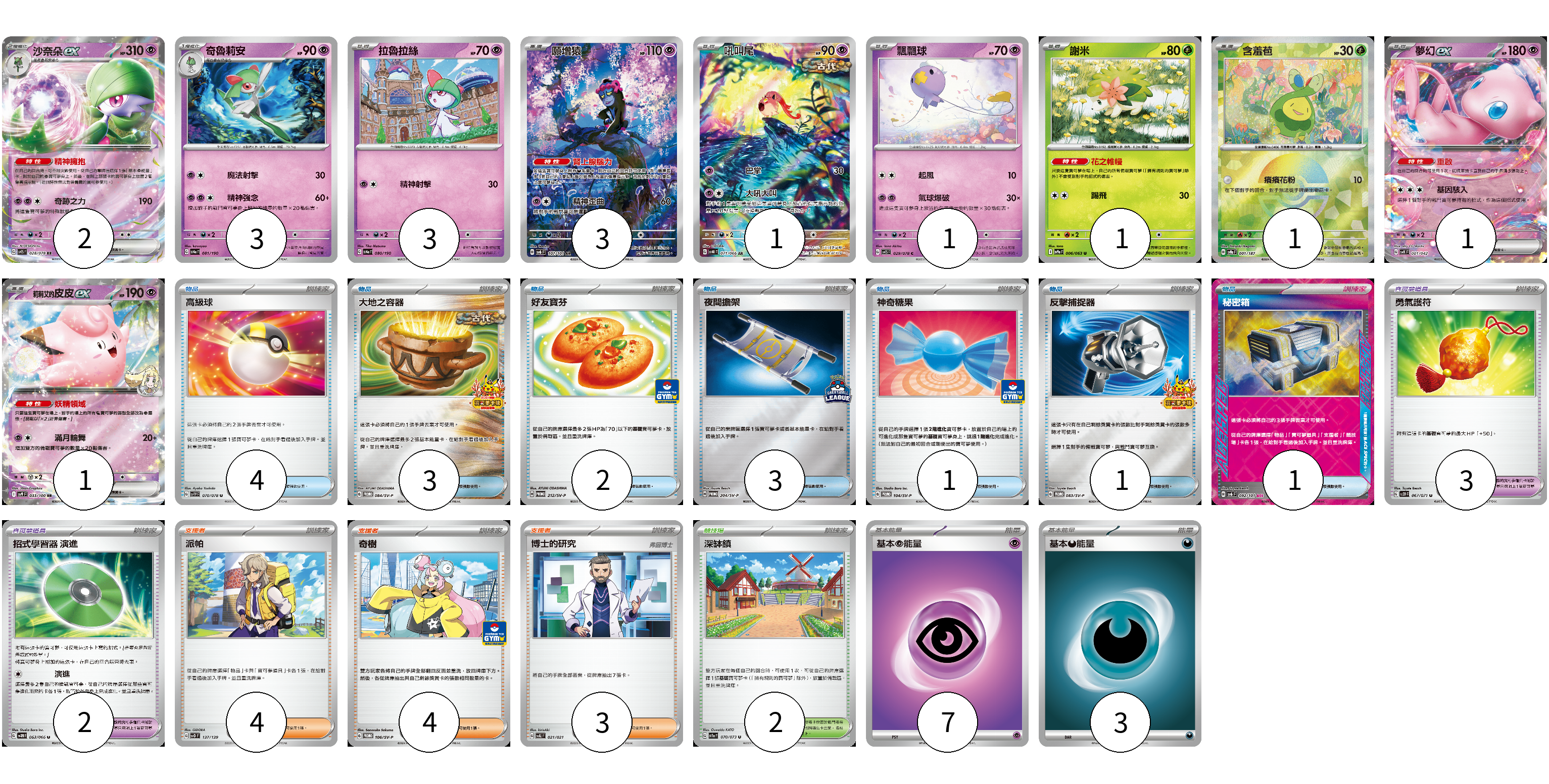 牌組構築方案 以此牌組為基礎新構築牌組 顯示卡面 顯示列表 寶可夢卡(17) 2 3 3 3 1 1 1 1 1 1 寶可夢道具(5) 3 2 物品卡(15) 4 3 2 3 1 1 1 支援者卡(11) 4 4 3 競技場卡(2) 2 能量卡(10) 7 3 寶可夢卡(17) 卡牌名稱 張數 卡牌名稱 張數 沙奈朵ex SV1S 028/078 02 奇魯莉安 SV4a 081/190 03 拉魯拉絲 SV4a 080/190 03 願增猿 SV6 107/101 03 吼叫尾 SV4K 071/066 01 飄飄球 SV1S 029/078 01 謝米 SV9a 006/063 01 含羞苞 SV8a 001/187 01 夢幻ex SVK 001/042 01 莉莉艾的皮皮ex SV9 033/100 01 寶可夢道具(5) 卡牌名稱 張數 卡牌名稱 張數 勇氣護符 SV2D 067/071 03 招式學習器 演進 SV4M 063/066 02 物品卡(15) 卡牌名稱 張數 卡牌名稱 張數 高級球 SV1V 070/078 04 大地之容器 SV-P 084/SV-P 03 好友寶芬 SV-P 212/SV-P 02 夜間擔架 SV-P 204/SV-P 03 神奇糖果 SV-P 104/SV-P 01 反擊捕捉器 SV-P 083/SV-P 01 秘密箱 SV6 092/101 01 支援者卡(11) 卡牌名稱 張數 卡牌名稱 張數 派帕 SVD 137/139 04 奇樹 SV-P 106/SV-P 04 博士的研究(弗圖博士) SVAL 021/021 03 競技場卡(2) 卡牌名稱 張數 卡牌名稱 張數 深缽鎮 SV1a 070/073 02 能量卡(10) 卡牌名稱 張數 卡牌名稱 張數 基本【超】能量 SVEM PSY 07 基本【惡】能量 SVF DAR 03 以此牌組為基礎新構築牌組 牌組編碼 fyxFNc-NzFnjs-hDYLZz copy 列印牌組單 牌組編碼已複製 分享至SNS