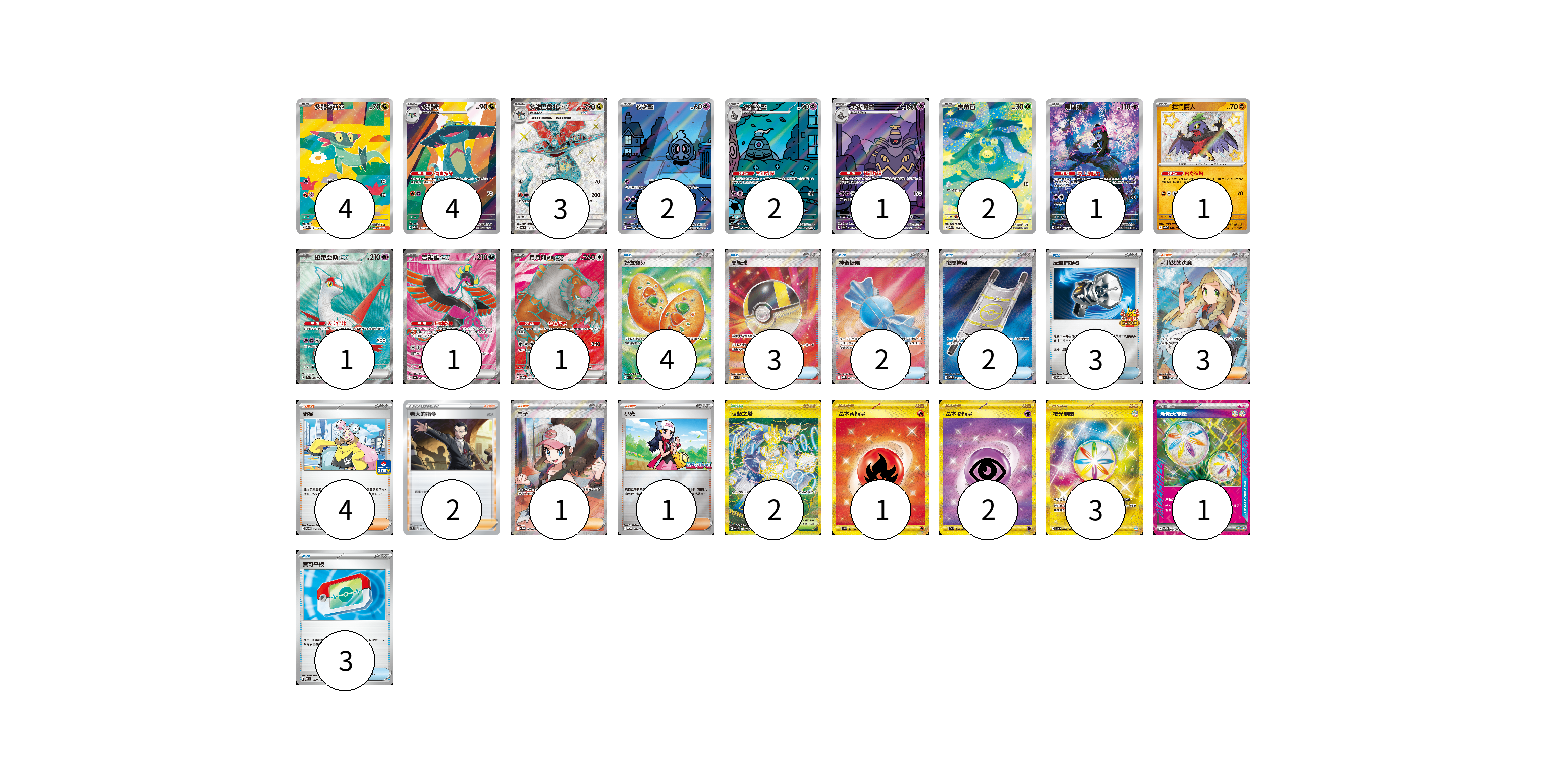 牌組構築方案 以此牌組為基礎新構築牌組 顯示卡面 顯示列表 寶可夢卡(23) 4 4 3 2 2 1 2 1 1 1 1 1 物品卡(17) 4 3 2 2 3 3 支援者卡(11) 3 4 2 1 1 競技場卡(2) 2 能量卡(7) 1 2 3 1 寶可夢卡(23) 卡牌名稱 張數 卡牌名稱 張數 多龍梅西亞 M2a 211/193 04 多龍奇 M2a 212/193 04 多龍巴魯托ex SV6 120/101 03 夜巡靈 SV6a 068/064 02 彷徨夜靈 SV6a 069/064 02 黑夜魔靈 SV6a 070/064 01 含羞苞 M2a 196/193 02 願增猿 SV6 107/101 01 摔角鷹人 SV4a 282/190 01 拉帝亞斯ex SV7a 078/064 01 吉雉雞ex SV6a 081/064 01 月月熊 赫月 ex SV5a 084/066 01 物品卡(17) 卡牌名稱 張數 卡牌名稱 張數 好友寶芬 M1S 081/063 04 高級球 M2a 216/193 03 神奇糖果 M1S 082/063 02 夜間擔架 M1L 083/063 02 反擊捕捉器 SV-P 083/SV-P 03 寶可平板 MC 662/742 03 支援者卡(11) 卡牌名稱 張數 卡牌名稱 張數 莉莉艾的決意 M1L 086/063 03 奇樹 SV-P 106/SV-P 04 老大的指令(坂木) SC1D 161/164 02 鬥子 SV11W 166/086 01 小光 M-P 028/M-P 01 競技場卡(2) 卡牌名稱 張數 卡牌名稱 張數 阻礙之塔 SV10 132/098 02 能量卡(7) 卡牌名稱 張數 卡牌名稱 張數 基本【火】能量 SV3 141/108 01 基本【超】能量 SV2a 210/165 02 夜光能量 SV5a 096/066 03 新衝天能量 SV5K 071/071 01 以此牌組為基礎新構築牌組 牌組編碼 gAxBQW-ahMILd-MrElBF copy 列印牌組單 牌組編碼已複製 分享至SNS
