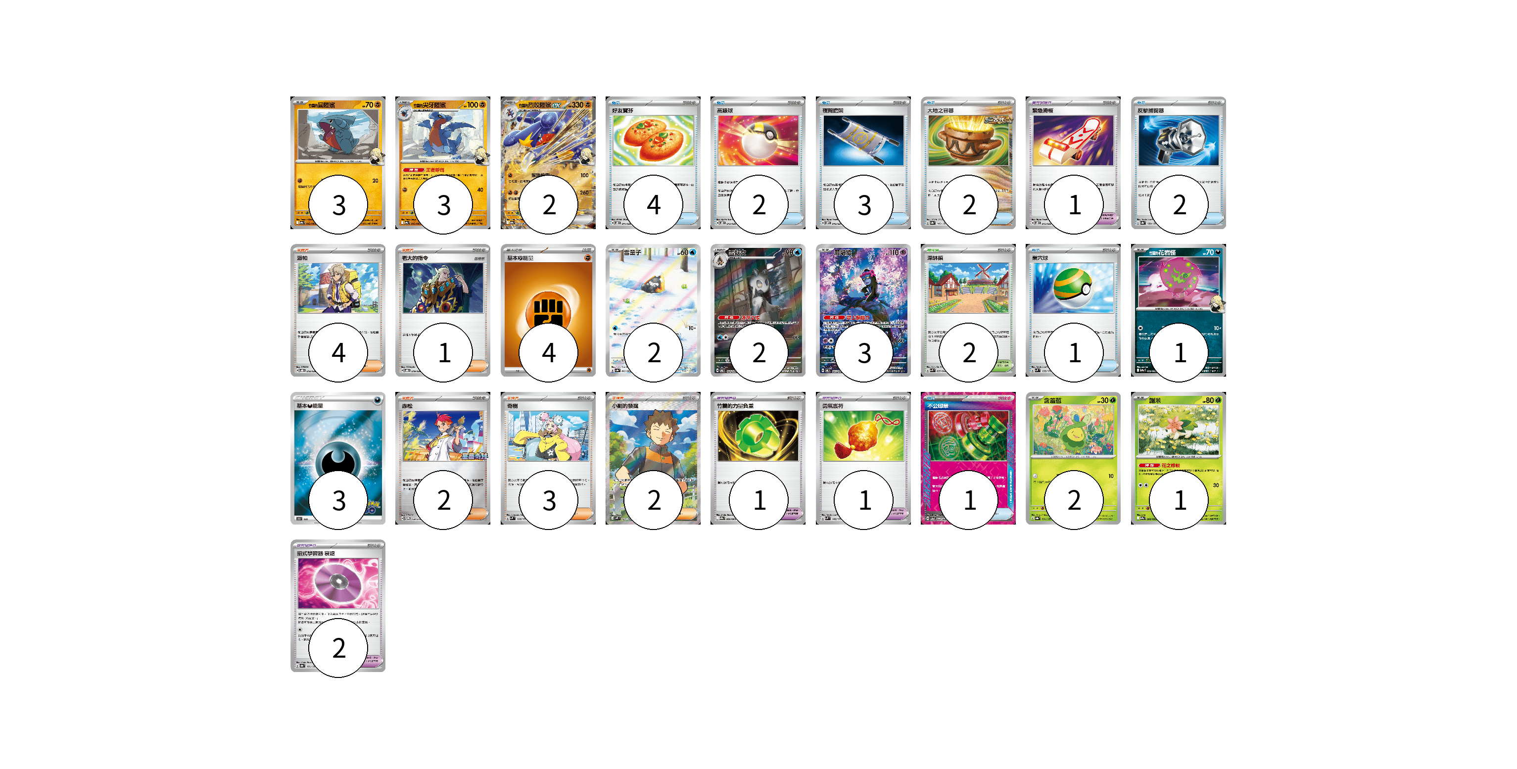 牌組構築方案 以此牌組為基礎新構築牌組 顯示卡面 顯示列表 寶可夢卡(19) 3 3 2 2 2 3 1 2 1 寶可夢道具(5) 1 1 1 2 物品卡(15) 4 2 3 2 2 1 1 支援者卡(12) 4 1 2 3 2 競技場卡(2) 2 能量卡(7) 4 3 寶可夢卡(19) 卡牌名稱 張數 卡牌名稱 張數 <竹蘭的>圓陸鯊 SV9a 042/063 03 <竹蘭的>尖牙陸鯊 SV9a 043/063 03 <竹蘭的>烈咬陸鯊ex SV9a 044/063 02 雪童子 SV3a 063/062 02 雪妖女 SV6 104/101 02 願增猿 SV6 107/101 03 <竹蘭的>花岩怪 SV9a 050/063 01 含羞苞 SV8a 001/187 02 謝米 SV9a 006/063 01 寶可夢道具(5) 卡牌名稱 張數 卡牌名稱 張數 緊急滑板 SVOD 015/020 01 竹蘭的力量負重 SV9a 060/063 01 勇氣護符 SVM 142/175 01 招式學習器 衰退 SV8a 161/187 02 物品卡(15) 卡牌名稱 張數 卡牌名稱 張數 好友寶芬 SVOD 011/020 04 高級球 SVOD 012/020 02 夜間擔架 SVOM 016/021 03 大地之容器 SV8a 143/187 02 反擊捕捉器 SV8a 139/187 02 巢穴球 SVM 133/175 01 不公印章 SV5a 053/066 01 支援者卡(12) 卡牌名稱 張數 卡牌名稱 張數 派帕 SVOD 018/020 04 老大的指令 SVOD 019/020 01 赤松 SV-P 150/SV-P 02 奇樹 SVM 160/175 03 小剛的發掘 SV9 123/100 02 競技場卡(2) 卡牌名稱 張數 卡牌名稱 張數 深缽鎮 SVK 039/042 02 能量卡(7) 卡牌名稱 張數 卡牌名稱 張數 基本鬥能量 sv-p FIG 04 基本惡能量 S10b DAR 03 以此牌組為基礎新構築牌組 牌組編碼 gBNBWq-gLlvXs-dcITCc copy 列印牌組單 牌組編碼已複製 分享至SNS