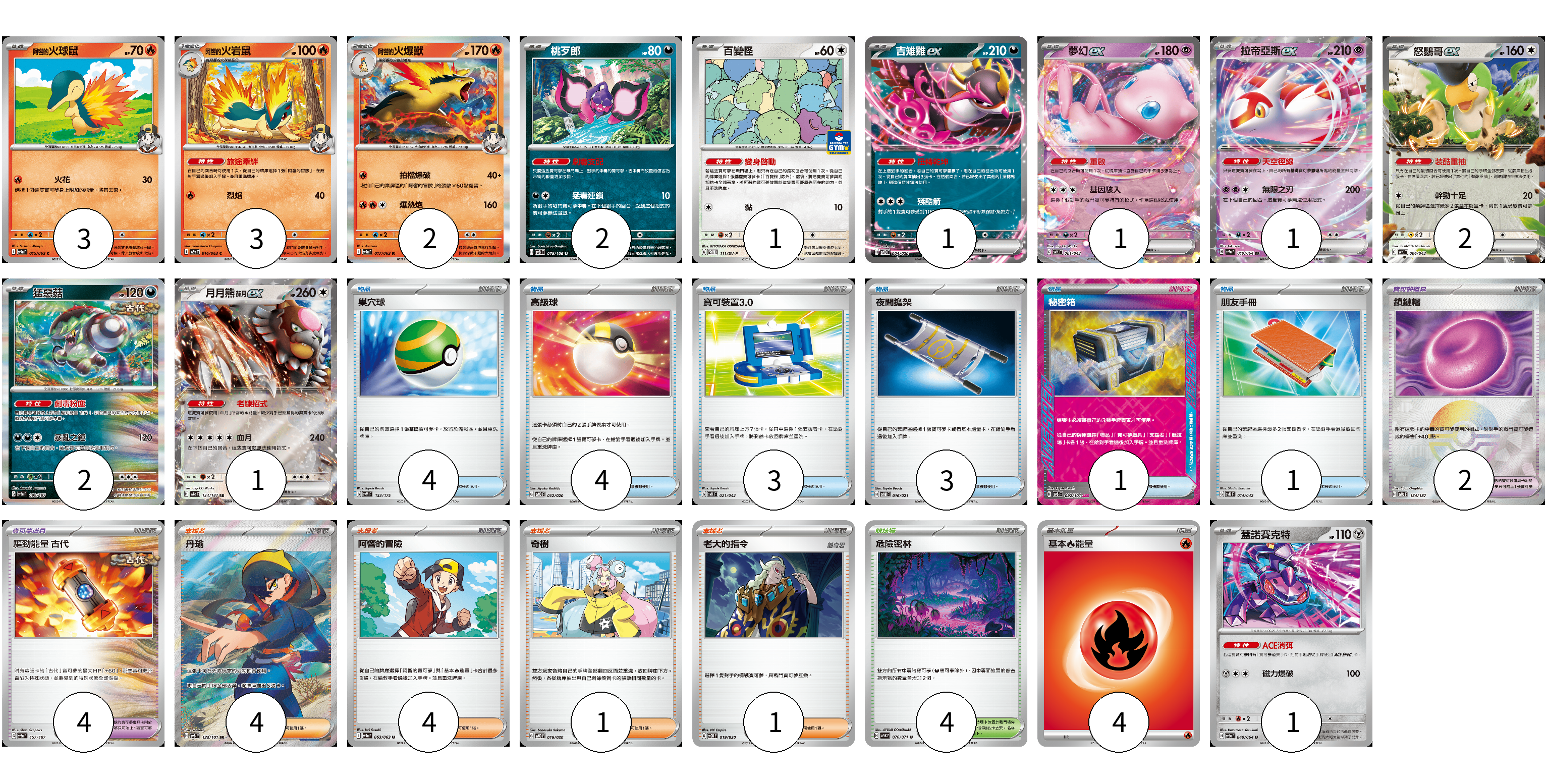 牌組構築方案 以此牌組為基礎新構築牌組 顯示卡面 顯示列表 寶可夢卡(20) 3 3 2 2 1 1 1 1 2 2 1 1 寶可夢道具(6) 2 4 物品卡(16) 4 4 3 3 1 1 支援者卡(10) 4 4 1 1 競技場卡(4) 4 能量卡(4) 4 寶可夢卡(20) 卡牌名稱 張數 卡牌名稱 張數 <阿響的>火球鼠 SV9a 015/063 03 <阿響的>火岩鼠 SV9a 016/063 03 <阿響的>火爆獸 SV9a 017/063 02 桃歹郎 SV8 075/106 02 百變怪 SV-P 111/SV-P 01 吉雉雞ex SVOD 004/020 01 夢幻ex SVK 001/042 01 拉帝亞斯ex SV7a 019/064 01 怒鸚哥ex SVK 006/042 02 猛惡菇 SV8a 099/187 02 月月熊 赫月ex SV8a 134/187 01 蓋諾賽克特 SV6a 040/064 01 寶可夢道具(6) 卡牌名稱 張數 卡牌名稱 張數 鎖鏈糬 SV8a 154/187 02 驅勁能量 古代 SV8a 157/187 04 物品卡(16) 卡牌名稱 張數 卡牌名稱 張數 巢穴球 SVM 133/175 04 高級球 SVOD 012/020 04 寶可裝置3.0 SVK 021/042 03 夜間擔架 SVOM 016/021 03 秘密箱 SV6 092/101 01 朋友手冊 SVK 014/042 01 支援者卡(10) 卡牌名稱 張數 卡牌名稱 張數 丹瑜 SV6 123/101 04 阿響的冒險 SV9a 063/063 04 奇樹 SVOD 016/020 01 老大的指令 SVOD 019/020 01 競技場卡(4) 卡牌名稱 張數 卡牌名稱 張數 危險密林 SV5K 070/071 04 能量卡(4) 卡牌名稱 張數 卡牌名稱 張數 基本火能量 sv-p FIR 04 以此牌組為基礎新構築牌組 牌組編碼 gBmmRP-TBsRhF-YcGXiH copy 列印牌組單 牌組編碼已複製 分享至SNS