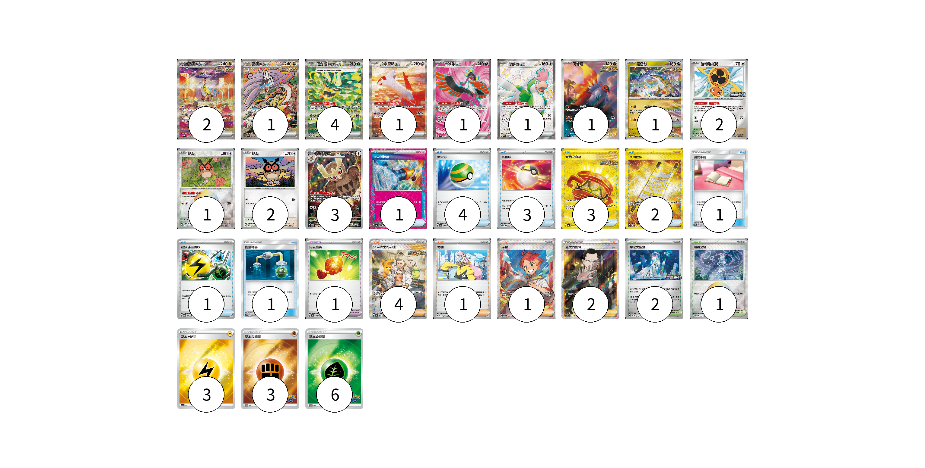 牌組構築方案 以此牌組為基礎新構築牌組 顯示卡面 顯示列表 寶可夢卡(20) 2 1 4 1 1 1 1 1 2 1 2 3 寶可夢道具(1) 1 物品卡(16) 1 4 3 3 2 1 1 1 支援者卡(8) 4 1 1 2 競技場卡(3) 2 1 能量卡(12) 3 3 6 寶可夢卡(20) 卡牌名稱 張數 卡牌名稱 張數 猛雷鼓ex SV5K 095/071 02 猛雷鼓ex SV8a 222/187 01 厄鬼椪 碧草面具ex SV6 125/101 04 拉帝亞斯ex SV7a 087/064 01 吉雉雞ex SV6a 081/064 01 怒鸚哥ex SV4a 337/190 01 爬地翅 SV4K 074/066 01 猛雷鼓 SV7 075/102 01 旋轉洛托姆 SV-P 146/SV-P 02 咕咕 SV8a 127/187 01 咕咕 SV7 076/102 02 貓頭夜鷹 SV7 114/102 03 寶可夢道具(1) 卡牌名稱 張數 卡牌名稱 張數 勇氣護符 SVM 142/175 01 物品卡(16) 卡牌名稱 張數 卡牌名稱 張數 頂尖捕捉器 SV8a 148/187 01 巢穴球 SVM 133/175 04 高級球 SVOD 012/020 03 大地之容器 SV6a 093/064 03 夜間擔架 SV8 137/106 02 朋友手冊 AS6b 188/194 01 超級能量回收 SV8a 141/187 01 能量轉移 AS6D 142/168 01 支援者卡(8) 卡牌名稱 張數 卡牌名稱 張數 奧琳博士的氣魄 SV4K 091/066 04 奇樹 SVOD 016/020 01 赤松 SV7 123/102 01 老大的指令(坂木) SC1b 170/153 02 競技場卡(3) 卡牌名稱 張數 卡牌名稱 張數 零之大空洞 SV-P 151/SV-P 02 阻礙之塔 SV8a 181/187 01 能量卡(12) 卡牌名稱 張數 卡牌名稱 張數 基本【雷】能量 SO LIG 03 基本鬥能量 S10b FIG 03 基本草能量 S10b GRA 06 以此牌組為基礎新構築牌組 牌組編碼 gByFSc-djdbjJ-chvRUk copy 列印牌組單 牌組編碼已複製 分享至SNS