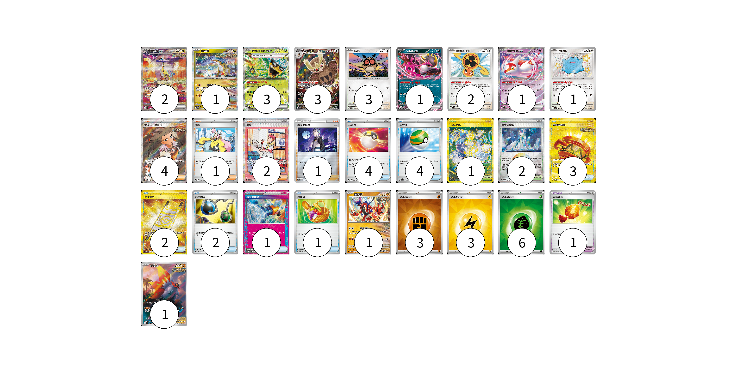 牌組構築方案 以此牌組為基礎新構築牌組 顯示卡面 顯示列表 寶可夢卡(19) 2 1 3 3 3 1 2 1 1 1 1 寶可夢道具(1) 1 物品卡(17) 4 4 3 2 2 1 1 支援者卡(8) 4 1 2 1 競技場卡(3) 1 2 能量卡(12) 3 3 6 寶可夢卡(19) 卡牌名稱 張數 卡牌名稱 張數 猛雷鼓ex SV5K 095/071 02 猛雷鼓 SV7 075/102 01 厄鬼椪 碧草面具ex SV8a 020/187 03 貓頭夜鷹 SV7 114/102 03 咕咕 SV7 076/102 03 吉雉雞ex SVOD 004/020 01 旋轉洛托姆 SV8a 131/187 02 拉帝亞斯ex SV7a 019/064 01 百變怪 SV4a 309/190 01 故勒頓 SV8 069/106 01 爬地翅 SV4K 074/066 01 寶可夢道具(1) 卡牌名稱 張數 卡牌名稱 張數 勇氣護符 SVTR 015/021 01 物品卡(17) 卡牌名稱 張數 卡牌名稱 張數 高級球 SVOD 012/020 04 巢穴球 SVM 133/175 04 大地之容器 SV6a 093/064 03 夜間擔架 SV8 137/106 02 能量回收 SVTM 009/022 02 頂尖捕捉器 SV8a 148/187 01 野餐籃 SV1V 071/078 01 支援者卡(8) 卡牌名稱 張數 卡牌名稱 張數 奧琳博士的氣魄 SV4K 085/066 04 奇樹 SVOD 016/020 01 赤松 SV8a 227/187 02 老大的指令(赤日) SO 028/030 01 競技場卡(3) 卡牌名稱 張數 卡牌名稱 張數 阻礙之塔 SV10 132/098 01 零之大空洞 SV8a 182/187 02 能量卡(12) 卡牌名稱 張數 卡牌名稱 張數 基本【鬥】能量 SVM FIG 03 基本【雷】能量 SVM LIG 03 基本【草】能量 SVM GRA 06 以此牌組為基礎新構築牌組 牌組編碼 gCiLnm-KtljsN-NwvtOy copy 列印牌組單 牌組編碼已複製 分享至SNS