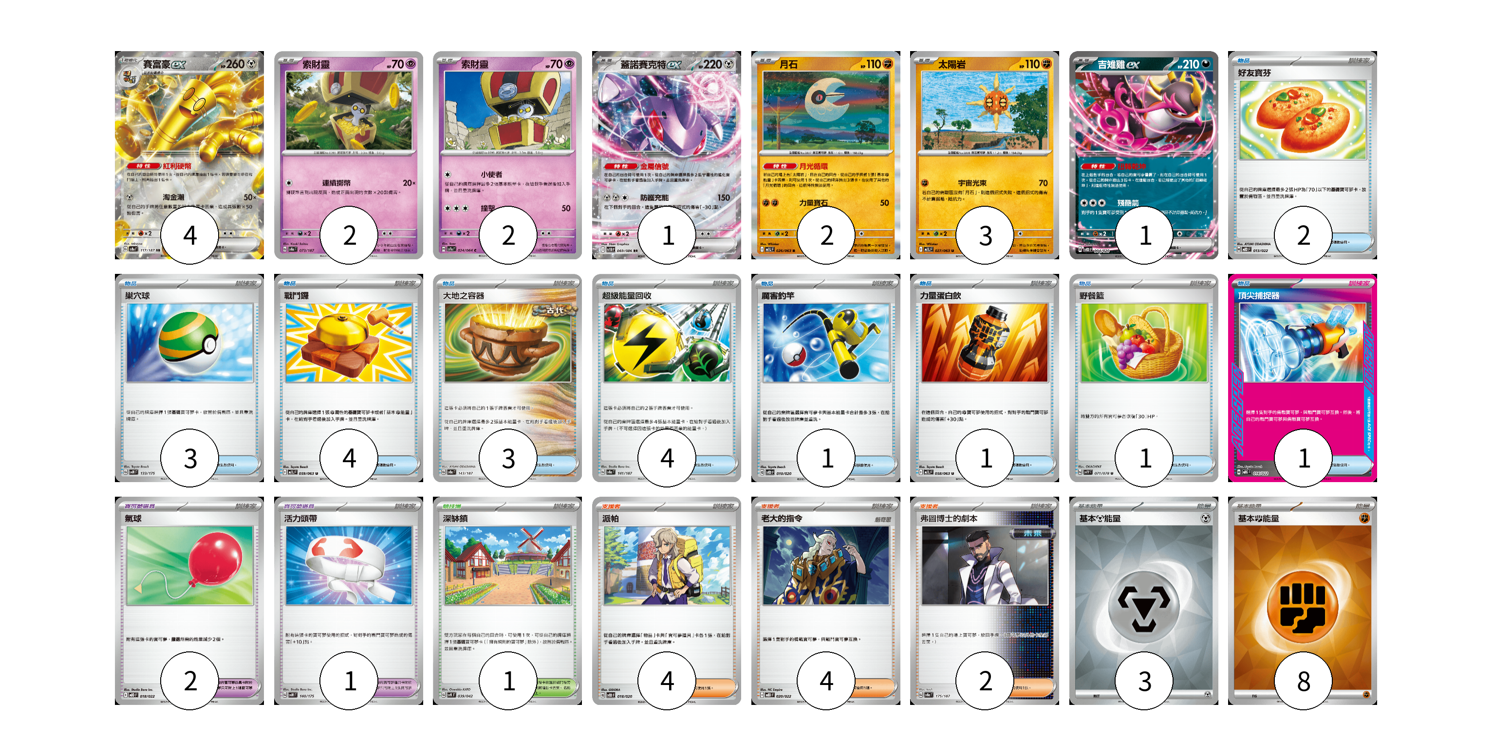牌組構築方案 以此牌組為基礎新構築牌組 顯示卡面 顯示列表 寶可夢卡(15) 4 2 2 1 2 3 1 寶可夢道具(3) 2 1 物品卡(20) 2 3 4 3 4 1 1 1 1 支援者卡(10) 4 4 2 競技場卡(1) 1 能量卡(11) 3 8 寶可夢卡(15) 卡牌名稱 張數 卡牌名稱 張數 賽富豪ex SV8a 117/187 04 索財靈 SV8a 073/187 02 索財靈 SV7a 024/064 02 蓋諾賽克特ex SV11B 069/086 01 月石 M1L 026/063 02 太陽岩 M1L 027/063 03 吉雉雞ex SVOD 004/020 01 寶可夢道具(3) 卡牌名稱 張數 卡牌名稱 張數 氣球 MBD 018/022 02 活力頭帶 SVM 140/175 01 物品卡(20) 卡牌名稱 張數 卡牌名稱 張數 好友寶芬 MBD 013/022 02 巢穴球 SVM 133/175 03 戰鬥鑼 M1L 059/063 04 大地之容器 SV8a 143/187 03 超級能量回收 SV8a 141/187 04 厲害釣竿 SVOD 010/020 01 力量蛋白飲 M1L 058/063 01 野餐籃 SV1V 071/078 01 頂尖捕捉器 MBG 014/022 01 支援者卡(10) 卡牌名稱 張數 卡牌名稱 張數 派帕 SVOD 018/020 04 老大的指令 MBD 020/022 04 弗圖博士的劇本 SV8a 175/187 02 競技場卡(1) 卡牌名稱 張數 卡牌名稱 張數 深缽鎮 SVK 039/042 01 能量卡(11) 卡牌名稱 張數 卡牌名稱 張數 基本【鋼】能量 SVOD MET 03 基本【鬥】能量 SVM FIG 08 以此牌組為基礎新構築牌組 牌組編碼 gDSZUH-sZPJhC-KqYPHW copy 列印牌組單 牌組編碼已複製 分享至SNS