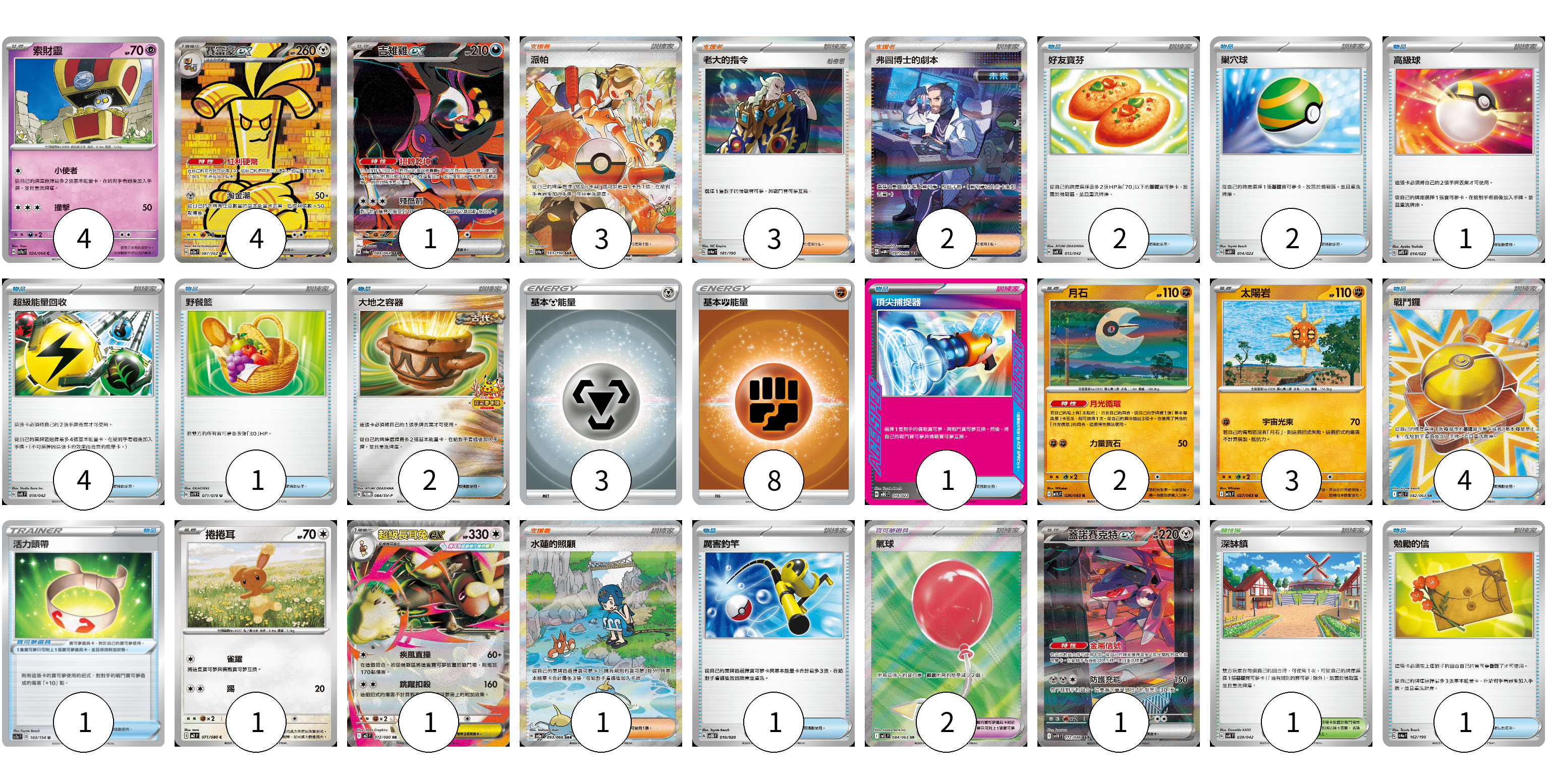 牌組構築方案 以此牌組為基礎新構築牌組 顯示卡面 顯示列表 寶可夢卡(17) 4 4 1 2 3 1 1 1 寶可夢道具(3) 1 2 物品卡(19) 2 2 1 4 1 2 1 4 1 1 支援者卡(9) 3 3 2 1 競技場卡(1) 1 能量卡(11) 3 8 寶可夢卡(17) 卡牌名稱 張數 卡牌名稱 張數 索財靈 SV7a 024/064 04 賽富豪ex SV3a 087/062 04 吉雉雞ex SV6a 089/064 01 月石 M1L 026/063 02 太陽岩 M1L 027/063 03 捲捲耳 M2 071/080 01 超級長耳兔ex M2 072/080 01 蓋諾賽克特ex SV11B 172/086 01 寶可夢道具(3) 卡牌名稱 張數 卡牌名稱 張數 活力頭帶 SC1a 143/154 01 氣球 M1L 084/063 02 物品卡(19) 卡牌名稱 張數 卡牌名稱 張數 好友寶芬 SVK 015/042 02 巢穴球 SVAW 014/023 02 高級球 SVTS 014/022 01 超級能量回收 SVK 010/042 04 野餐籃 SV1V 071/078 01 大地之容器 SV-P 084/SV-P 02 頂尖捕捉器 MBG 014/022 01 戰鬥鑼 M1L 082/063 04 厲害釣竿 SVOD 010/020 01 勉勵的信 SV4a 162/190 01 支援者卡(9) 卡牌名稱 張數 卡牌名稱 張數 派帕 SV4a 353/190 03 老大的指令 SV4a 181/190 03 弗圖博士的劇本 SV4M 091/066 02 水蓮的照顧 SV5a 093/066 01 競技場卡(1) 卡牌名稱 張數 卡牌名稱 張數 深缽鎮 SVK 039/042 01 能量卡(11) 卡牌名稱 張數 卡牌名稱 張數 基本【鋼】能量 SI MET 03 基本【鬥】能量 SI FIG 08 以此牌組為基礎新構築牌組 牌組編碼 gDbayx-pWnxcX-flIkhp copy 列印牌組單 牌組編碼已複製 分享至SNS