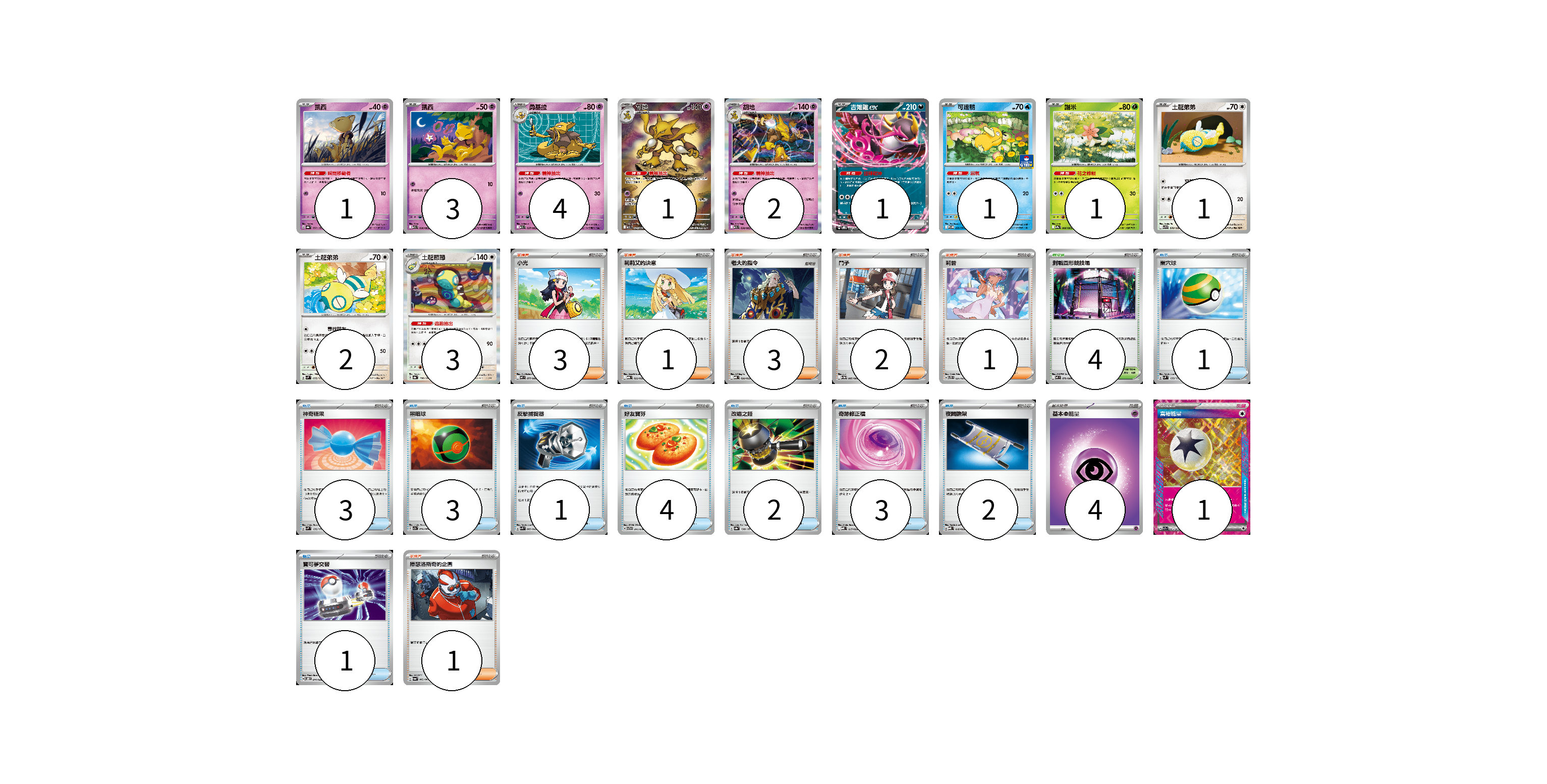牌組構築方案 以此牌組為基礎新構築牌組 顯示卡面 顯示列表 寶可夢卡(20) 1 3 4 1 2 1 1 1 1 2 3 物品卡(20) 1 3 3 1 4 2 3 2 1 支援者卡(11) 3 1 3 2 1 1 競技場卡(4) 4 能量卡(5) 4 1 寶可夢卡(20) 卡牌名稱 張數 卡牌名稱 張數 凱西 SV8a 057/187 01 凱西 M1S 036/063 03 勇基拉 M1S 037/063 04 胡地 M1S 071/063 01 胡地 M1S 038/063 02 吉雉雞ex SVOD 004/020 01 可達鴨 SV-P 220/SV-P 01 謝米 SV9a 006/063 01 土龍弟弟 SV9 078/100 01 土龍弟弟 SVM 095/175 02 土龍節節 SV8a 130/187 03 物品卡(20) 卡牌名稱 張數 卡牌名稱 張數 巢穴球 SVM 133/175 01 神奇糖果 SVM 135/175 03 黑暗球 SV7a 054/064 03 反擊捕捉器 SVK 009/042 01 好友寶芬 SVTG 011/019 04 改造之錘 SV8a 138/187 02 奇跡修正檔 MBD 017/022 03 夜間擔架 MBD 016/022 02 寶可夢交替 SVOD 014/020 01 支援者卡(11) 卡牌名稱 張數 卡牌名稱 張數 小光 M2 077/080 03 莉莉艾的決意 MBG 022/022 01 老大的指令 MBD 020/022 03 鬥子 SV11W 085/086 02 莉普 SVTS 021/022 01 庫瑟洛斯奇的企圖 SV6a 062/064 01 競技場卡(4) 卡牌名稱 張數 卡牌名稱 張數 對戰圓形競技場 M2 079/080 04 能量卡(5) 卡牌名稱 張數 卡牌名稱 張數 基本【超】能量 M-P PSY 04 富裕能量 SV7a 064/064 01 以此牌組為基礎新構築牌組 牌組編碼 gDeQrC-fXRhEV-JkOuTQ copy 列印牌組單 牌組編碼已複製 分享至SNS