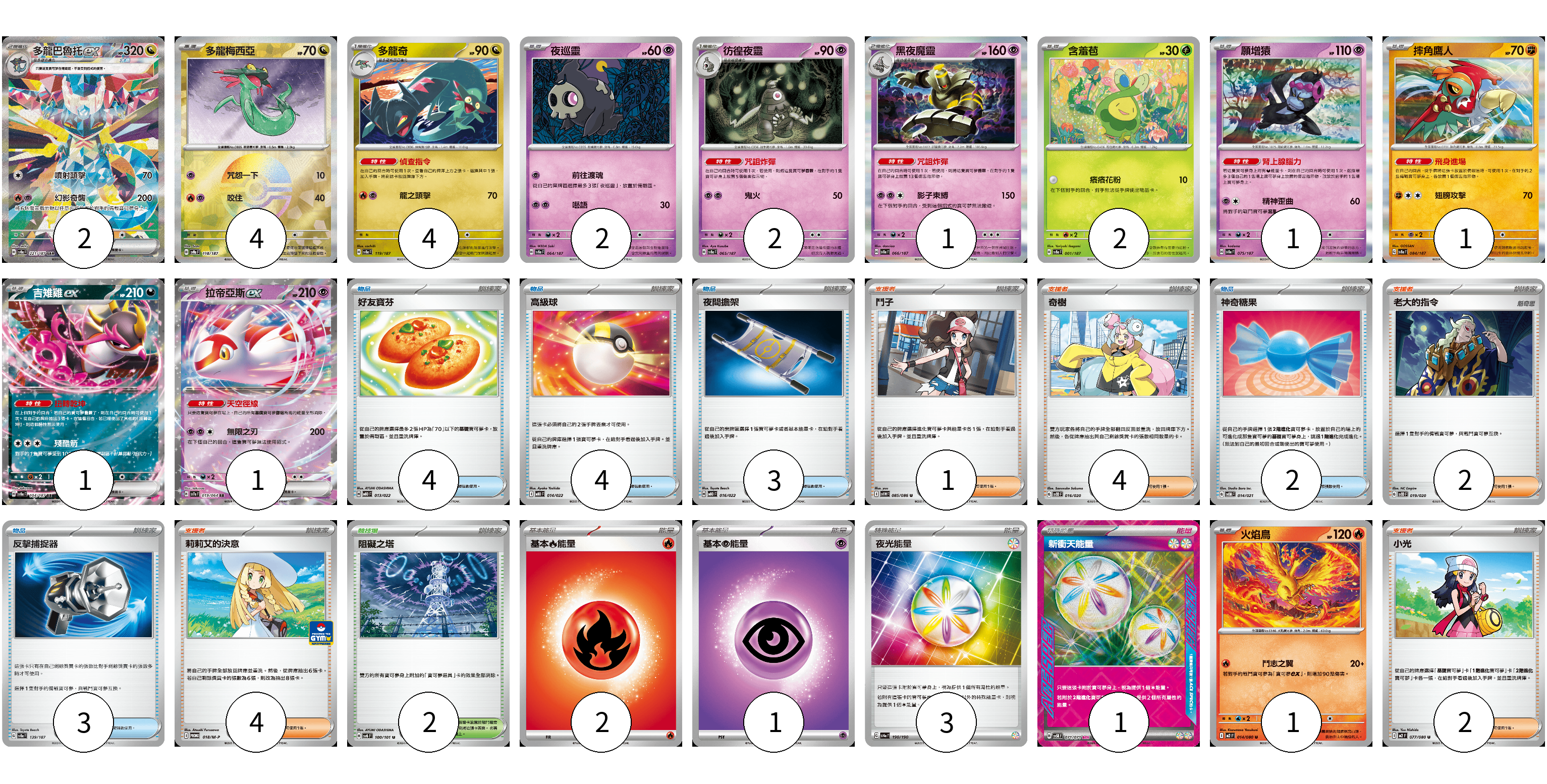 牌組構築方案 以此牌組為基礎新構築牌組 顯示卡面 顯示列表 寶可夢卡(22) 2 4 4 2 2 1 2 1 1 1 1 1 物品卡(16) 4 4 3 2 3 支援者卡(13) 1 4 2 4 2 競技場卡(2) 2 能量卡(7) 2 1 3 1 寶可夢卡(22) 卡牌名稱 張數 卡牌名稱 張數 多龍巴魯托ex SV8a 221/187 02 多龍梅西亞 SV8a 118/187 04 多龍奇 SV8a 119/187 04 夜巡靈 SV8a 064/187 02 彷徨夜靈 SV8a 065/187 02 黑夜魔靈 SV8a 066/187 01 含羞苞 SV8a 001/187 02 願增猿 SV8a 075/187 01 摔角鷹人 SV8a 084/187 01 吉雉雞ex SV8a 104/187 01 拉帝亞斯ex SV7a 019/064 01 火焰鳥 M2 014/080 01 物品卡(16) 卡牌名稱 張數 卡牌名稱 張數 好友寶芬 MBD 013/022 04 高級球 MBD 014/022 04 夜間擔架 MBD 016/022 03 神奇糖果 SVOM 014/021 02 反擊捕捉器 SV8a 139/187 03 支援者卡(13) 卡牌名稱 張數 卡牌名稱 張數 鬥子 SV11W 085/086 01 奇樹 SVOD 016/020 04 老大的指令 SVOD 019/020 02 莉莉艾的決意 M-P 018/M-P 04 小光 M2 077/080 02 競技場卡(2) 卡牌名稱 張數 卡牌名稱 張數 阻礙之塔 SV6 100/101 02 能量卡(7) 卡牌名稱 張數 卡牌名稱 張數 基本【火】能量 M-P FIR 02 基本【超】能量 MBD PSY 01 夜光能量 SV4a 190/190 03 新衝天能量 SV5K 071/071 01 以此牌組為基礎新構築牌組 牌組編碼 gEGGoW-XDNyPL-MbRmvA copy 列印牌組單 牌組編碼已複製 分享至SNS