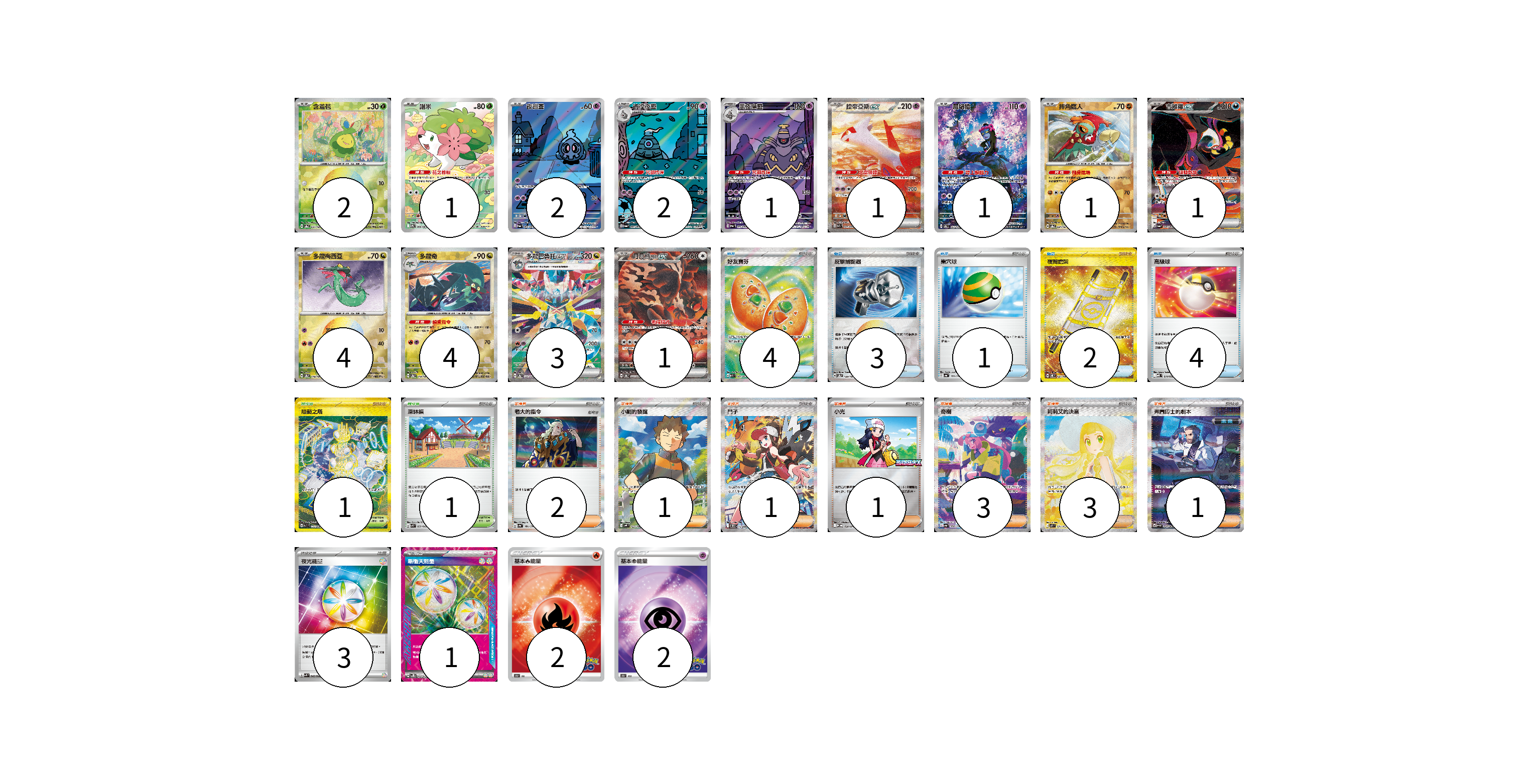 牌組構築方案 以此牌組為基礎新構築牌組 顯示卡面 顯示列表 寶可夢卡(24) 2 1 2 2 1 1 1 1 1 4 4 3 1 物品卡(14) 4 3 1 2 4 支援者卡(12) 2 1 1 1 3 3 1 競技場卡(2) 1 1 能量卡(8) 3 1 2 2 寶可夢卡(24) 卡牌名稱 張數 卡牌名稱 張數 含羞苞 SV8a 001/187 02 謝米 SV9a 066/063 01 夜巡靈 SV6a 068/064 02 彷徨夜靈 SV6a 069/064 02 黑夜魔靈 SV6a 070/064 01 拉帝亞斯ex SV7a 087/064 01 願增猿 SV6 107/101 01 摔角鷹人 SV8a 084/187 01 吉雉雞ex SV6a 089/064 01 多龍梅西亞 SV8a 118/187 04 多龍奇 SV8a 119/187 04 多龍巴魯托ex SV8a 221/187 03 月月熊 赫月ex SV8a 225/187 01 物品卡(14) 卡牌名稱 張數 卡牌名稱 張數 好友寶芬 M1S 081/063 04 反擊捕捉器 SV8a 139/187 03 巢穴球 SV4a 159/190 01 夜間擔架 SV8 137/106 02 高級球 MBD 014/022 04 支援者卡(12) 卡牌名稱 張數 卡牌名稱 張數 老大的指令 SV4a 181/190 02 小剛的發掘 SV9 123/100 01 鬥子 SV11W 173/086 01 小光 M-P 028/M-P 01 奇樹 SV4a 350/190 03 莉莉艾的決意 M1L 091/063 03 弗圖博士的劇本 SV4M 091/066 01 競技場卡(2) 卡牌名稱 張數 卡牌名稱 張數 阻礙之塔 SV10 132/098 01 深缽鎮 SVK 039/042 01 能量卡(8) 卡牌名稱 張數 卡牌名稱 張數 夜光能量 SVK 042/042 03 新衝天能量 SV5K 071/071 01 基本火能量 S10b FIR 02 基本超能量 S10b PSY 02 以此牌組為基礎新構築牌組 牌組編碼 gGlpjx-PIZqBP-mgsIxd copy 列印牌組單 牌組編碼已複製 分享至SNS
