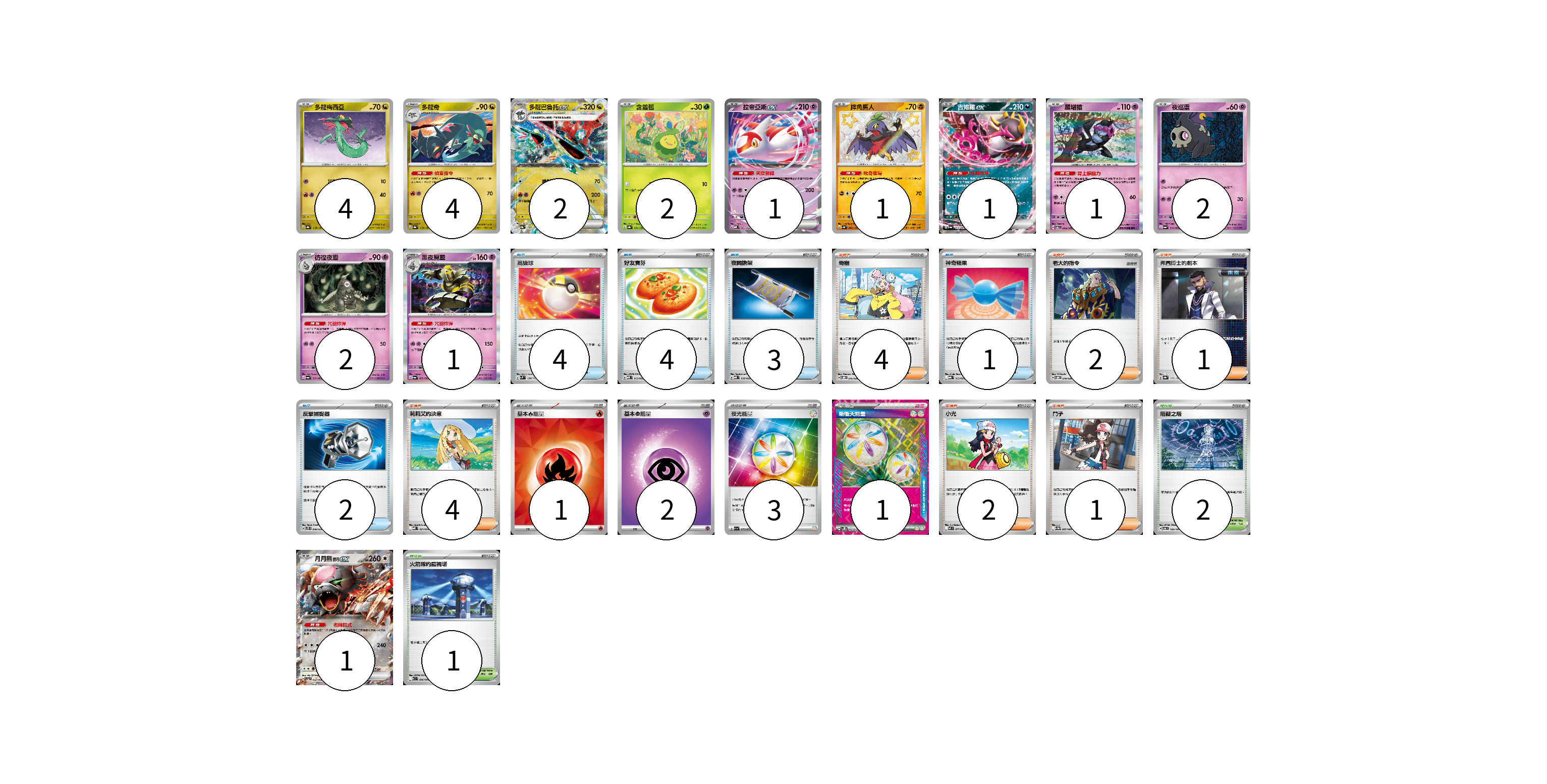 牌組構築方案 以此牌組為基礎新構築牌組 顯示卡面 顯示列表 寶可夢卡(22) 4 4 2 2 1 1 1 1 2 2 1 1 物品卡(14) 4 4 3 1 2 支援者卡(14) 4 2 1 4 2 1 競技場卡(3) 2 1 能量卡(7) 1 2 3 1 寶可夢卡(22) 卡牌名稱 張數 卡牌名稱 張數 多龍梅西亞 SV8a 118/187 04 多龍奇 SV8a 119/187 04 多龍巴魯托ex SV8a 120/187 02 含羞苞 SV8a 001/187 02 拉帝亞斯ex MBD 003/022 01 摔角鷹人 SV4a 282/190 01 吉雉雞ex SV6a 038/064 01 願增猿 SV6 055/101 01 夜巡靈 SV6a 018/064 02 彷徨夜靈 SV6a 019/064 02 黑夜魔靈 SV6a 020/064 01 月月熊 赫月 ex SV5a 052/066 01 物品卡(14) 卡牌名稱 張數 卡牌名稱 張數 高級球 SVM 134/175 04 好友寶芬 MBD 013/022 04 夜間擔架 MBD 016/022 03 神奇糖果 MBG 013/022 01 反擊捕捉器 SVTS 009/022 02 支援者卡(14) 卡牌名稱 張數 卡牌名稱 張數 奇樹 SVOD 016/020 04 老大的指令 SVOD 019/020 02 弗圖博士的劇本 SV8a 175/187 01 莉莉艾的決意 MBD 021/022 04 小光 M2 077/080 02 鬥子 SV11W 085/086 01 競技場卡(3) 卡牌名稱 張數 卡牌名稱 張數 阻礙之塔 SV6 100/101 02 火箭隊的監視塔 SV10 096/098 01 能量卡(7) 卡牌名稱 張數 卡牌名稱 張數 基本【火】能量 SVQL FIR 01 基本【超】能量 MBD PSY 02 夜光能量 SV1a 073/073 03 新衝天能量 SV5K 071/071 01 以此牌組為基礎新構築牌組 牌組編碼 gHLqZP-FxGquU-jZljYh copy 列印牌組單 牌組編碼已複製 分享至SNS