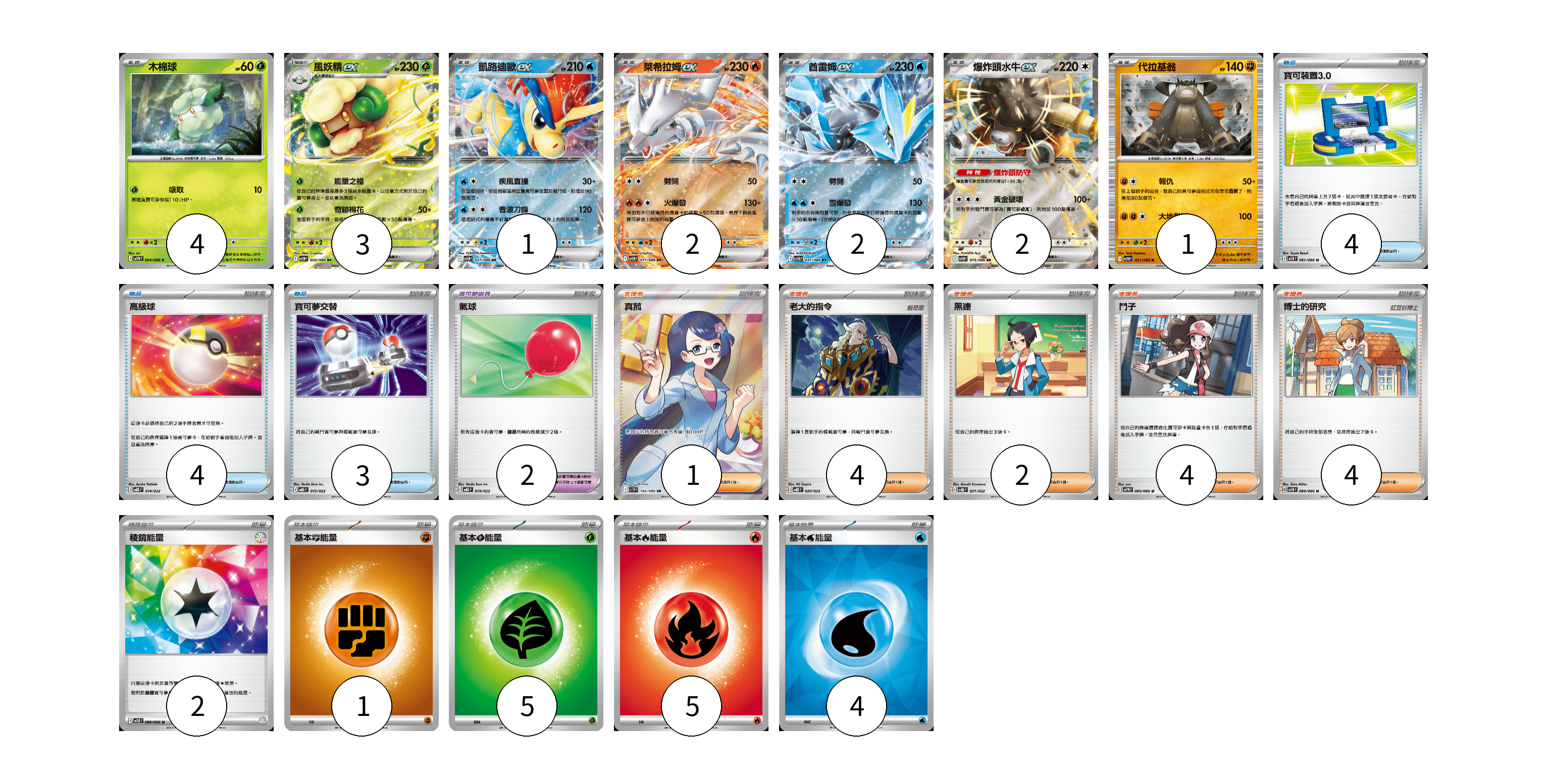 牌組構築方案 以此牌組為基礎新構築牌組 顯示卡面 顯示列表 寶可夢卡(15) 4 3 1 2 2 2 1 寶可夢道具(2) 2 物品卡(11) 4 4 3 支援者卡(15) 1 4 2 4 4 能量卡(17) 2 1 5 5 4 寶可夢卡(15) 卡牌名稱 張數 卡牌名稱 張數 木棉球 SV11W 004/086 04 風妖精ex SV11W 005/086 03 凱路迪歐ex SV11W 027/086 01 萊希拉姆ex SV11W 017/086 02 酋雷姆ex SV11B 031/086 02 爆炸頭水牛ex SV11W 075/086 02 代拉基翁 SV11W 051/086 01 寶可夢道具(2) 卡牌名稱 張數 卡牌名稱 張數 氣球 MBG 019/022 02 物品卡(11) 卡牌名稱 張數 卡牌名稱 張數 寶可裝置3.0 SV11B 081/086 04 高級球 MBD 014/022 04 寶可夢交替 MBG 015/022 03 支援者卡(15) 卡牌名稱 張數 卡牌名稱 張數 真菰 SV11B 166/086 01 老大的指令 MBD 020/022 04 黑連 SVQL 021/022 02 鬥子 SV11W 085/086 04 博士的研究 SV11B 084/086 04 能量卡(17) 卡牌名稱 張數 卡牌名稱 張數 稜鏡能量 SV11B 086/086 02 基本【鬥】能量 M-P FIG 01 基本【草】能量 M-P GRA 05 基本【火】能量 M-P FIR 05 基本【水】能量 SVK WAT 04 以此牌組為基礎新構築牌組 牌組編碼 gJFODm-ZntSHY-vagxvy copy 列印牌組單 牌組編碼已複製 分享至SNS