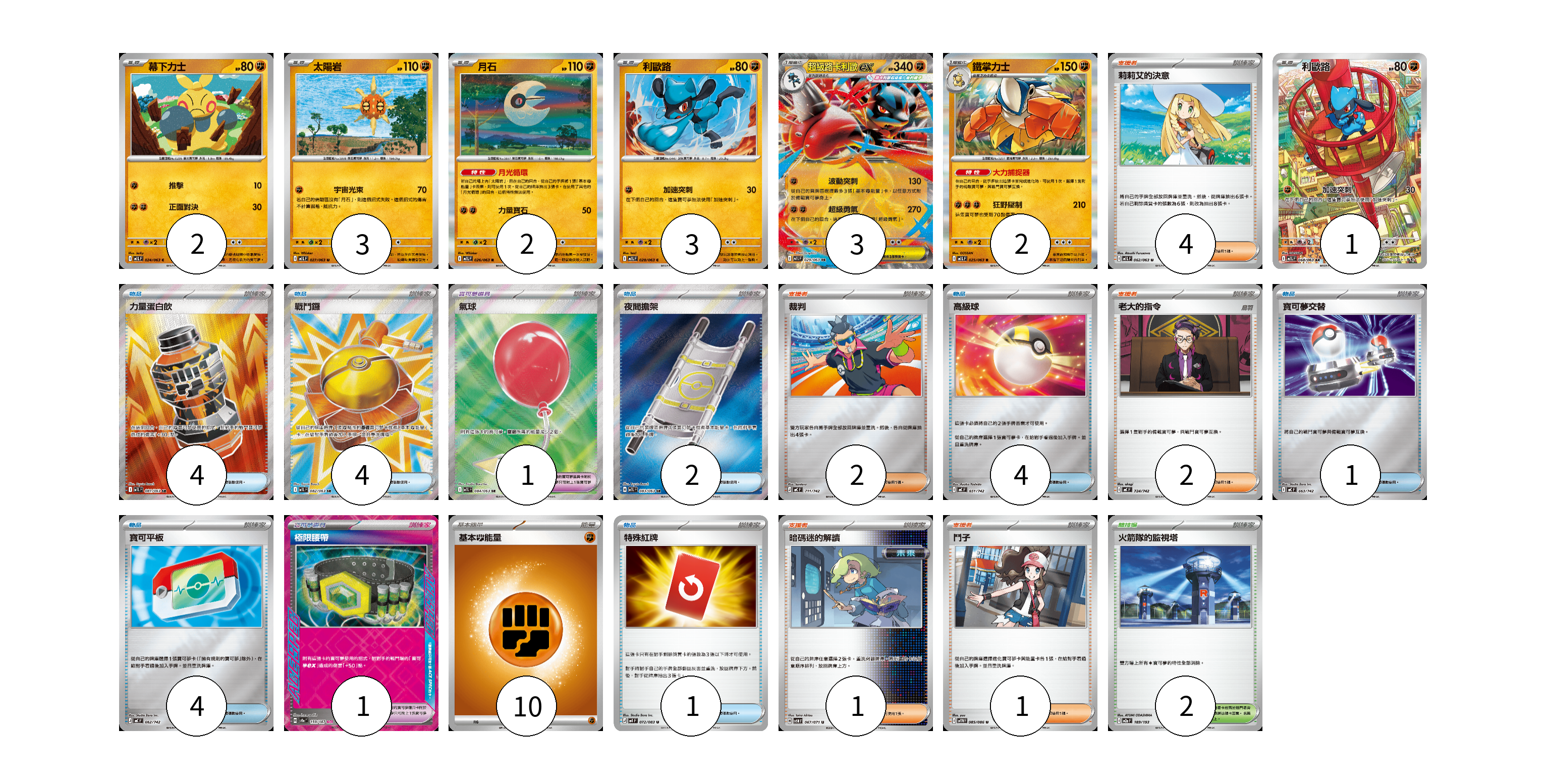 牌組構築方案 以此牌組為基礎新構築牌組 顯示卡面 顯示列表 寶可夢卡(16) 2 3 2 3 3 2 1 寶可夢道具(2) 1 1 物品卡(20) 4 4 2 4 1 4 1 支援者卡(10) 4 2 2 1 1 競技場卡(2) 2 能量卡(10) 10 寶可夢卡(16) 卡牌名稱 張數 卡牌名稱 張數 幕下力士 M1L 024/063 02 太陽岩 M1L 027/063 03 月石 M1L 026/063 02 利歐路 M1L 028/063 03 超級路卡利歐ex M1L 029/063 03 鐵掌力士 M1L 025/063 02 利歐路 M1L 068/063 01 寶可夢道具(2) 卡牌名稱 張數 卡牌名稱 張數 氣球 M1L 084/063 01 極限腰帶 SV8a 159/187 01 物品卡(20) 卡牌名稱 張數 卡牌名稱 張數 力量蛋白飲 M1L 081/063 04 戰鬥鑼 M1L 082/063 04 夜間擔架 M1L 083/063 02 高級球 MC 651/742 04 寶可夢交替 MC 663/742 01 寶可平板 MC 662/742 04 特殊紅牌 M4 072/083 01 支援者卡(10) 卡牌名稱 張數 卡牌名稱 張數 莉莉艾的決意 M1L 062/063 04 裁判 MC 711/742 02 老大的指令 MC 724/742 02 暗碼迷的解讀 SV5M 067/071 01 鬥子 SV11W 085/086 01 競技場卡(2) 卡牌名稱 張數 卡牌名稱 張數 火箭隊的監視塔 M2a 189/193 02 能量卡(10) 卡牌名稱 張數 卡牌名稱 張數 基本【鬥】能量 MC FIG 10 以此牌組為基礎新構築牌組 牌組編碼 gJRxnn-QCxEcl-xuBCtZ copy 列印牌組單 牌組編碼已複製 分享至SNS