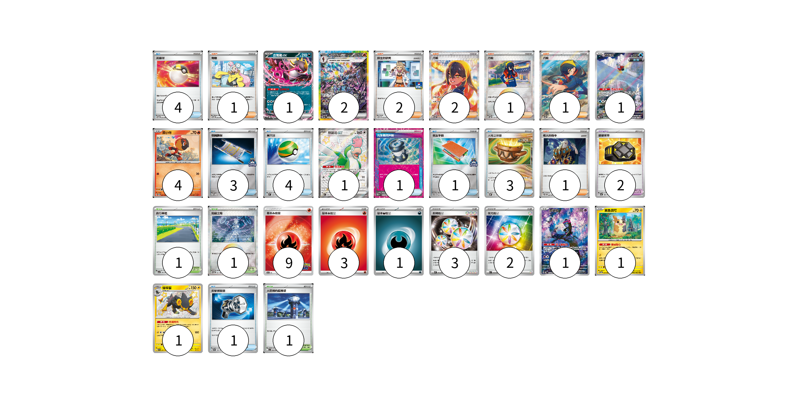 牌組構築方案 以此牌組為基礎新構築牌組 顯示卡面 顯示列表 寶可夢卡(12) 1 2 1 4 1 1 1 1 寶可夢道具(2) 2 物品卡(17) 4 3 4 1 1 3 1 支援者卡(8) 1 2 2 1 1 1 競技場卡(3) 1 1 1 能量卡(18) 9 3 1 3 2 寶可夢卡(12) 卡牌名稱 張數 卡牌名稱 張數 吉雉雞ex SVOM 009/021 01 蒼炎刃鬼ex SV8a 203/187 02 鐵包袱 SV4M 071/066 01 炭小侍 SVPS 005/008 04 怒鸚哥ex SV4a 337/190 01 願增猿 SV6 107/101 01 莫魯貝可 SV5a 030/066 01 倫琴貓 SV4a 242/190 01 寶可夢道具(2) 卡牌名稱 張數 卡牌名稱 張數 硬硬束帶 SV4a 166/190 02 物品卡(17) 卡牌名稱 張數 卡牌名稱 張數 高級球 SVOD 012/020 04 夜間擔架 SV-P 204/SV-P 03 巢穴球 SVM 133/175 04 完全體攪拌器 SVK 017/042 01 朋友手冊 SV-P 182/SV-P 01 大地之容器 SV8a 143/187 03 反擊捕捉器 SV8a 139/187 01 支援者卡(8) 卡牌名稱 張數 卡牌名稱 張數 奇樹 SVOD 016/020 01 博士的研究 SV-P 113/SV-P 02 丹瑜 SV6 130/101 02 丹瑜 SV8a 170/187 01 丹瑜 SV6 123/101 01 老大的指令 SVOM 020/021 01 競技場卡(3) 卡牌名稱 張數 卡牌名稱 張數 自行車道 SV2a 165/165 01 阻礙之塔 SV8a 181/187 01 火箭隊的監視塔 SV10 096/098 01 能量卡(18) 卡牌名稱 張數 卡牌名稱 張數 基本火能量 S10b FIR 09 基本火能量 sv-p FIR 03 基本惡能量 sv-p DAR 01 反轉能量 SV2P 071/071 03 夜光能量 SV1a 073/073 02 以此牌組為基礎新構築牌組 牌組編碼 gJXMws-lrYWls-hhYMPC copy 列印牌組單 牌組編碼已複製 分享至SNS