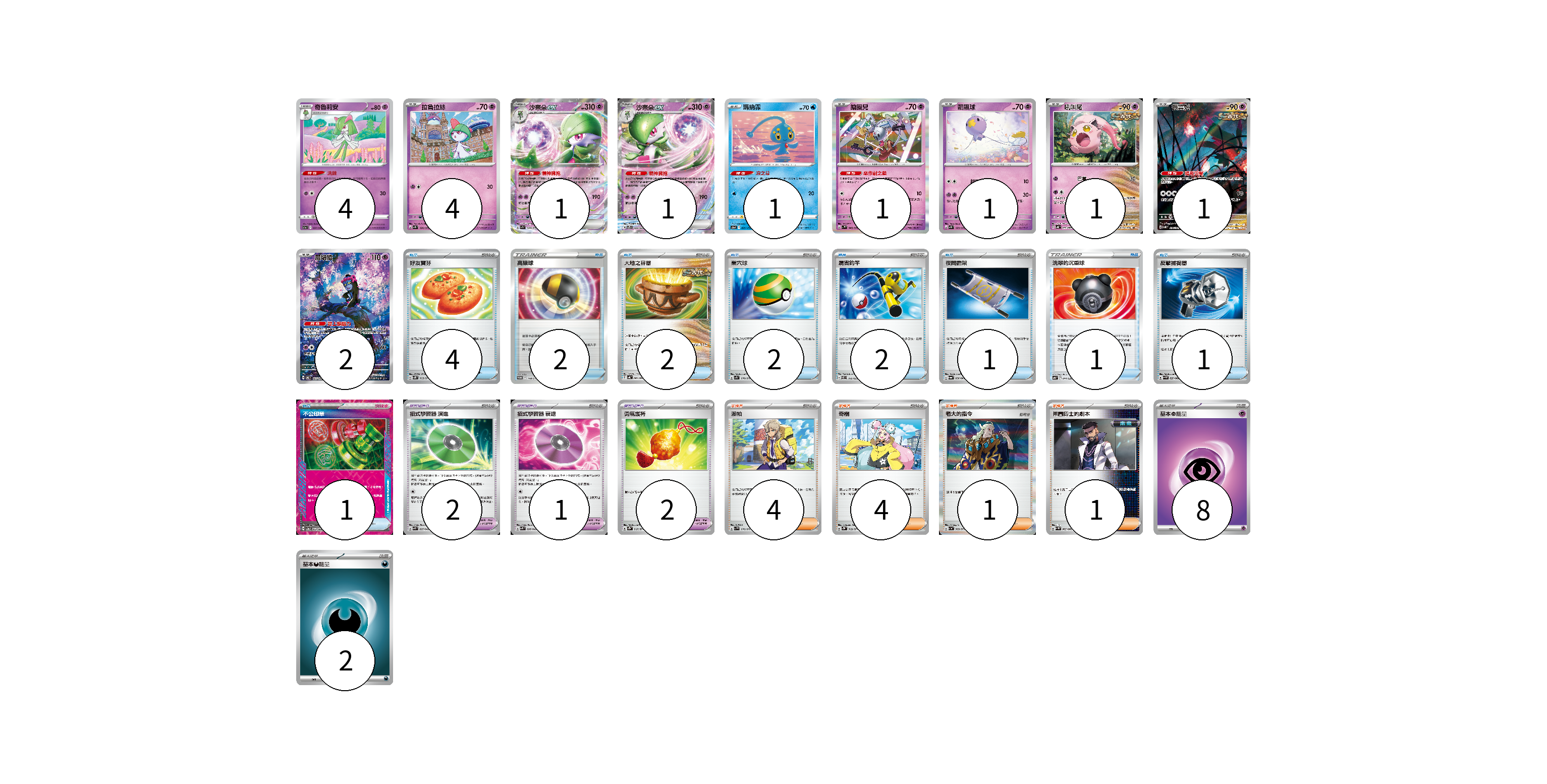 牌組構築方案 以此牌組為基礎新構築牌組 顯示卡面 顯示列表 寶可夢卡(19) 4 4 1 1 1 1 1 1 1 2 2 寶可夢道具(5) 2 1 2 物品卡(14) 4 2 2 2 1 1 1 1 支援者卡(10) 4 4 1 1 能量卡(10) 8 2 寶可夢卡(19) 卡牌名稱 張數 卡牌名稱 張數 奇魯莉安 S11a 037/068 04 拉魯拉絲 SV1S 026/078 04 沙奈朵ex SV1S 028/078 01 沙奈朵ex SVTS 004/022 01 瑪納霏 S12a 029/172 01 鑰圈兒 SV1V 045/078 01 飄飄球 SV1S 029/078 01 吼叫尾 SV4K 032/066 01 振翼髮 SV5K 076/071 01 願增猿 SV6 107/101 02 厲害釣竿 SVEL 010/020 02 寶可夢道具(5) 卡牌名稱 張數 卡牌名稱 張數 招式學習器 演進 SVK 025/042 02 招式學習器 衰退 SVK 026/042 01 勇氣護符 SV2D 067/071 02 物品卡(14) 卡牌名稱 張數 卡牌名稱 張數 好友寶芬 SV5K 063/071 04 高級球 S-P 148/S-P 02 大地之容器 SV4K 060/066 02 巢穴球 SV1S 070/078 02 夜間擔架 SV6a 056/064 01 洗翠的沉重球 SVB 014/028 01 反擊捕捉器 SV4M 059/066 01 不公印章 SV5a 053/066 01 支援者卡(10) 卡牌名稱 張數 卡牌名稱 張數 派帕 SV1V 076/078 04 奇樹 SV2D 069/071 04 老大的指令 SV1a 069/073 01 弗圖博士的劇本 SV4M 065/066 01 能量卡(10) 卡牌名稱 張數 卡牌名稱 張數 基本超能量 sv-p PSY 08 基本惡能量 sv-p DAR 02 以此牌組為基礎新構築牌組 牌組編碼 gJggkW-TSwNhZ-CjKumI copy 列印牌組單 牌組編碼已複製 分享至SNS