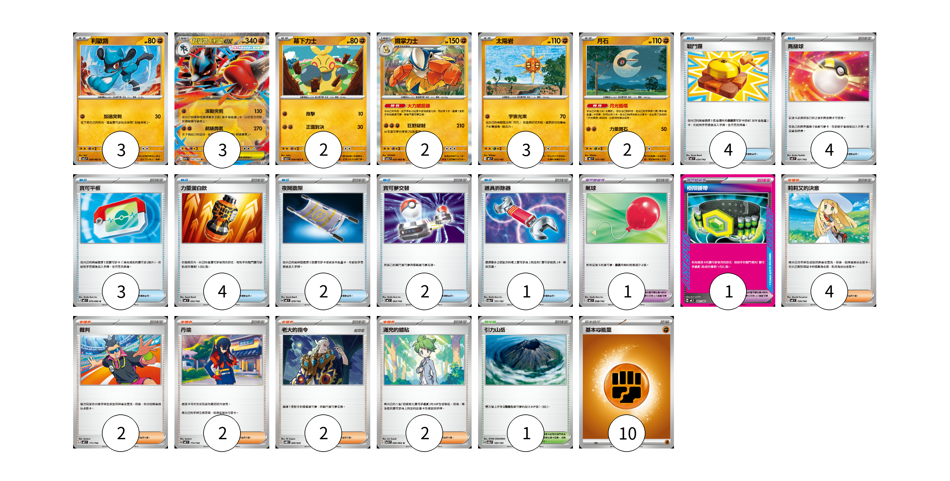 牌組構築方案 以此牌組為基礎新構築牌組 顯示卡面 顯示列表 寶可夢卡(15) 3 3 2 2 3 2 寶可夢道具(2) 1 1 物品卡(20) 4 4 3 4 2 2 1 支援者卡(12) 4 2 2 2 2 競技場卡(1) 1 能量卡(10) 10 寶可夢卡(15) 卡牌名稱 張數 卡牌名稱 張數 利歐路 M1L 028/063 03 超級路卡利歐ex M2a 092/193 03 幕下力士 M1L 024/063 02 鐵掌力士 M1L 025/063 02 太陽岩 MC 372/742 03 月石 MC 371/742 02 寶可夢道具(2) 卡牌名稱 張數 卡牌名稱 張數 氣球 MC 688/742 01 極限腰帶 MC 691/742 01 物品卡(20) 卡牌名稱 張數 卡牌名稱 張數 戰鬥鑼 MC 654/742 04 高級球 MC 651/742 04 寶可平板 M3 070/080 03 力量蛋白飲 MC 652/742 04 夜間擔架 MC 670/742 02 寶可夢交替 MC 663/742 02 道具拆除器 M2a 151/193 01 支援者卡(12) 卡牌名稱 張數 卡牌名稱 張數 莉莉艾的決意 MC 729/742 04 裁判 MC 711/742 02 丹瑜 MC 715/742 02 老大的指令 MBD 020/022 02 滿充的體貼 M1S 060/063 02 競技場卡(1) 卡牌名稱 張數 卡牌名稱 張數 引力山岳 M2a 183/193 01 能量卡(10) 卡牌名稱 張數 卡牌名稱 張數 基本【鬥】能量 MC FIG 10 以此牌組為基礎新構築牌組 牌組編碼 gKiixI-XSFIZF-iKWLra copy 列印牌組單 牌組編碼已複製 分享至SNS