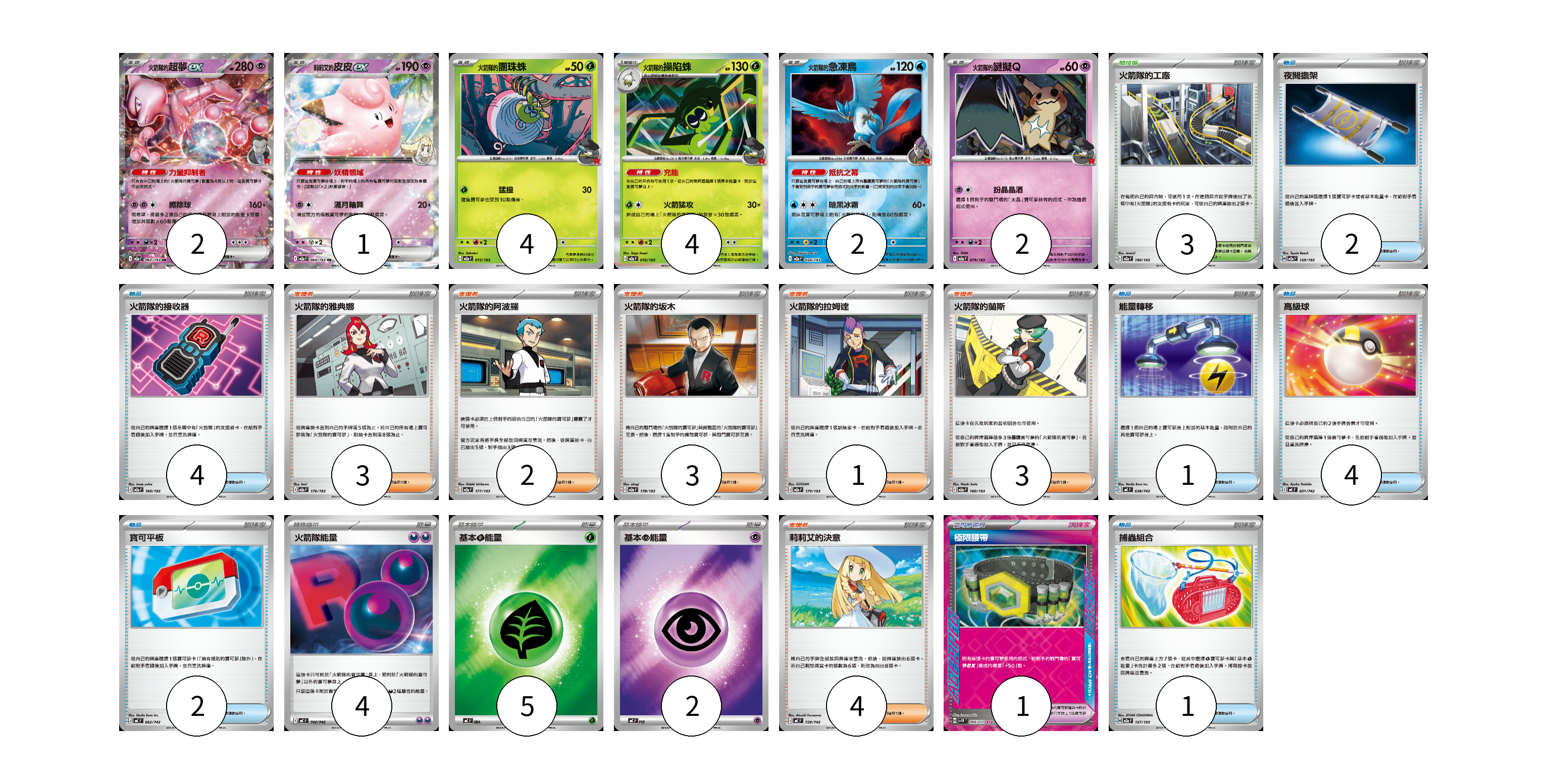 牌組構築方案 以此牌組為基礎新構築牌組 顯示卡面 顯示列表 寶可夢卡(15) 2 1 4 4 2 2 寶可夢道具(1) 1 物品卡(14) 2 4 1 4 2 1 支援者卡(16) 3 2 3 1 3 4 競技場卡(3) 3 能量卡(11) 4 5 2 寶可夢卡(15) 卡牌名稱 張數 卡牌名稱 張數 <火箭隊的>超夢ex M2a 063/193 02 莉莉艾的皮皮ex M2a 060/193 01 <火箭隊的>團珠蛛 M2a 015/193 04 <火箭隊的>操陷蛛 M2a 016/193 04 <火箭隊的>急凍鳥 M2a 034/193 02 <火箭隊的>謎擬Q M2a 079/193 02 寶可夢道具(1) 卡牌名稱 張數 卡牌名稱 張數 極限腰帶 SV5K 066/071 01 物品卡(14) 卡牌名稱 張數 卡牌名稱 張數 夜間擔架 M2a 159/193 02 火箭隊的接收器 M2a 160/193 04 能量轉移 MC 638/742 01 高級球 MC 651/742 04 寶可平板 MC 662/742 02 捕蟲組合 M2a 157/193 01 支援者卡(16) 卡牌名稱 張數 卡牌名稱 張數 火箭隊的雅典娜 M2a 176/193 03 火箭隊的阿波羅 M2a 177/193 02 火箭隊的坂木 M2a 178/193 03 火箭隊的拉姆達 M2a 179/193 01 火箭隊的蘭斯 M2a 180/193 03 莉莉艾的決意 MC 729/742 04 競技場卡(3) 卡牌名稱 張數 卡牌名稱 張數 火箭隊的工廠 M2a 190/193 03 能量卡(11) 卡牌名稱 張數 卡牌名稱 張數 火箭隊能量 MC 742/742 04 基本【草】能量 MC GRA 05 基本【超】能量 MC PSY 02 以此牌組為基礎新構築牌組 牌組編碼 gLYjCo-innogp-ioOzAb copy 列印牌組單 牌組編碼已複製 分享至SNS