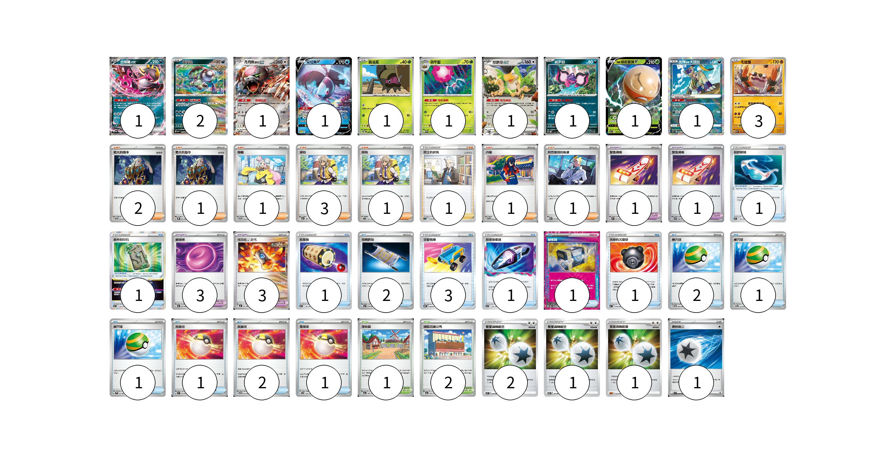 牌組構築方案 以此牌組為基礎新構築牌組 顯示卡面 顯示列表 寶可夢卡(14) 1 2 1 1 1 1 1 1 1 1 3 寶可夢道具(10) 1 1 1 1 3 3 物品卡(17) 1 2 3 1 1 1 2 1 1 1 2 1 支援者卡(11) 2 1 1 3 1 1 1 1 競技場卡(3) 1 2 能量卡(5) 2 1 1 1 寶可夢卡(14) 卡牌名稱 張數 卡牌名稱 張數 吉雉雞ex SV6a 038/064 01 猛惡菇 SV4K 053/066 02 月月熊 赫月 ex SV5a 052/066 01 霓虹魚V SPZ 001/020 01 蟲滾泥 SV8 008/106 01 蟲甲聖 SV5M 015/071 01 怒鸚哥ex SVK 006/042 01 桃歹郎 SV8 075/106 01 洗翠 頑皮雷彈V S10a 003/071 01 光輝洗翠 大狃拉 S10a 046/071 01 毛崖蟹 SV3a 031/062 03 寶可夢道具(10) 卡牌名稱 張數 卡牌名稱 張數 緊急滑板 SVK 023/042 01 緊急滑板 SV5K 064/071 01 超群眼鏡 S10P 063/067 01 森林封印石 S12 092/098 01 鎖鏈糬 SV6a 057/064 03 驅勁能量 古代 SV4K 061/066 03 物品卡(17) 卡牌名稱 張數 卡牌名稱 張數 能量籤 S10P 060/067 01 夜間擔架 SV6a 056/064 02 交替推車 SVTR 009/021 03 放逐吸塵器 S11 093/100 01 秘密箱 SV6 092/101 01 洗翠的沉重球 SVF 019/038 01 巢穴球 SVTH 010/018 02 巢穴球 SVEM 012/020 01 巢穴球 SVAW 014/023 01 高級球 SVK 018/042 01 高級球 SVTH 011/018 02 高級球 SVD 119/139 01 支援者卡(11) 卡牌名稱 張數 卡牌名稱 張數 老大的指令 SVTH 017/018 02 老大的指令 SVHK 022/022 01 奇樹 SVTH 015/018 01 派帕 SV4a 180/190 03 派帕 SVD 137/139 01 博士的研究(山梨博士) SLD 019/020 01 丹瑜 SVTR 016/021 01 阿克羅瑪的執著 SV6a 059/064 01 競技場卡(3) 卡牌名稱 張數 卡牌名稱 張數 深缽鎮 SV4a 185/190 01 城鎮百貨公司 SV4a 183/190 02 能量卡(5) 卡牌名稱 張數 卡牌名稱 張數 雙重渦輪能量 SVTM 022/022 02 雙重渦輪能量 SVTR 021/021 01 雙重渦輪能量 SLL 021/021 01 噴射能量 SVK 040/042 01 以此牌組為基礎新構築牌組 牌組編碼 gMbrwa-SzOHMv-GANrIo copy 列印牌組單 牌組編碼已複製 分享至SNS
