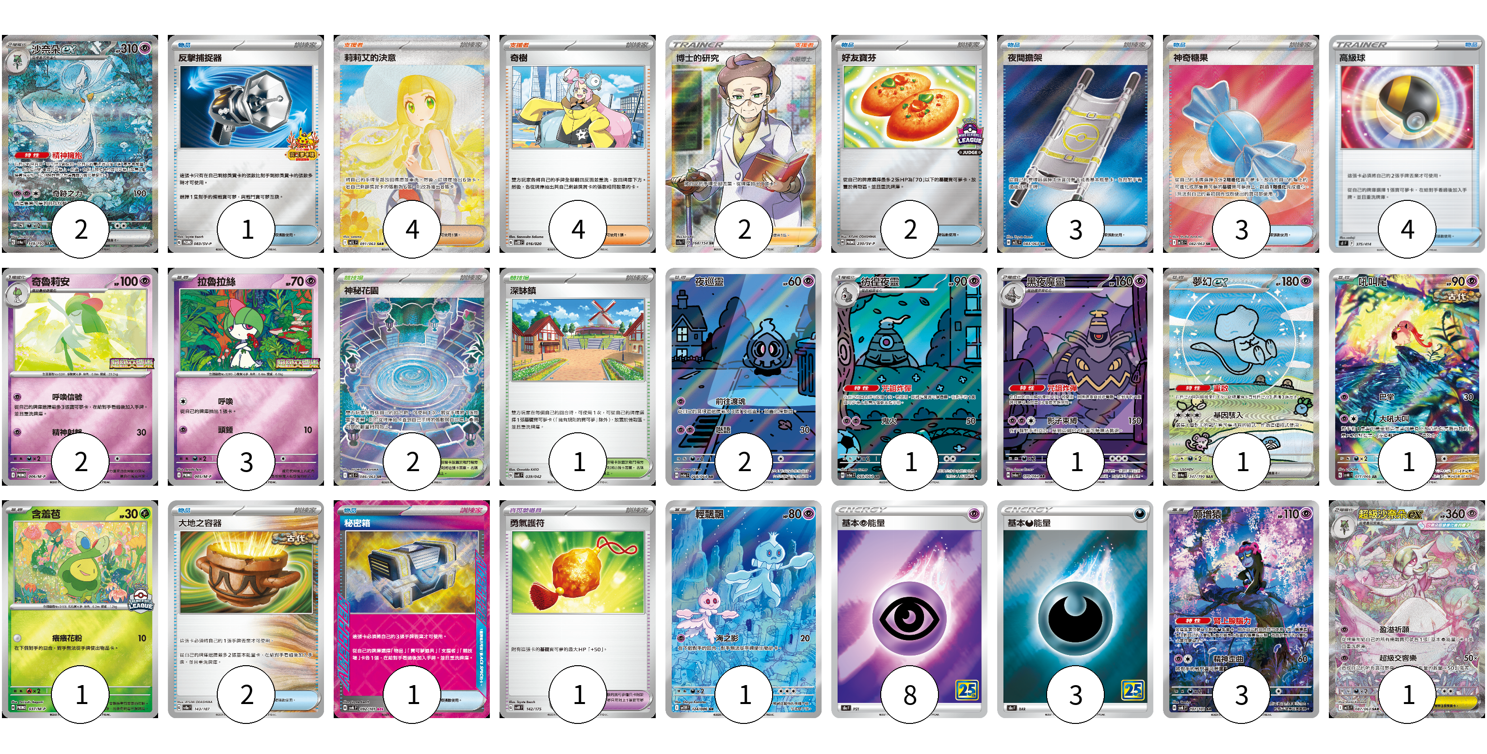 牌組構築方案 以此牌組為基礎新構築牌組 顯示卡面 顯示列表 寶可夢卡(19) 2 2 3 2 1 1 1 1 1 1 3 1 寶可夢道具(1) 1 物品卡(16) 1 2 3 3 4 2 1 支援者卡(10) 4 4 2 競技場卡(3) 2 1 能量卡(11) 8 3 寶可夢卡(19) 卡牌名稱 張數 卡牌名稱 張數 沙奈朵ex SV4a 348/190 02 奇魯莉安 M-P 006/M-P 02 拉魯拉絲 M-P 005/M-P 03 夜巡靈 SV6a 068/064 02 彷徨夜靈 SV6a 069/064 01 黑夜魔靈 SV6a 070/064 01 夢幻ex SV4a 347/190 01 吼叫尾 SV4K 071/066 01 含羞苞 M-P 037/M-P 01 輕飄飄 SV11W 124/086 01 願增猿 SV6 107/101 03 超級沙奈朵ex M1S 087/063 01 寶可夢道具(1) 卡牌名稱 張數 卡牌名稱 張數 勇氣護符 SVM 142/175 01 物品卡(16) 卡牌名稱 張數 卡牌名稱 張數 反擊捕捉器 SV-P 083/SV-P 01 好友寶芬 SV-P 230/SV-P 02 夜間擔架 M1L 083/063 03 神奇糖果 M1S 082/063 03 高級球 SI 375/414 04 大地之容器 SV8a 143/187 02 秘密箱 SV6 092/101 01 支援者卡(10) 卡牌名稱 張數 卡牌名稱 張數 莉莉艾的決意 M1L 091/063 04 奇樹 SVOD 016/020 04 博士的研究(木蘭博士) SC1a 168/154 02 競技場卡(3) 卡牌名稱 張數 卡牌名稱 張數 神秘花園 M1S 086/063 02 深缽鎮 SVK 039/042 01 能量卡(11) 卡牌名稱 張數 卡牌名稱 張數 基本超能量 S8a PSY 08 基本惡能量 S8a DAR 03 以此牌組為基礎新構築牌組 牌組編碼 gOKbkl-zhlwHD-pXTvaC copy 列印牌組單 牌組編碼已複製 分享至SNS