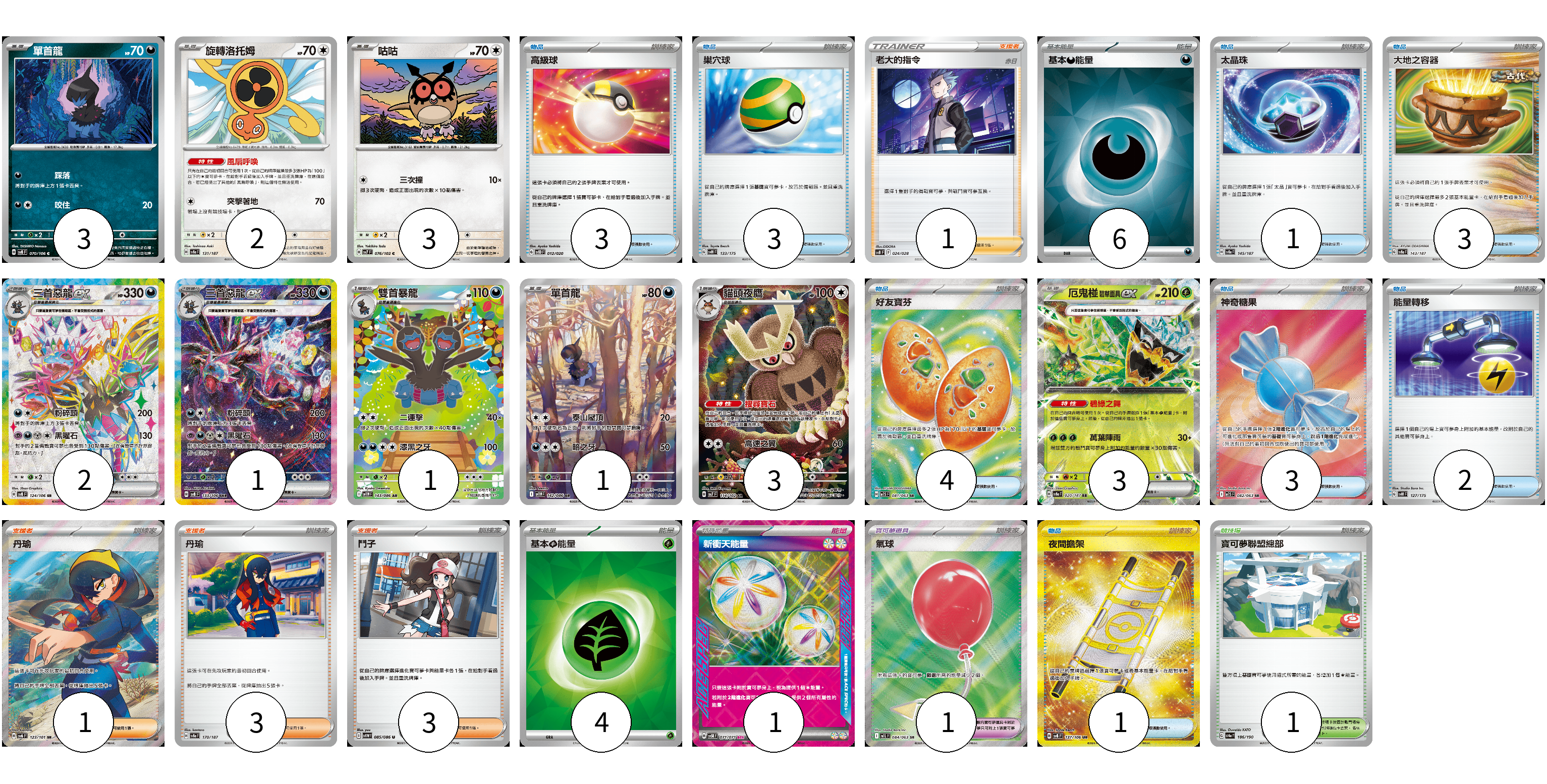 牌組構築方案 以此牌組為基礎新構築牌組 顯示卡面 顯示列表 寶可夢卡(19) 3 2 3 2 1 1 1 3 3 寶可夢道具(1) 1 物品卡(20) 3 3 1 3 4 3 2 1 支援者卡(8) 1 1 3 3 競技場卡(1) 1 能量卡(11) 6 4 1 寶可夢卡(19) 卡牌名稱 張數 卡牌名稱 張數 單首龍 SV8 070/106 03 旋轉洛托姆 SV8a 131/187 02 咕咕 SV7 076/102 03 三首惡龍ex SV8 124/106 02 三首惡龍ex SV8 133/106 01 雙首暴龍 SV11W 143/086 01 單首龍 SV11W 142/086 01 貓頭夜鷹 SV7 114/102 03 厄鬼椪 碧草面具ex SV8a 020/187 03 寶可夢道具(1) 卡牌名稱 張數 卡牌名稱 張數 氣球 M1L 084/063 01 物品卡(20) 卡牌名稱 張數 卡牌名稱 張數 高級球 SVOD 012/020 03 巢穴球 SVM 133/175 03 太晶珠 SV8a 145/187 01 大地之容器 SV8a 143/187 03 好友寶芬 M1S 081/063 04 神奇糖果 M1S 082/063 03 能量轉移 SVM 127/175 02 夜間擔架 SV8 137/106 01 支援者卡(8) 卡牌名稱 張數 卡牌名稱 張數 老大的指令(赤日) SVB 024/028 01 丹瑜 SV6 123/101 01 丹瑜 SV8a 170/187 03 鬥子 SV11W 085/086 03 競技場卡(1) 卡牌名稱 張數 卡牌名稱 張數 寶可夢聯盟總部 SV4a 186/190 01 能量卡(11) 卡牌名稱 張數 卡牌名稱 張數 基本【惡】能量 SVOM DAR 06 基本【草】能量 SVM GRA 04 新衝天能量 SV5K 071/071 01 以此牌組為基礎新構築牌組 牌組編碼 gOvfVS-efWFVU-zaVLNL copy 列印牌組單 牌組編碼已複製 分享至SNS