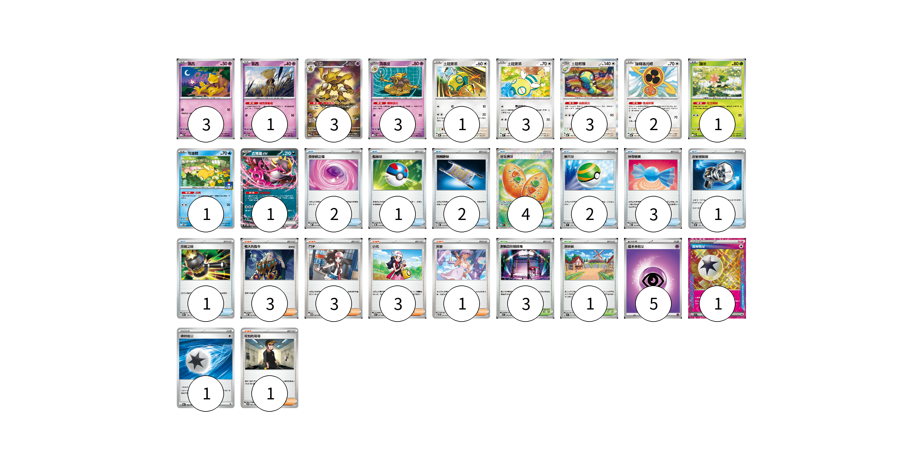 牌組構築方案 以此牌組為基礎新構築牌組 顯示卡面 顯示列表 寶可夢卡(22) 3 1 3 3 1 3 3 2 1 1 1 物品卡(16) 2 1 2 4 2 3 1 1 支援者卡(11) 3 3 3 1 1 競技場卡(4) 3 1 能量卡(7) 5 1 1 寶可夢卡(22) 卡牌名稱 張數 卡牌名稱 張數 凱西 M1S 036/063 03 凱西 SV6 047/101 01 胡地 M1S 071/063 03 勇基拉 M1S 037/063 03 土龍弟弟 SV8a 129/187 01 土龍弟弟 SVM 095/175 03 土龍節節 SV8a 130/187 03 旋轉洛托姆 SV8a 131/187 02 謝米 SV9a 006/063 01 可達鴨 SV-P 220/SV-P 01 吉雉雞ex SVOM 009/021 01 物品卡(16) 卡牌名稱 張數 卡牌名稱 張數 奇跡修正檔 MBD 017/022 02 超級球 SVQL 014/022 01 夜間擔架 MBD 016/022 02 好友寶芬 M1S 081/063 04 巢穴球 SVM 133/175 02 神奇糖果 MBG 013/022 03 反擊捕捉器 SV8a 139/187 01 改造之錘 SV8a 138/187 01 支援者卡(11) 卡牌名稱 張數 卡牌名稱 張數 老大的指令 MBG 021/022 03 鬥子 SV11W 085/086 03 小光 M2 077/080 03 莉普 SVTS 021/022 01 可怕的哥哥 SV9 095/100 01 競技場卡(4) 卡牌名稱 張數 卡牌名稱 張數 對戰圓形競技場 M2 079/080 03 深缽鎮 SVK 039/042 01 能量卡(7) 卡牌名稱 張數 卡牌名稱 張數 基本【超】能量 MBD PSY 05 富裕能量 SV7a 064/064 01 噴射能量 SV8a 185/187 01 以此牌組為基礎新構築牌組 牌組編碼 gQodNv-VRkpOm-yNOnAW copy 列印牌組單 牌組編碼已複製 分享至SNS