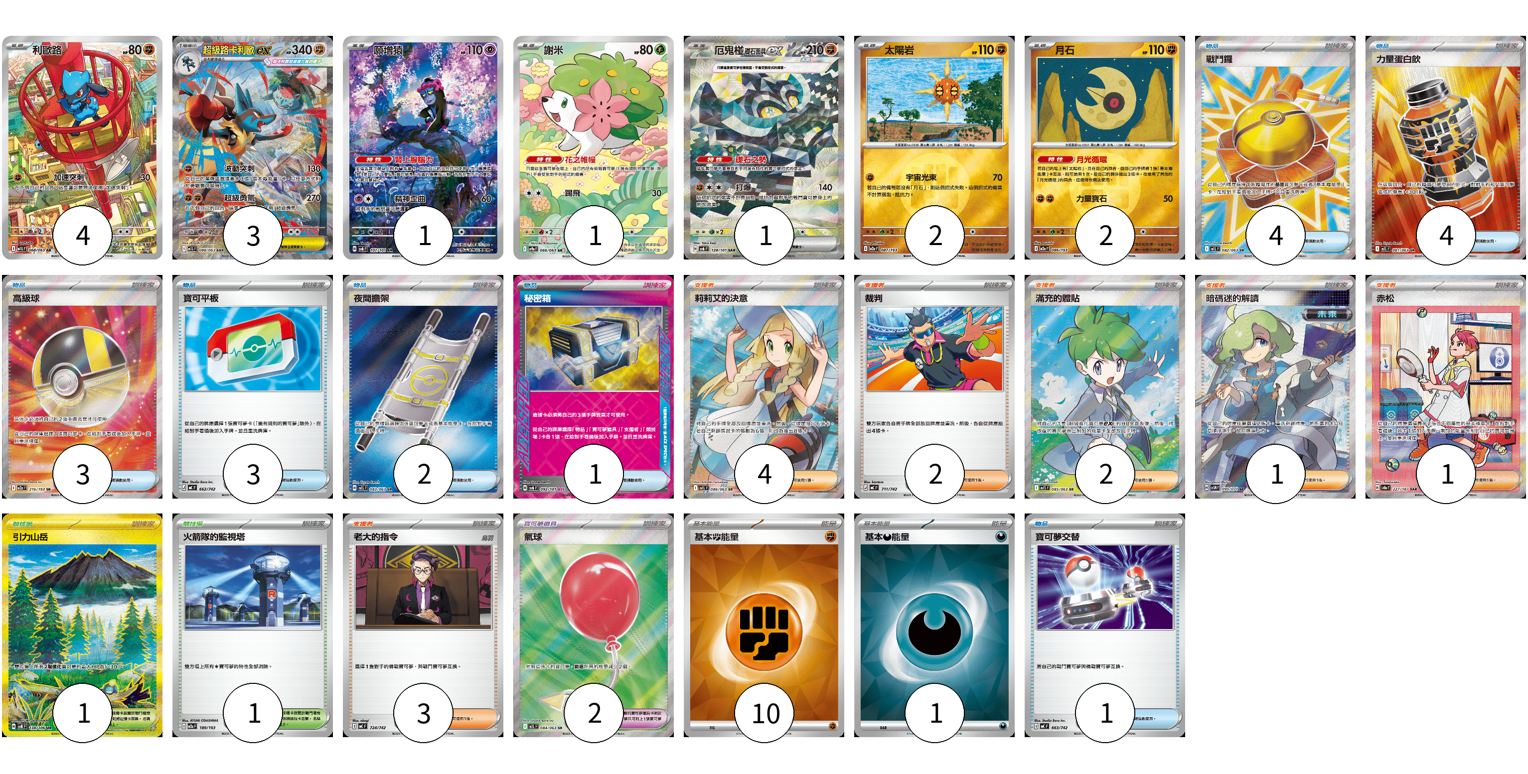 牌組構築方案 以此牌組為基礎新構築牌組 顯示卡面 顯示列表 寶可夢卡(14) 4 3 1 1 1 2 2 寶可夢道具(2) 2 物品卡(18) 4 4 3 3 2 1 1 支援者卡(13) 4 2 2 1 1 3 競技場卡(2) 1 1 能量卡(11) 10 1 寶可夢卡(14) 卡牌名稱 張數 卡牌名稱 張數 利歐路 M1L 068/063 04 超級路卡利歐ex M1L 088/063 03 願增猿 SV6 107/101 01 謝米 SV9a 066/063 01 厄鬼椪 礎石面具ex SV6 128/101 01 太陽岩 M2a 087/193 02 月石 M2a 086/193 02 寶可夢道具(2) 卡牌名稱 張數 卡牌名稱 張數 氣球 M1L 084/063 02 物品卡(18) 卡牌名稱 張數 卡牌名稱 張數 戰鬥鑼 M1L 082/063 04 力量蛋白飲 M1L 081/063 04 高級球 M2a 216/193 03 寶可平板 MC 662/742 03 夜間擔架 M1L 083/063 02 秘密箱 SV6 092/101 01 寶可夢交替 MC 663/742 01 支援者卡(13) 卡牌名稱 張數 卡牌名稱 張數 莉莉艾的決意 M1L 086/063 04 裁判 MC 711/742 02 滿充的體貼 M1S 085/063 02 暗碼迷的解讀 SV5M 090/071 01 赤松 SV8a 227/187 01 老大的指令 MC 724/742 03 競技場卡(2) 卡牌名稱 張數 卡牌名稱 張數 引力山岳 SV8 138/106 01 火箭隊的監視塔 M2a 189/193 01 能量卡(11) 卡牌名稱 張數 卡牌名稱 張數 基本【鬥】能量 SVM FIG 10 基本【惡】能量 SVOM DAR 01 以此牌組為基礎新構築牌組 牌組編碼 gQtHdL-CovlJv-MdlNLq copy 列印牌組單 牌組編碼已複製 分享至SNS