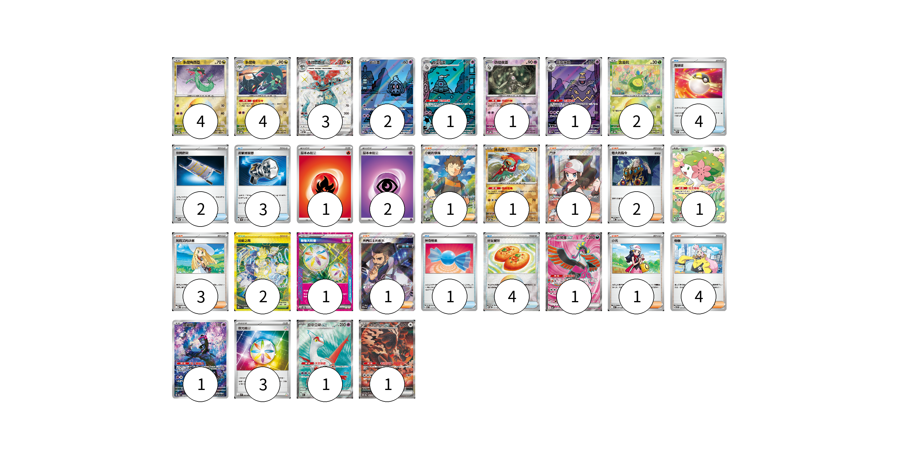 牌組構築方案 以此牌組為基礎新構築牌組 顯示卡面 顯示列表 寶可夢卡(24) 4 4 3 2 1 1 1 2 1 1 1 1 1 1 物品卡(14) 4 2 3 1 4 支援者卡(13) 1 1 2 3 1 1 4 競技場卡(2) 2 能量卡(7) 1 2 1 3 寶可夢卡(24) 卡牌名稱 張數 卡牌名稱 張數 多龍梅西亞 SV8a 118/187 04 多龍奇 SV8a 119/187 04 多龍巴魯托ex SV6 120/101 03 夜巡靈 SV6a 068/064 02 彷徨夜靈 SV6a 069/064 01 彷徨夜靈 SV8a 065/187 01 黑夜魔靈 SV6a 070/064 01 含羞苞 SV8a 001/187 02 摔角鷹人 SV8a 084/187 01 謝米 SV9a 066/063 01 吉雉雞ex SV6a 081/064 01 願增猿 SV6 107/101 01 拉帝亞斯ex SV7a 078/064 01 月月熊 赫月ex SV8a 225/187 01 物品卡(14) 卡牌名稱 張數 卡牌名稱 張數 高級球 SVAL 013/021 04 夜間擔架 SV8a 151/187 02 反擊捕捉器 SV4M 059/066 03 神奇糖果 SVEL 013/020 01 好友寶芬 SV8a 147/187 04 支援者卡(13) 卡牌名稱 張數 卡牌名稱 張數 小剛的發掘 SV9 123/100 01 鬥子 SV11W 166/086 01 老大的指令 MBD 020/022 02 莉莉艾的決意 MBD 021/022 03 弗圖博士的劇本 SV4M 086/066 01 小光 M2 077/080 01 奇樹 SVTS 018/022 04 競技場卡(2) 卡牌名稱 張數 卡牌名稱 張數 阻礙之塔 SV10 132/098 02 能量卡(7) 卡牌名稱 張數 卡牌名稱 張數 基本【火】能量 SVTL FIR 01 基本【超】能量 SVTS PSY 02 新衝天能量 SV5K 071/071 01 夜光能量 SVK 042/042 03 以此牌組為基礎新構築牌組 牌組編碼 gQyKRD-ZcmtAZ-hcNjll copy 列印牌組單 牌組編碼已複製 分享至SNS