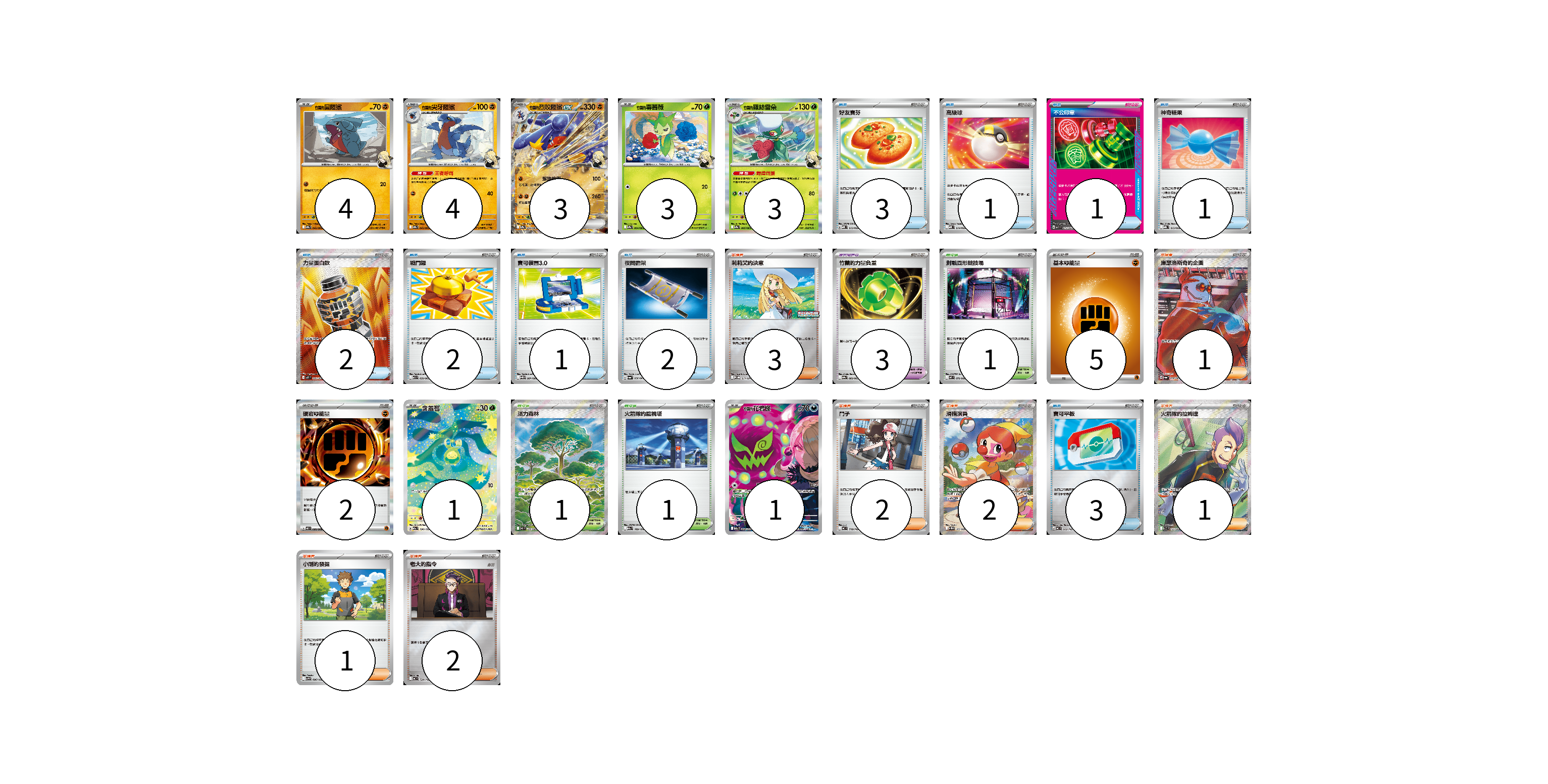 牌組構築方案 以此牌組為基礎新構築牌組 顯示卡面 顯示列表 寶可夢卡(19) 4 4 3 3 3 1 1 寶可夢道具(3) 3 物品卡(16) 3 1 1 1 2 2 1 2 3 支援者卡(12) 3 1 2 2 1 1 2 競技場卡(3) 1 1 1 能量卡(7) 5 2 寶可夢卡(19) 卡牌名稱 張數 卡牌名稱 張數 <竹蘭的>圓陸鯊 SV9a 042/063 04 <竹蘭的>尖牙陸鯊 SV9a 043/063 04 <竹蘭的>烈咬陸鯊ex SV9a 044/063 03 <竹蘭的>毒薔薇 SV9a 004/063 03 <竹蘭的>羅絲雷朵 SV9a 005/063 03 含羞苞 M2a 196/193 01 <竹蘭的>花岩怪 M2a 208/193 01 寶可夢道具(3) 卡牌名稱 張數 卡牌名稱 張數 竹蘭的力量負重 SV9a 060/063 03 物品卡(16) 卡牌名稱 張數 卡牌名稱 張數 好友寶芬 MBD 013/022 03 高級球 MBD 014/022 01 不公印章 MBD 011/022 01 神奇糖果 MBG 013/022 01 力量蛋白飲 M1L 081/063 02 戰鬥鑼 M1L 059/063 02 寶可裝置3.0 SV11B 081/086 01 夜間擔架 SV6a 056/064 02 寶可平板 MC 662/742 03 支援者卡(12) 卡牌名稱 張數 卡牌名稱 張數 莉莉艾的決意 M-P 011/M-P 03 庫瑟洛斯奇的企圖 SV6a 086/064 01 鬥子 MC 718/742 02 滑稽演員 SV11W 165/086 02 火箭隊的拉姆達 SV10 122/098 01 小剛的發掘 SV9 096/100 01 老大的指令 MC 724/742 02 競技場卡(3) 卡牌名稱 張數 卡牌名稱 張數 對戰圓形競技場 M2 079/080 01 活力森林 M3 109/080 01 火箭隊的監視塔 M2a 189/193 01 能量卡(7) 卡牌名稱 張數 卡牌名稱 張數 基本【鬥】能量 M-P FIG 05 硬岩【鬥】能量 M3 080/080 02 以此牌組為基礎新構築牌組 牌組編碼 gTGyqS-jCqXNu-RmJwBf copy 列印牌組單 牌組編碼已複製 分享至SNS