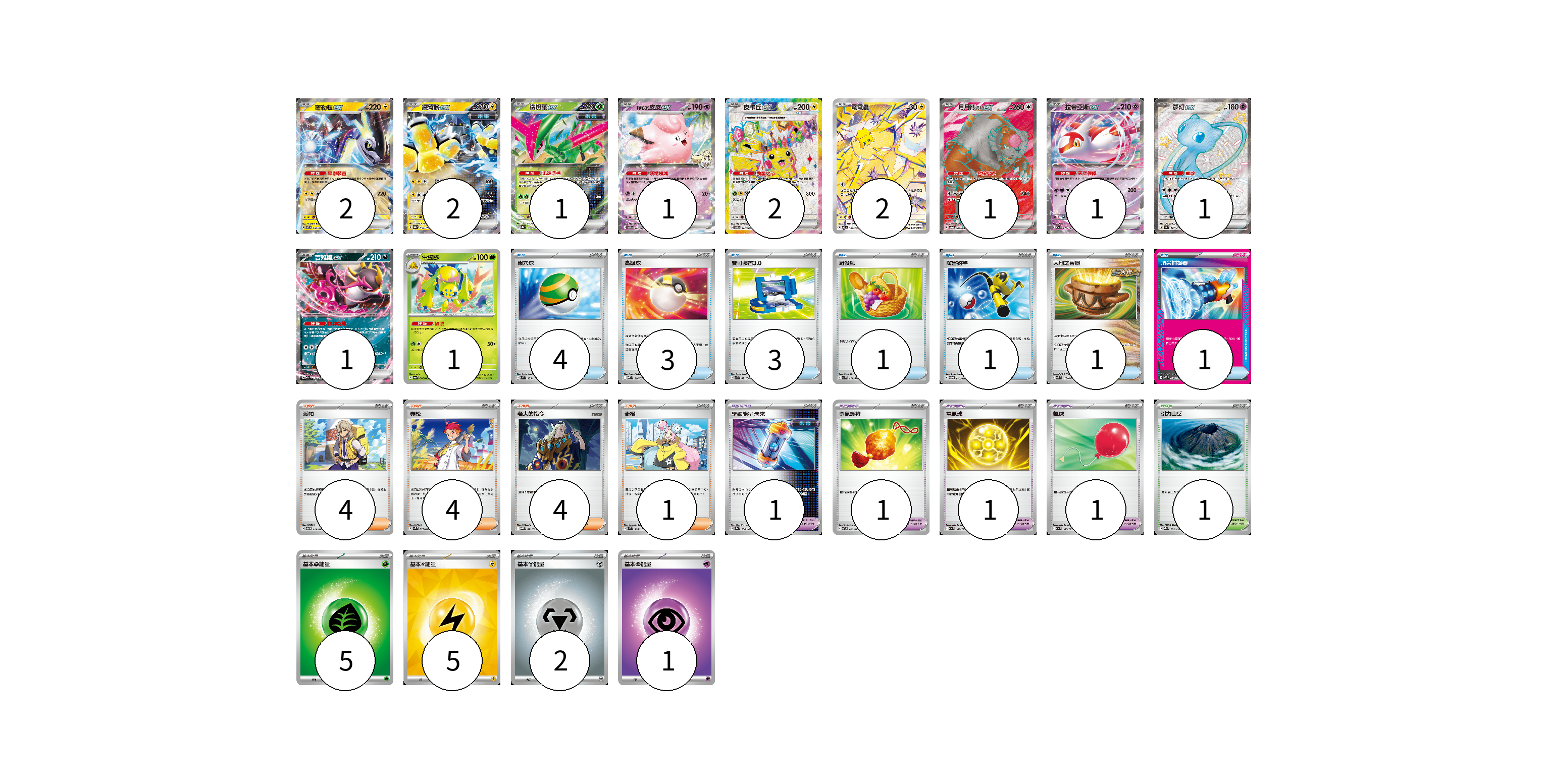 牌組構築方案 以此牌組為基礎新構築牌組 顯示卡面 顯示列表 寶可夢卡(15) 2 2 1 1 2 2 1 1 1 1 1 寶可夢道具(4) 1 1 1 1 物品卡(14) 4 3 3 1 1 1 1 支援者卡(13) 4 4 4 1 競技場卡(1) 1 能量卡(13) 5 5 2 1 寶可夢卡(15) 卡牌名稱 張數 卡牌名稱 張數 密勒頓ex SVTR 008/021 02 鐵臂膀ex SV8a 054/187 02 鐵斑葉ex SV8a 016/187 01 莉莉艾的皮皮ex SV9 033/100 01 皮卡丘ex SV8 122/106 02 電電蟲 SV7 108/102 02 月月熊 赫月 ex SV5a 084/066 01 拉帝亞斯ex M2a 075/193 01 夢幻ex SV4a 327/190 01 吉雉雞ex M2a 114/193 01 電蜘蛛 SV6a 002/064 01 寶可夢道具(4) 卡牌名稱 張數 卡牌名稱 張數 驅勁能量 未來 SV8a 158/187 01 勇氣護符 SVTR 015/021 01 電氣球 M2a 163/193 01 氣球 M2a 165/193 01 物品卡(14) 卡牌名稱 張數 卡牌名稱 張數 巢穴球 SVM 133/175 04 高級球 MBD 014/022 03 寶可裝置3.0 SVK 021/042 03 野餐籃 SV1V 071/078 01 厲害釣竿 SVOD 010/020 01 大地之容器 SVK 012/042 01 頂尖捕捉器 MBG 014/022 01 支援者卡(13) 卡牌名稱 張數 卡牌名稱 張數 派帕 SVTM 019/022 04 赤松 SVK 027/042 04 老大的指令 MBG 021/022 04 奇樹 SVM 160/175 01 競技場卡(1) 卡牌名稱 張數 卡牌名稱 張數 引力山岳 M2a 183/193 01 能量卡(13) 卡牌名稱 張數 卡牌名稱 張數 基本【草】能量 M-P GRA 05 基本【雷】能量 SVQP LIG 05 基本【鋼】能量 M-P MET 02 基本【超】能量 M-P PSY 01 以此牌組為基礎新構築牌組 牌組編碼 gTTxPq-KMUIWy-EMRRJg copy 列印牌組單 牌組編碼已複製 分享至SNS