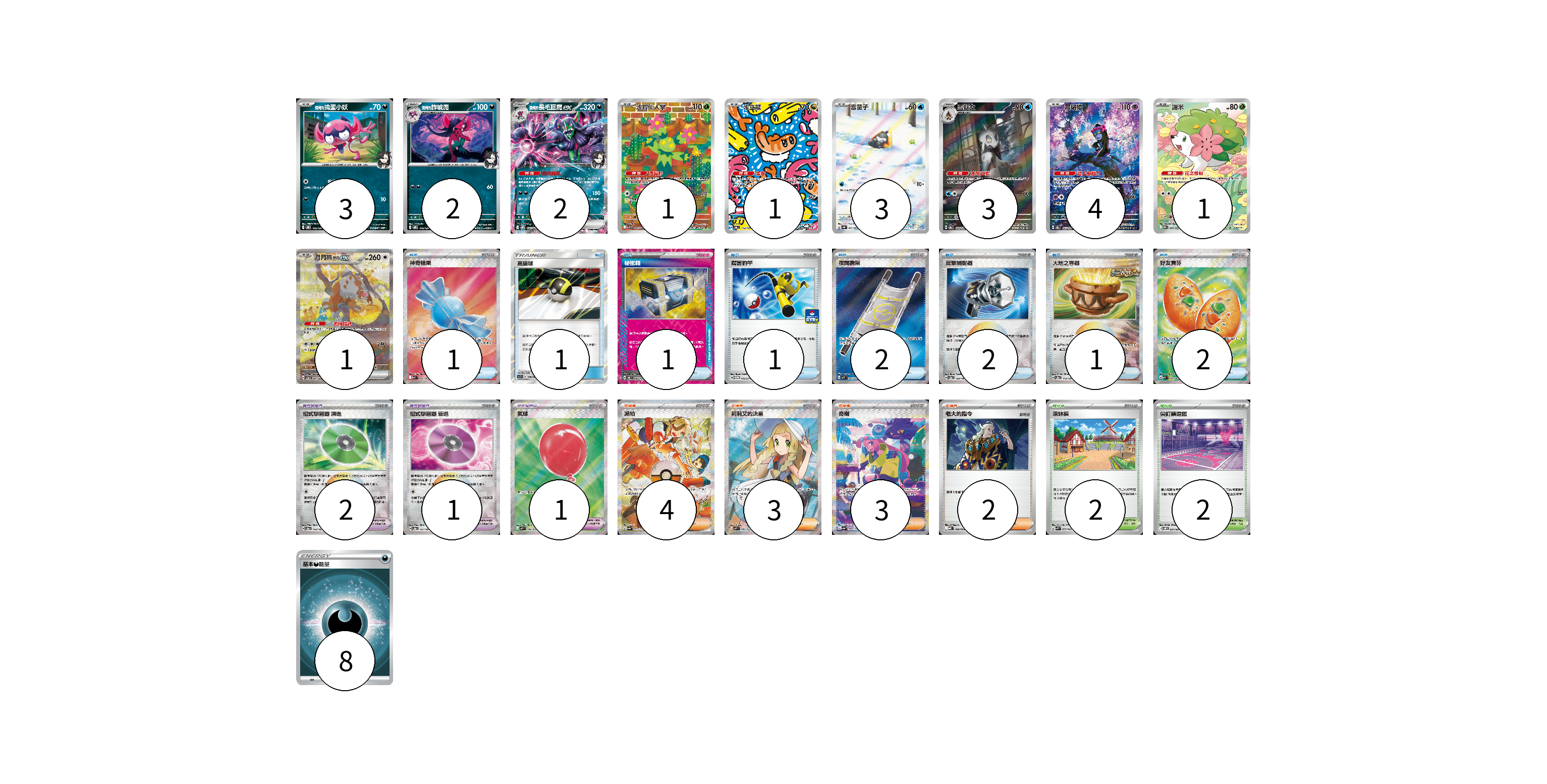 牌組構築方案 以此牌組為基礎新構築牌組 顯示卡面 顯示列表 寶可夢卡(21) 3 2 2 1 1 3 3 4 1 1 寶可夢道具(4) 2 1 1 物品卡(11) 1 1 1 1 2 2 1 2 支援者卡(12) 4 3 3 2 競技場卡(4) 2 2 能量卡(8) 8 寶可夢卡(21) 卡牌名稱 張數 卡牌名稱 張數 <瑪俐的>搗蛋小妖 SVOM 005/021 03 <瑪俐的>詐唬魔 SVOM 006/021 02 <瑪俐的>長毛巨魔ex SVOM 007/021 02 沙鈴仙人掌 SV9 101/100 01 米立龍 SV6 112/101 01 雪童子 SV3a 063/062 03 雪妖女 SV6 104/101 03 願增猿 SV6 107/101 04 謝米 SV9a 066/063 01 月月熊 赫月 ex SV5a 091/066 01 寶可夢道具(4) 卡牌名稱 張數 卡牌名稱 張數 招式學習器 演進 SV8a 160/187 02 招式學習器 衰退 SV8a 161/187 01 氣球 M1L 084/063 01 物品卡(11) 卡牌名稱 張數 卡牌名稱 張數 神奇糖果 M1S 082/063 01 高級球 AS5b 178/186 01 秘密箱 SV6 092/101 01 厲害釣竿 SV-P 112/SV-P 01 夜間擔架 M1L 083/063 02 反擊捕捉器 SV8a 139/187 02 大地之容器 SV8a 143/187 01 好友寶芬 M1S 081/063 02 支援者卡(12) 卡牌名稱 張數 卡牌名稱 張數 派帕 SV4a 353/190 04 莉莉艾的決意 M1L 086/063 03 奇樹 SV4a 350/190 03 老大的指令 MBD 020/022 02 競技場卡(4) 卡牌名稱 張數 卡牌名稱 張數 深缽鎮 SVK 039/042 02 尖釘鎮道館 SVOM 021/021 02 能量卡(8) 卡牌名稱 張數 卡牌名稱 張數 基本【惡】能量 SI DAR 08 以此牌組為基礎新構築牌組 牌組編碼 gVracq-fYahAt-PHKoYF copy 列印牌組單 牌組編碼已複製 分享至SNS
