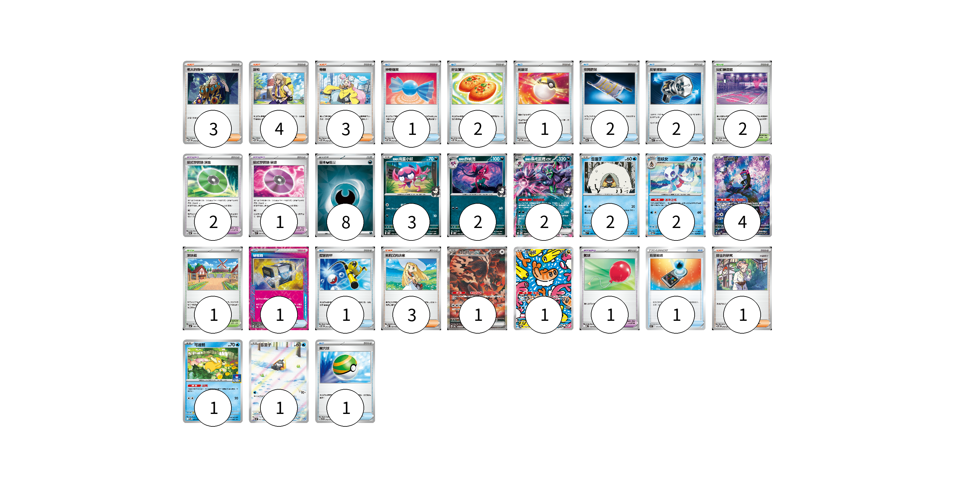 牌組構築方案 以此牌組為基礎新構築牌組 顯示卡面 顯示列表 寶可夢卡(19) 3 2 2 2 2 4 1 1 1 1 寶可夢道具(4) 2 1 1 物品卡(12) 1 2 1 2 2 1 1 1 1 支援者卡(14) 3 4 3 3 1 競技場卡(3) 2 1 能量卡(8) 8 寶可夢卡(19) 卡牌名稱 張數 卡牌名稱 張數 <瑪俐的>搗蛋小妖 SVOM 005/021 03 <瑪俐的>詐唬魔 SVOM 006/021 02 <瑪俐的>長毛巨魔ex SVOM 007/021 02 雪童子 SVM 034/175 02 雪妖女 SV6 033/101 02 願增猿 SV6 107/101 04 月月熊 赫月ex SV8a 225/187 01 米立龍 SV6 112/101 01 可達鴨 SV-P 220/SV-P 01 雪童子 SV3a 063/062 01 寶可夢道具(4) 卡牌名稱 張數 卡牌名稱 張數 招式學習器 演進 SV8a 160/187 02 招式學習器 衰退 SVK 026/042 01 氣球 MBD 018/022 01 物品卡(12) 卡牌名稱 張數 卡牌名稱 張數 神奇糖果 SVOD 013/020 01 好友寶芬 SVOD 011/020 02 高級球 SVOD 012/020 01 夜間擔架 SV8a 151/187 02 反擊捕捉器 SVK 009/042 02 秘密箱 SV6 092/101 01 厲害釣竿 SVOM 011/021 01 能量輸送 SN 013/024 01 巢穴球 SVTG 012/019 01 支援者卡(14) 卡牌名稱 張數 卡牌名稱 張數 老大的指令 SVOD 019/020 03 派帕 SVOD 018/020 04 奇樹 SVOM 018/021 03 莉莉艾的決意 MBD 021/022 03 博士的研究 SVOM 019/021 01 競技場卡(3) 卡牌名稱 張數 卡牌名稱 張數 尖釘鎮道館 SVOM 021/021 02 深缽鎮 SV4a 185/190 01 能量卡(8) 卡牌名稱 張數 卡牌名稱 張數 基本【惡】能量 SVOM DAR 08 以此牌組為基礎新構築牌組 牌組編碼 gWNlQl-BPBXeI-cNjVDI copy 列印牌組單 牌組編碼已複製 分享至SNS