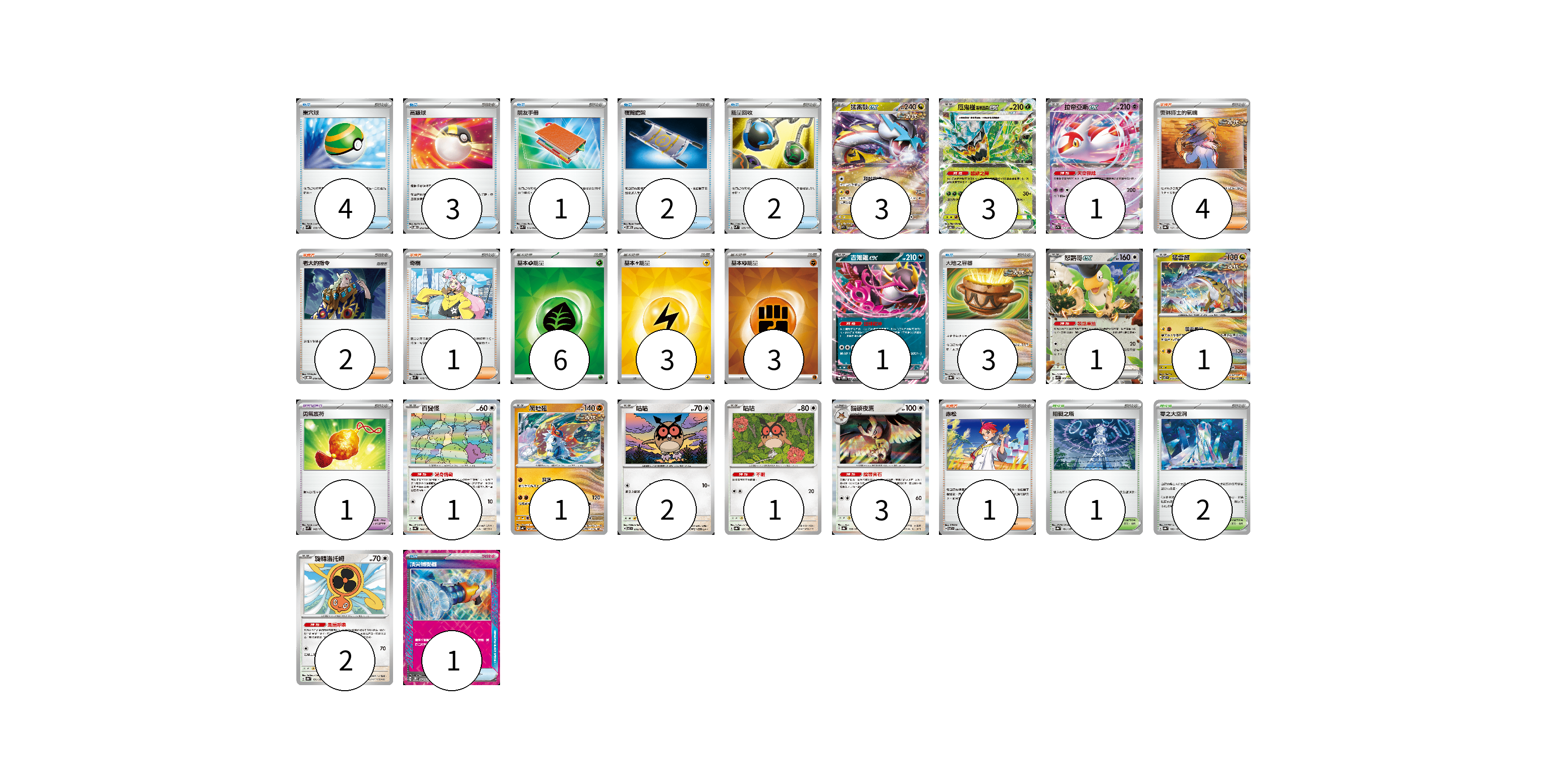 牌組構築方案 以此牌組為基礎新構築牌組 顯示卡面 顯示列表 寶可夢卡(20) 3 3 1 1 1 1 1 1 2 1 3 2 寶可夢道具(1) 1 物品卡(16) 4 3 1 2 2 3 1 支援者卡(8) 4 2 1 1 競技場卡(3) 1 2 能量卡(12) 6 3 3 寶可夢卡(20) 卡牌名稱 張數 卡牌名稱 張數 猛雷鼓ex SV5K 053/071 03 厄鬼椪 碧草面具ex SV6 016/101 03 拉帝亞斯ex SV7a 019/064 01 吉雉雞ex SVOD 004/020 01 怒鸚哥ex SVK 006/042 01 猛雷鼓 SV7 075/102 01 百變怪 SV4a 144/190 01 爬地翅 SV4K 041/066 01 咕咕 SV7 076/102 02 咕咕 SV8a 127/187 01 貓頭夜鷹 SV8a 128/187 03 旋轉洛托姆 SV8a 131/187 02 寶可夢道具(1) 卡牌名稱 張數 卡牌名稱 張數 勇氣護符 SVM 142/175 01 物品卡(16) 卡牌名稱 張數 卡牌名稱 張數 巢穴球 SVM 133/175 04 高級球 SVOD 012/020 03 朋友手冊 SVK 014/042 01 夜間擔架 SVOM 016/021 02 能量回收 SVM 125/175 02 大地之容器 SV8a 143/187 03 頂尖捕捉器 SV5M 062/071 01 支援者卡(8) 卡牌名稱 張數 卡牌名稱 張數 奧琳博士的氣魄 SV8a 167/187 04 老大的指令 SVOD 019/020 02 奇樹 SVM 160/175 01 赤松 SV7 097/102 01 競技場卡(3) 卡牌名稱 張數 卡牌名稱 張數 阻礙之塔 SV8a 181/187 01 零之大空洞 SV8a 182/187 02 能量卡(12) 卡牌名稱 張數 卡牌名稱 張數 基本【草】能量 SVK GRA 06 基本【雷】能量 SVK LIG 03 基本【鬥】能量 SVK FIG 03 以此牌組為基礎新構築牌組 牌組編碼 gYKwHm-ldoROA-cieXPX copy 列印牌組單 牌組編碼已複製 分享至SNS