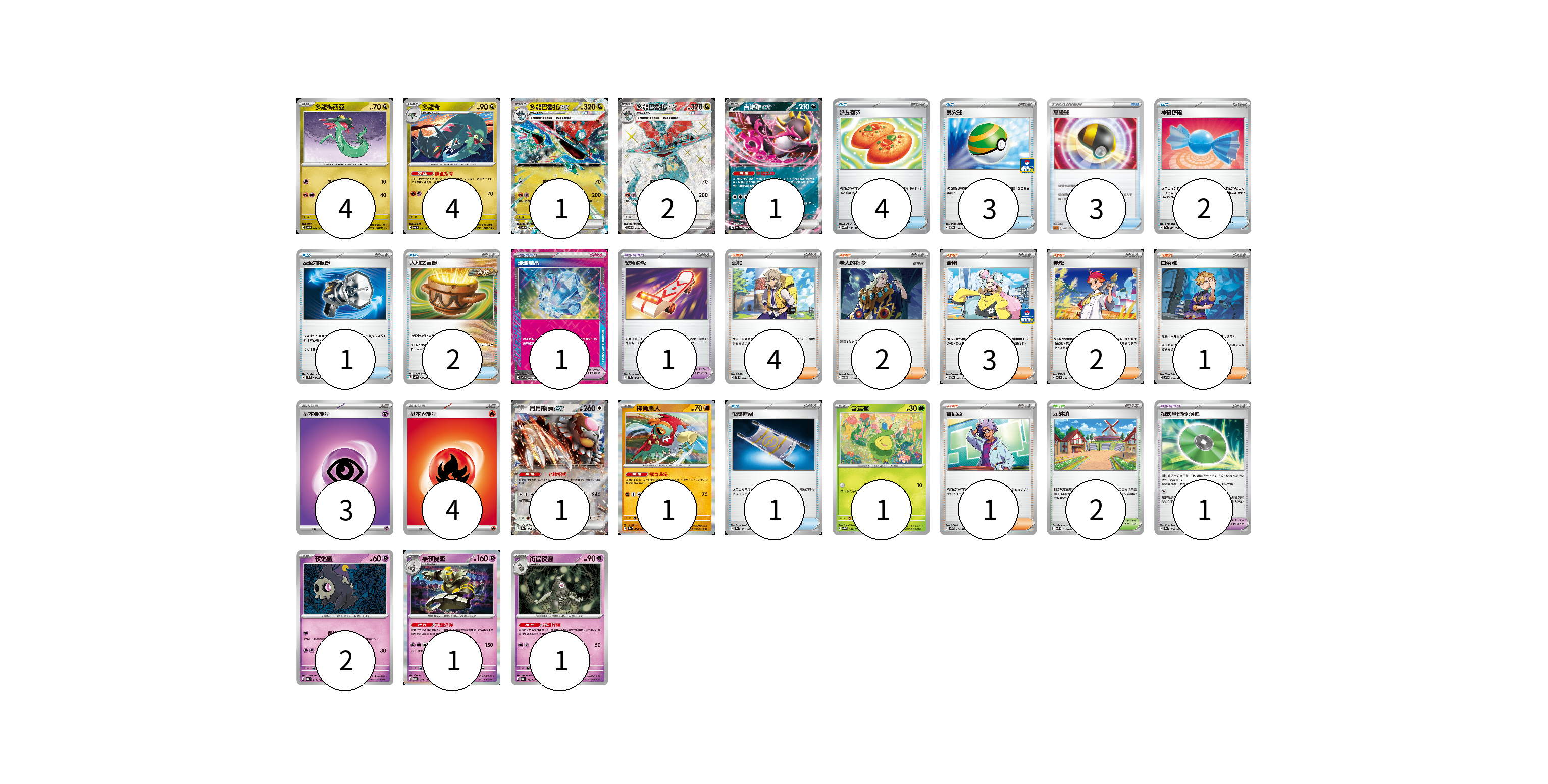 牌組構築方案 以此牌組為基礎新構築牌組 顯示卡面 顯示列表 寶可夢卡(19) 4 4 1 2 1 1 1 1 2 1 1 寶可夢道具(3) 1 1 1 物品卡(16) 4 3 3 2 1 2 1 支援者卡(13) 4 2 3 2 1 1 競技場卡(2) 2 能量卡(7) 3 4 寶可夢卡(19) 卡牌名稱 張數 卡牌名稱 張數 多龍梅西亞 SV6 079/101 04 多龍奇 SV6 080/101 04 多龍巴魯托ex SV6 081/101 01 多龍巴魯托ex SV6 120/101 02 吉雉雞ex SV6a 038/064 01 月月熊 赫月ex SV8a 134/187 01 摔角鷹人 SV8a 084/187 01 含羞苞 SV8a 001/187 01 夜巡靈 SV8a 064/187 02 黑夜魔靈 SV8a 066/187 01 彷徨夜靈 SV8a 065/187 01 寶可夢道具(3) 卡牌名稱 張數 卡牌名稱 張數 璀璨結晶 SV7 094/102 01 緊急滑板 SV5K 064/071 01 招式學習器 演進 SV8a 160/187 01 物品卡(16) 卡牌名稱 張數 卡牌名稱 張數 好友寶芬 SV5K 063/071 04 巢穴球 SV-P 091/SV-P 03 高級球 SLL 013/021 03 神奇糖果 SV3a 053/062 02 反擊捕捉器 SV4M 059/066 01 大地之容器 SV4K 060/066 02 夜間擔架 SV8a 151/187 01 支援者卡(13) 卡牌名稱 張數 卡牌名稱 張數 派帕 SVTL 020/021 04 老大的指令 SVTM 020/022 02 奇樹 SV-P 106/SV-P 03 赤松 SV7 097/102 02 白蕾雅 SV7 100/102 01 吉尼亞 SV1S 074/078 01 競技場卡(2) 卡牌名稱 張數 卡牌名稱 張數 深缽鎮 SVF 036/038 02 能量卡(7) 卡牌名稱 張數 卡牌名稱 張數 基本超能量 sv-p PSY 03 基本火能量 sv-p FIR 04 以此牌組為基礎新構築牌組 牌組編碼 gZTpqG-NwaLWM-bBsQMJ copy 列印牌組單 牌組編碼已複製 分享至SNS
