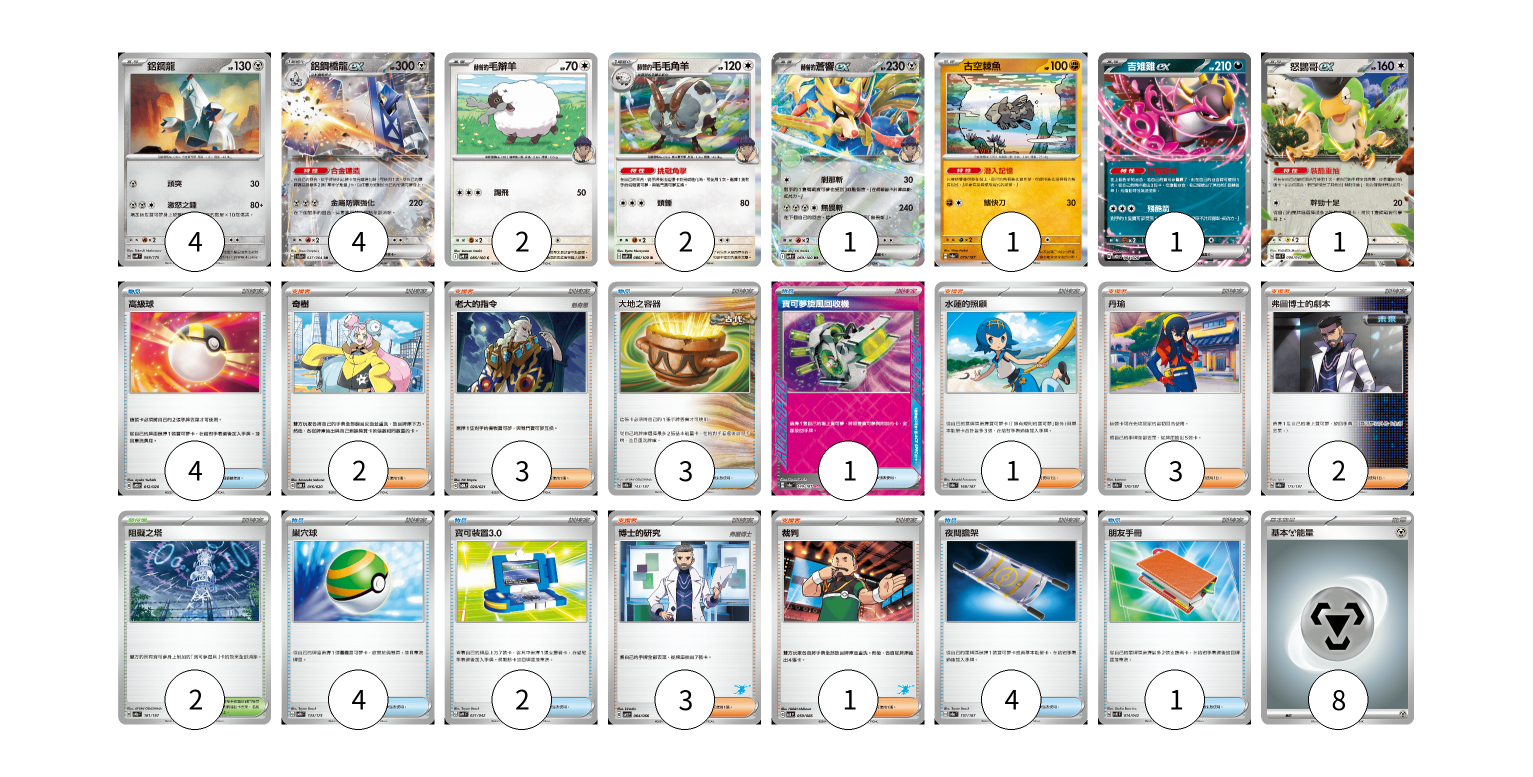 牌組構築方案 以此牌組為基礎新構築牌組 顯示卡面 顯示列表 寶可夢卡(16) 4 4 2 2 1 1 1 1 物品卡(19) 4 3 1 4 2 4 1 支援者卡(15) 2 3 1 3 2 3 1 競技場卡(2) 2 能量卡(8) 8 寶可夢卡(16) 卡牌名稱 張數 卡牌名稱 張數 鋁鋼龍 SVM 088/175 04 鋁鋼橋龍ex SV7a 037/064 04 赫普的毛辮羊 SV9 085/100 02 赫普的毛毛角羊 SV9 086/100 02 赫普的蒼響ex SV9 069/100 01 古空棘魚 SV8a 079/187 01 吉雉雞ex SVOD 004/020 01 怒鸚哥ex SVK 006/042 01 物品卡(19) 卡牌名稱 張數 卡牌名稱 張數 高級球 SVOD 012/020 04 大地之容器 SV8a 143/187 03 寶可夢旋風回收機 SV8a 149/187 01 巢穴球 SVM 133/175 04 寶可裝置3.0 SVK 021/042 02 夜間擔架 SV8a 151/187 04 朋友手冊 SVK 014/042 01 支援者卡(15) 卡牌名稱 張數 卡牌名稱 張數 奇樹 SVOD 016/020 02 老大的指令 SVOM 020/021 03 水蓮的照顧 SV8a 168/187 01 丹瑜 SV8a 170/187 03 弗圖博士的劇本 SV8a 175/187 02 博士的研究 SVI 064/066 03 裁判 SVI 059/066 01 競技場卡(2) 卡牌名稱 張數 卡牌名稱 張數 阻礙之塔 SV8a 181/187 02 能量卡(8) 卡牌名稱 張數 卡牌名稱 張數 基本【鋼】能量 SVF MET 08 以此牌組為基礎新構築牌組 牌組編碼 gbGidG-nRrnLk-bIVnCo copy 列印牌組單 牌組編碼已複製 分享至SNS