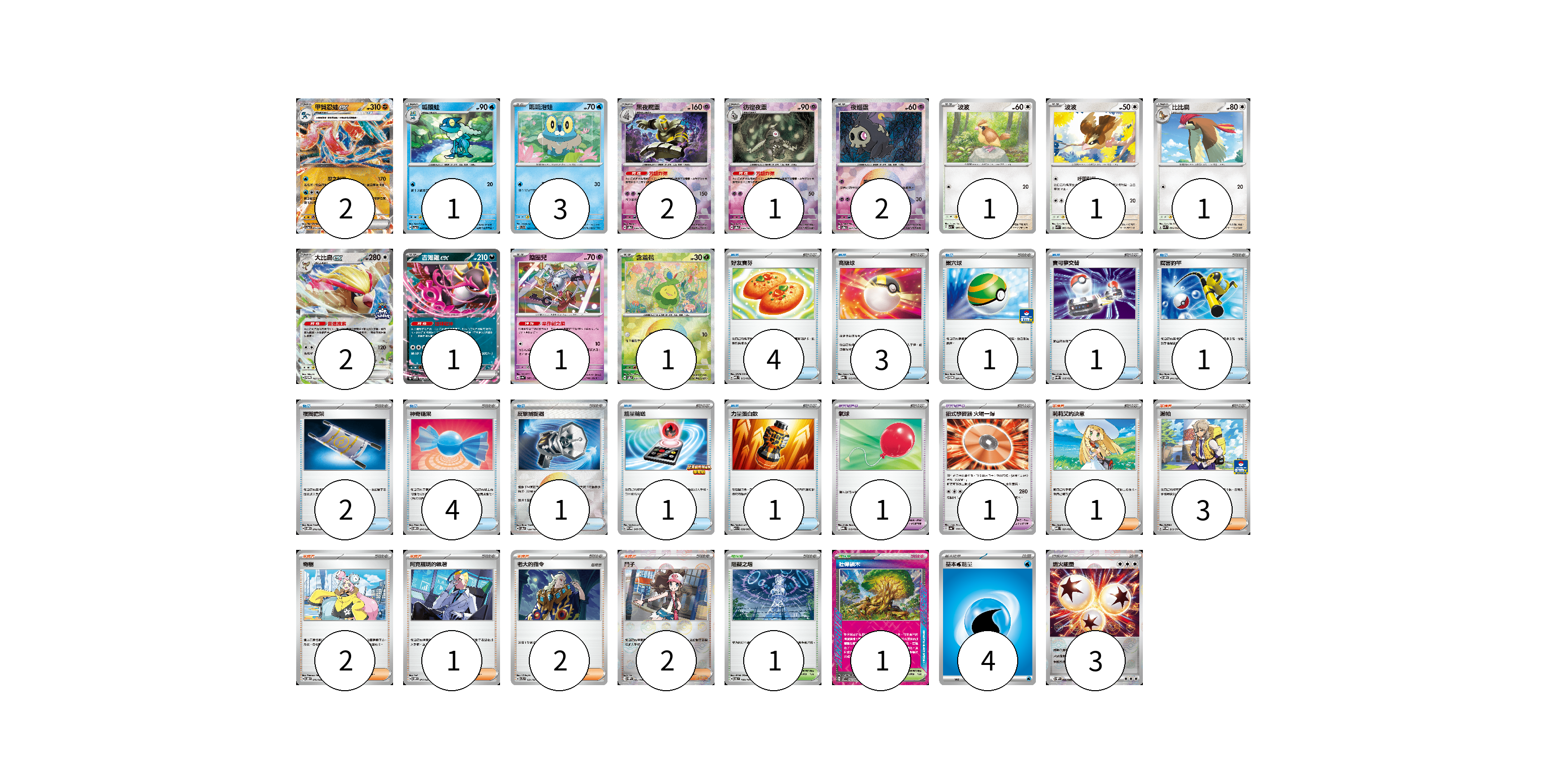 牌組構築方案 以此牌組為基礎新構築牌組 顯示卡面 顯示列表 寶可夢卡(19) 2 1 3 2 1 2 1 1 1 2 1 1 1 寶可夢道具(2) 1 1 物品卡(19) 4 3 1 1 1 2 4 1 1 1 支援者卡(11) 1 3 2 1 2 2 競技場卡(2) 1 1 能量卡(7) 4 3 寶可夢卡(19) 卡牌名稱 張數 卡牌名稱 張數 甲賀忍蛙ex SV5a 045/066 02 呱頭蛙 SV5a 024/066 01 呱呱泡蛙 SVD 027/139 03 黑夜魔靈 SV8a 066/187 02 彷徨夜靈 SV8a 065/187 01 夜巡靈 SV8a 064/187 02 波波 SV3 087/108 01 波波 SVK 003/042 01 比比鳥 SVK 004/042 01 大比鳥ex SV-P 183/SV-P 02 吉雉雞ex SVOM 009/021 01 鑰圈兒 SV4a 087/190 01 含羞苞 SV8a 001/187 01 寶可夢道具(2) 卡牌名稱 張數 卡牌名稱 張數 氣球 MBG 019/022 01 招式學習器 火場一爆 SV4a 170/190 01 物品卡(19) 卡牌名稱 張數 卡牌名稱 張數 好友寶芬 MBD 013/022 04 高級球 MBG 012/022 03 巢穴球 SV-P 091/SV-P 01 寶可夢交替 SVQP 016/023 01 厲害釣竿 SVOM 011/021 01 夜間擔架 SVOM 016/021 02 神奇糖果 SVOM 014/021 04 反擊捕捉器 SV8a 139/187 01 能量輸送 SV-P 249/SV-P 01 力量蛋白飲 M1L 058/063 01 支援者卡(11) 卡牌名稱 張數 卡牌名稱 張數 莉莉艾的決意 MBD 021/022 01 派帕 SV-P 213/SV-P 03 奇樹 SVOD 016/020 02 阿克羅瑪的執著 SVOM 017/021 01 老大的指令 SVTL 021/021 02 鬥子 SV11W 085/086 02 競技場卡(2) 卡牌名稱 張數 卡牌名稱 張數 阻礙之塔 SV6 100/101 01 壯偉碩木 SV7 101/102 01 能量卡(7) 卡牌名稱 張數 卡牌名稱 張數 基本水能量 sv-p WAT 04 燃火能量 SV11W 086/086 03 以此牌組為基礎新構築牌組 牌組編碼 gcMOwT-aJpwXm-MNikkC copy 列印牌組單 牌組編碼已複製 分享至SNS
