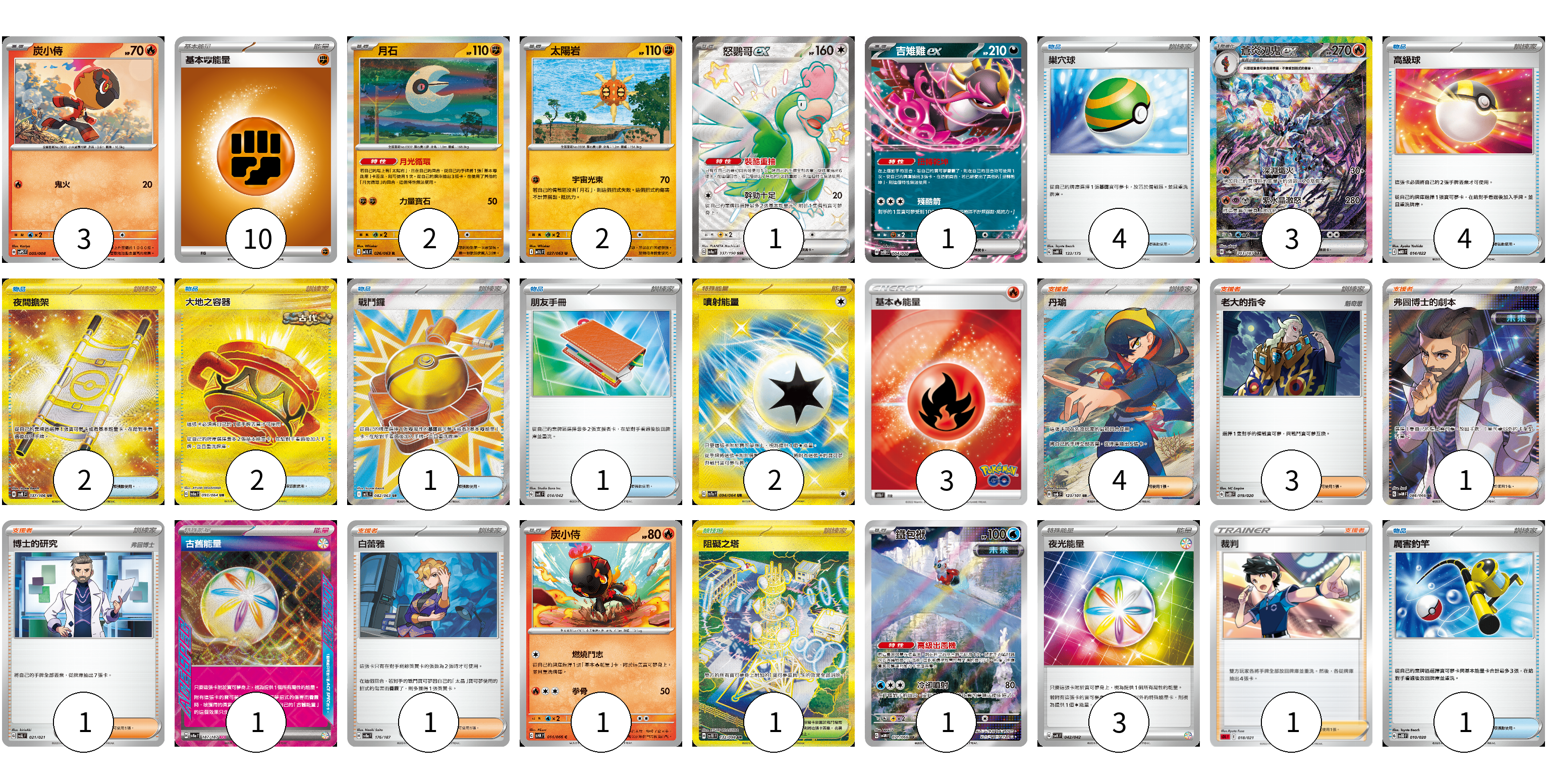 牌組構築方案 以此牌組為基礎新構築牌組 顯示卡面 顯示列表 寶可夢卡(14) 3 2 2 1 1 3 1 1 物品卡(15) 4 4 2 2 1 1 1 支援者卡(11) 4 3 1 1 1 1 競技場卡(1) 1 能量卡(19) 10 2 3 1 3 寶可夢卡(14) 卡牌名稱 張數 卡牌名稱 張數 炭小侍 SVPS 005/008 03 月石 M1L 026/063 02 太陽岩 M1L 027/063 02 怒鸚哥ex SV4a 337/190 01 吉雉雞ex SVOD 004/020 01 蒼炎刃鬼ex SV8a 203/187 03 炭小侍 SV4K 014/066 01 鐵包袱 SV4M 071/066 01 物品卡(15) 卡牌名稱 張數 卡牌名稱 張數 巢穴球 SVM 133/175 04 高級球 MBD 014/022 04 夜間擔架 SV8 137/106 02 大地之容器 SV6a 093/064 02 戰鬥鑼 M1L 082/063 01 朋友手冊 SVK 014/042 01 厲害釣竿 SVOD 010/020 01 支援者卡(11) 卡牌名稱 張數 卡牌名稱 張數 丹瑜 SV6 123/101 04 老大的指令 SVOD 019/020 03 弗圖博士的劇本 SV4M 086/066 01 博士的研究(弗圖博士) SVAL 021/021 01 白蕾雅 SV8a 176/187 01 裁判 SDL 018/021 01 競技場卡(1) 卡牌名稱 張數 卡牌名稱 張數 阻礙之塔 SV10 132/098 01 能量卡(19) 卡牌名稱 張數 卡牌名稱 張數 基本【鬥】能量 M-P FIG 10 噴射能量 SV7a 094/064 02 基本火能量 S10b FIR 03 古舊能量 SV8a 187/187 01 夜光能量 SVK 042/042 03 以此牌組為基礎新構築牌組 牌組編碼 gfVxrC-fJHEfq-Rtmpbn copy 列印牌組單 牌組編碼已複製 分享至SNS