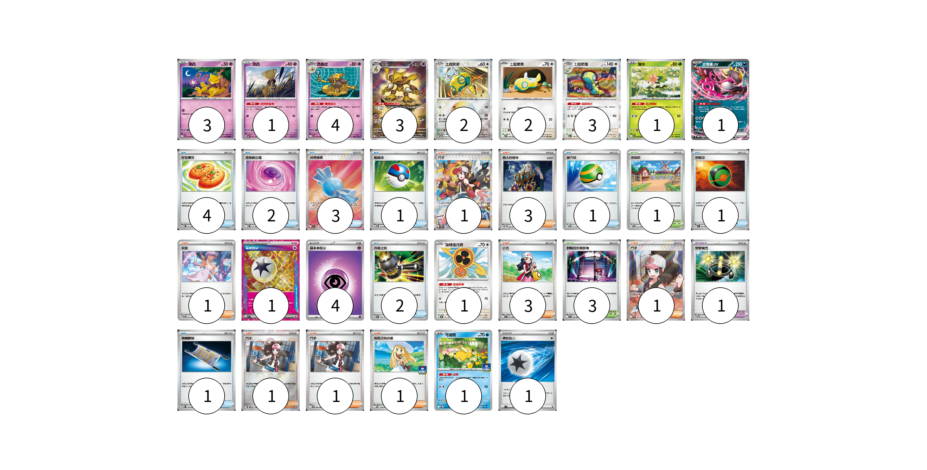 牌組構築方案 以此牌組為基礎新構築牌組 顯示卡面 顯示列表 寶可夢卡(22) 3 1 4 3 2 2 3 1 1 1 1 寶可夢道具(1) 1 物品卡(15) 4 2 3 1 1 1 2 1 支援者卡(12) 1 3 1 3 1 1 1 1 競技場卡(4) 1 3 能量卡(6) 1 4 1 寶可夢卡(22) 卡牌名稱 張數 卡牌名稱 張數 凱西 M1S 036/063 03 凱西 SV8a 057/187 01 勇基拉 M1S 037/063 04 胡地 M1S 071/063 03 土龍弟弟 SV8a 129/187 02 土龍弟弟 SV9 078/100 02 土龍節節 SV8a 130/187 03 謝米 SV9a 006/063 01 吉雉雞ex SVOD 004/020 01 旋轉洛托姆 SV8a 131/187 01 可達鴨 SV-P 220/SV-P 01 寶可夢道具(1) 卡牌名稱 張數 卡牌名稱 張數 學習裝置 SVTM 016/022 01 物品卡(15) 卡牌名稱 張數 卡牌名稱 張數 好友寶芬 MBD 013/022 04 奇跡修正檔 MBD 017/022 02 神奇糖果 M1S 082/063 03 超級球 SVQL 014/022 01 巢穴球 SVEM 012/020 01 黑暗球 SV7a 054/064 01 改造之錘 SV8a 138/187 02 夜間擔架 MBD 016/022 01 支援者卡(12) 卡牌名稱 張數 卡牌名稱 張數 鬥子 SV11W 173/086 01 老大的指令 SVOM 020/021 03 莉普 SVTS 021/022 01 小光 M2 077/080 03 鬥子 SV11W 166/086 01 鬥子 SV11W 085/086 01 鬥子 SV11W 085/086 01 莉莉艾的決意 M-P 018/M-P 01 競技場卡(4) 卡牌名稱 張數 卡牌名稱 張數 深缽鎮 SVF 036/038 01 對戰圓形競技場 M2 079/080 03 能量卡(6) 卡牌名稱 張數 卡牌名稱 張數 富裕能量 SV7a 064/064 01 基本【超】能量 M-P PSY 04 噴射能量 SV1a 072/073 01 以此牌組為基礎新構築牌組 牌組編碼 ghAQvJ-wFVNZx-UJRupt copy 列印牌組單 牌組編碼已複製 分享至SNS