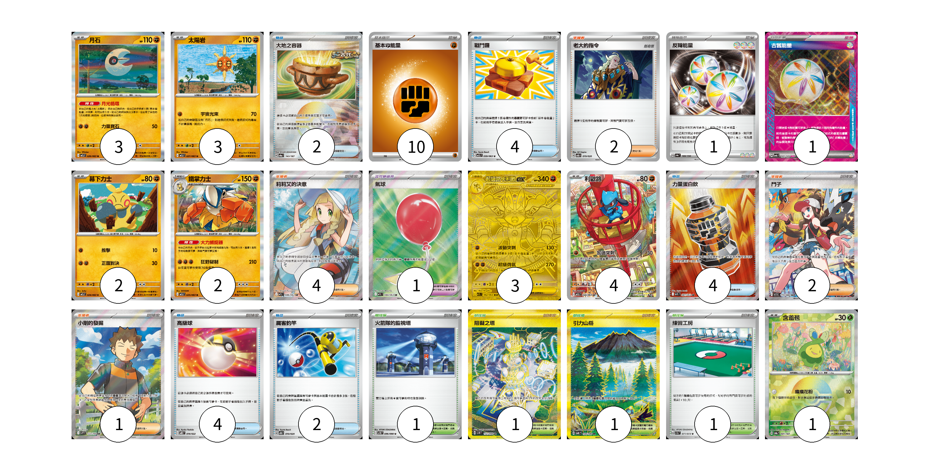 牌組構築方案 以此牌組為基礎新構築牌組 顯示卡面 顯示列表 寶可夢卡(18) 3 3 2 2 3 4 1 寶可夢道具(1) 1 物品卡(16) 2 4 4 4 2 支援者卡(9) 2 4 2 1 競技場卡(4) 1 1 1 1 能量卡(12) 10 1 1 寶可夢卡(18) 卡牌名稱 張數 卡牌名稱 張數 月石 M1L 026/063 03 太陽岩 M1L 027/063 03 幕下力士 M1L 024/063 02 鐵掌力士 M1L 025/063 02 超級路卡利歐ex M1L 092/063 03 利歐路 M1L 068/063 04 含羞苞 SV8a 001/187 01 寶可夢道具(1) 卡牌名稱 張數 卡牌名稱 張數 氣球 M1L 084/063 01 物品卡(16) 卡牌名稱 張數 卡牌名稱 張數 大地之容器 SV8a 143/187 02 戰鬥鑼 M1L 059/063 04 力量蛋白飲 M1L 081/063 04 高級球 MBD 014/022 04 厲害釣竿 SVOD 010/020 02 支援者卡(9) 卡牌名稱 張數 卡牌名稱 張數 老大的指令 SVOD 019/020 02 莉莉艾的決意 M1L 086/063 04 鬥子 SV11W 173/086 02 小剛的發掘 SV9 123/100 01 競技場卡(4) 卡牌名稱 張數 卡牌名稱 張數 火箭隊的監視塔 SV10 096/098 01 阻礙之塔 SV10 132/098 01 引力山岳 SV8 138/106 01 練習工房 SV1a 071/073 01 能量卡(12) 卡牌名稱 張數 卡牌名稱 張數 基本【鬥】能量 M-P FIG 10 反轉能量 SV4a 189/190 01 古舊能量 SV6 101/101 01 以此牌組為基礎新構築牌組 牌組編碼 ghImBZ-tkpNJI-iRJQgQ copy 列印牌組單 牌組編碼已複製 分享至SNS