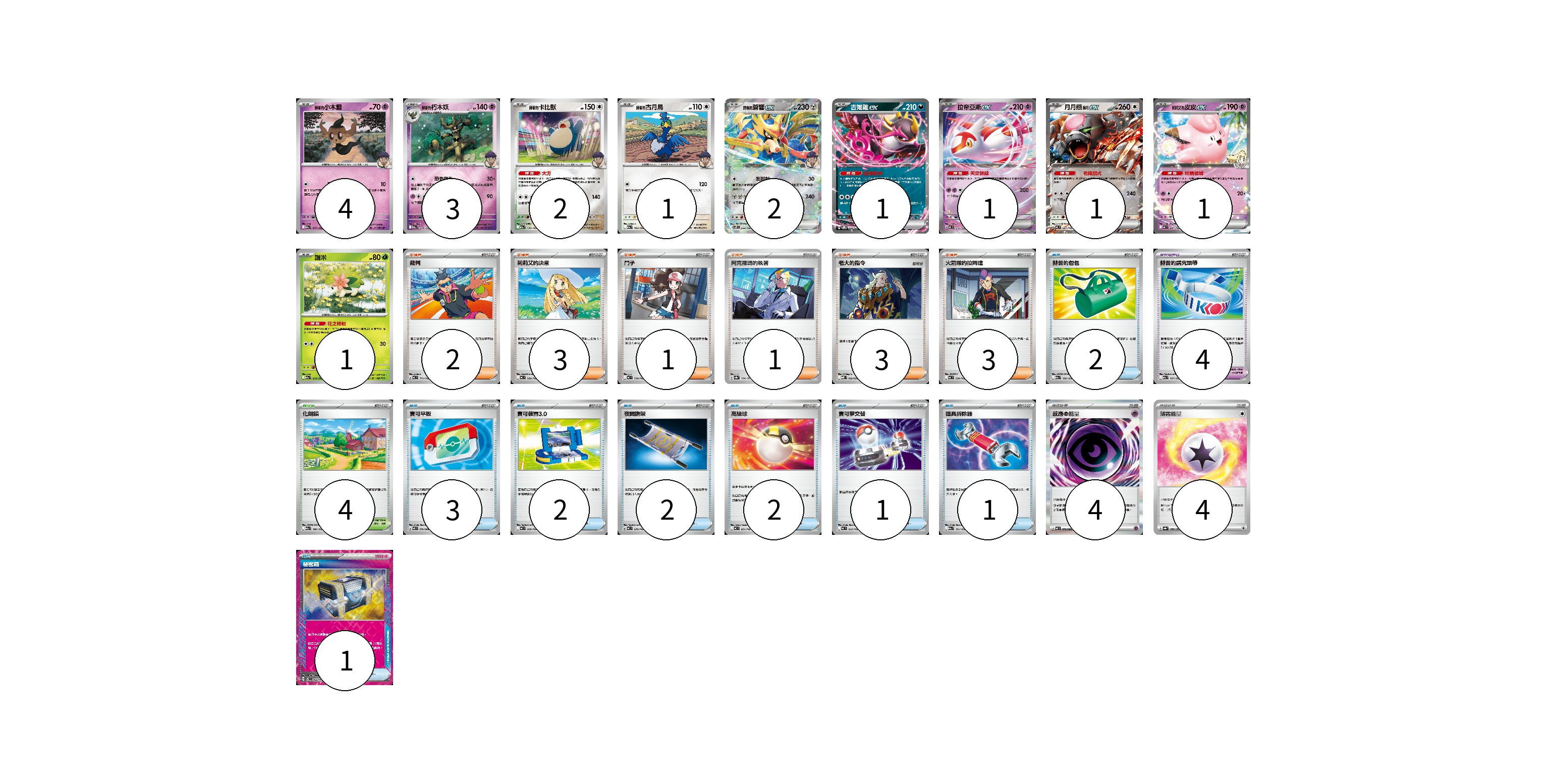 牌組構築方案 以此牌組為基礎新構築牌組 顯示卡面 顯示列表 寶可夢卡(17) 4 3 2 1 2 1 1 1 1 1 寶可夢道具(4) 4 物品卡(14) 2 3 2 2 2 1 1 1 支援者卡(13) 2 3 1 1 3 3 競技場卡(4) 4 能量卡(8) 4 4 寶可夢卡(17) 卡牌名稱 張數 卡牌名稱 張數 赫普的小木靈 M2a 077/193 04 赫普的朽木妖 M2a 078/193 03 赫普的卡比獸 M2a 136/193 02 赫普的古月鳥 M2a 143/193 01 赫普的蒼響ex SV9 069/100 02 吉雉雞ex SVOM 009/021 01 拉帝亞斯ex MC 312/742 01 月月熊 赫月 ex MC 625/742 01 <莉莉艾的>皮皮ex MC 287/742 01 謝米 M2a 012/193 01 寶可夢道具(4) 卡牌名稱 張數 卡牌名稱 張數 赫普的講究頭帶 M2a 167/193 04 物品卡(14) 卡牌名稱 張數 卡牌名稱 張數 赫普的包包 M2a 156/193 02 寶可平板 M3 070/080 03 寶可裝置3.0 MC 660/742 02 夜間擔架 MC 670/742 02 高級球 MC 651/742 02 寶可夢交替 MC 663/742 01 道具拆除器 M2a 151/193 01 秘密箱 SV6 092/101 01 支援者卡(13) 卡牌名稱 張數 卡牌名稱 張數 裁判 MC 711/742 02 莉莉艾的決意 MC 729/742 03 鬥子 MC 718/742 01 阿克羅瑪的執著 SV8a 164/187 01 老大的指令 MBD 020/022 03 火箭隊的拉姆達 MC 734/742 03 競技場卡(4) 卡牌名稱 張數 卡牌名稱 張數 化朗鎮 M2a 186/193 04 能量卡(8) 卡牌名稱 張數 卡牌名稱 張數 感應【超】能量 M3 079/080 04 薄霧能量 SV8a 186/187 04 以此牌組為基礎新構築牌組 牌組編碼 ghOfdl-Yorjti-duiFox copy 列印牌組單 牌組編碼已複製 分享至SNS