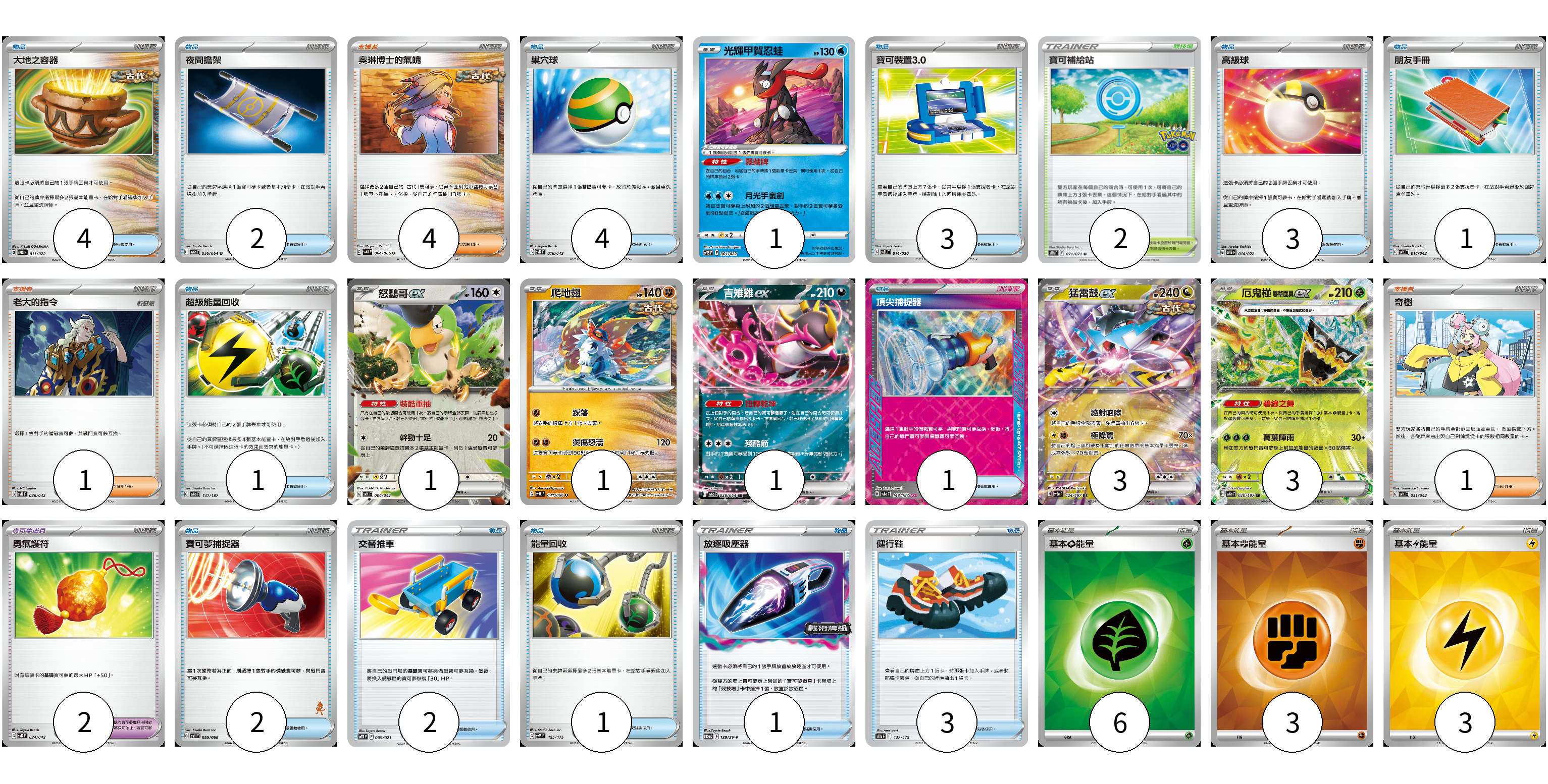 牌組構築方案 以此牌組為基礎新構築牌組 顯示卡面 顯示列表 寶可夢卡(10) 1 1 1 1 3 3 寶可夢道具(2) 2 物品卡(28) 4 2 4 3 3 1 1 1 2 2 1 1 3 支援者卡(6) 4 1 1 競技場卡(2) 2 能量卡(12) 6 3 3 寶可夢卡(10) 卡牌名稱 張數 卡牌名稱 張數 光輝甲賀忍蛙 SVTS 001/022 01 怒鸚哥ex SVK 006/042 01 爬地翅 SV4K 041/066 01 吉雉雞ex SV6a 038/064 01 猛雷鼓ex SV8a 124/187 03 厄鬼椪 碧草面具ex SV8a 020/187 03 寶可夢道具(2) 卡牌名稱 張數 卡牌名稱 張數 勇氣護符 SVK 024/042 02 物品卡(28) 卡牌名稱 張數 卡牌名稱 張數 大地之容器 SVTS 011/022 04 夜間擔架 SV6a 056/064 02 巢穴球 SVK 016/042 04 寶可裝置3.0 SVEL 014/020 03 高級球 SVTS 014/022 03 朋友手冊 SVK 014/042 01 超級能量回收 SV8a 141/187 01 頂尖捕捉器 SV8a 148/187 01 寶可夢捕捉器 SVI 055/066 02 交替推車 SVTR 009/021 02 能量回收 SVM 125/175 01 放逐吸塵器 SV-P 139/SV-P 01 健行鞋 S12a 137/172 03 支援者卡(6) 卡牌名稱 張數 卡牌名稱 張數 奧琳博士的氣魄 SV4K 064/066 04 老大的指令 SVK 036/042 01 奇樹 SVK 031/042 01 競技場卡(2) 卡牌名稱 張數 卡牌名稱 張數 寶可補給站 S10b 071/071 02 能量卡(12) 卡牌名稱 張數 卡牌名稱 張數 基本【草】能量 SVK GRA 06 基本【鬥】能量 SVK FIG 03 基本【雷】能量 SVK LIG 03 以此牌組為基礎新構築牌組 牌組編碼 ghUTHM-cusUpe-qiNMTV copy 列印牌組單 牌組編碼已複製 分享至SNS