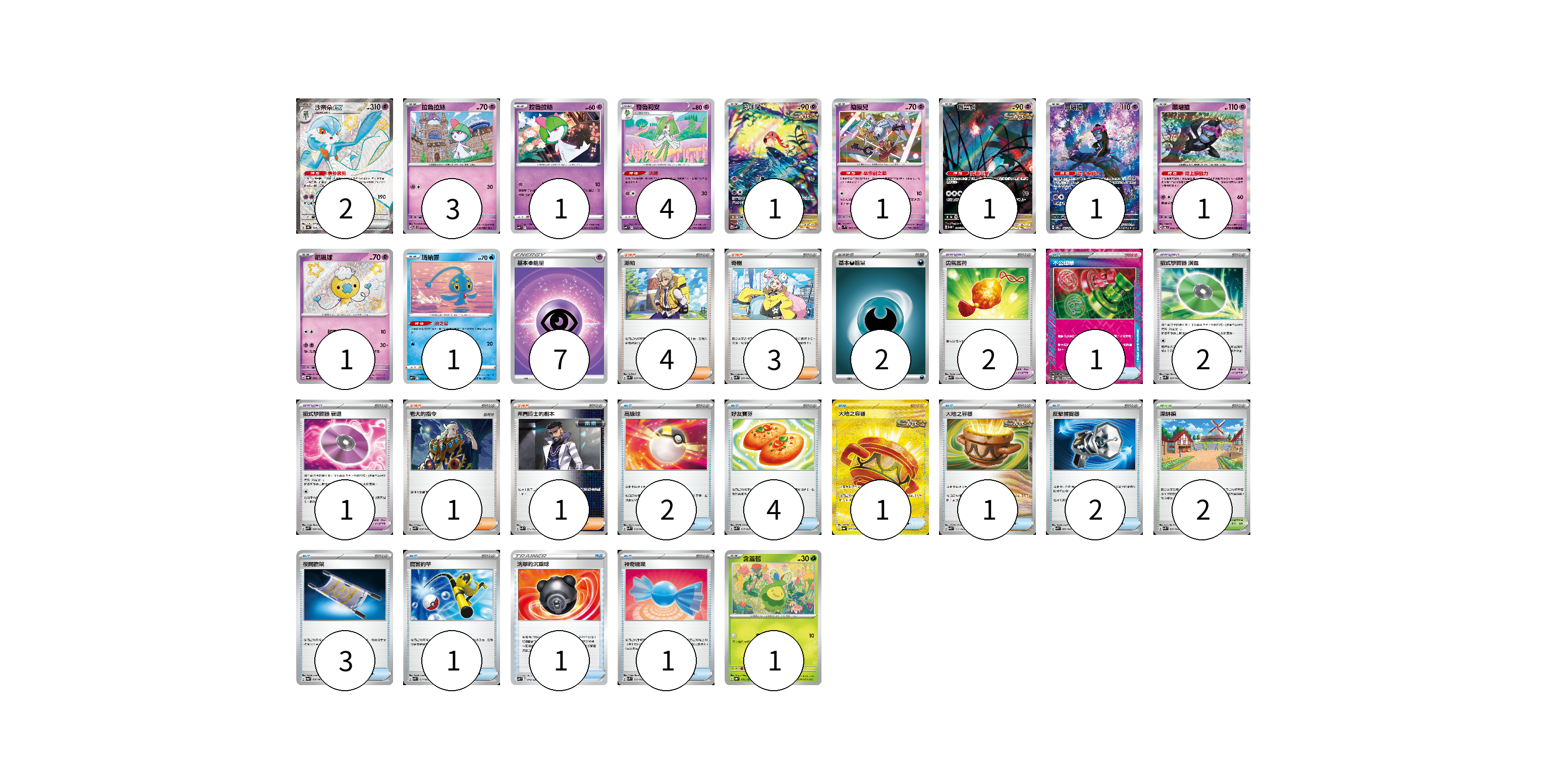 牌組構築方案 以此牌組為基礎新構築牌組 顯示卡面 顯示列表 寶可夢卡(18) 2 3 1 4 1 1 1 1 1 1 1 1 寶可夢道具(5) 2 2 1 物品卡(17) 1 2 4 1 1 2 3 1 1 1 支援者卡(9) 4 3 1 1 競技場卡(2) 2 能量卡(9) 7 2 寶可夢卡(18) 卡牌名稱 張數 卡牌名稱 張數 沙奈朵ex SV4a 328/190 02 拉魯拉絲 SVTS 002/022 03 拉魯拉絲 SVF 006/038 01 奇魯莉安 SVF 007/038 04 吼叫尾 SV4K 071/066 01 鑰圈兒 SV1V 045/078 01 振翼髮 SV5K 076/071 01 願增猿 SV6 107/101 01 願增猿 SV6 055/101 01 飄飄球 SV4a 260/190 01 瑪納霏 SVF 003/038 01 含羞苞 SV8a 001/187 01 寶可夢道具(5) 卡牌名稱 張數 卡牌名稱 張數 勇氣護符 SVK 024/042 02 招式學習器 演進 SVK 025/042 02 招式學習器 衰退 SVK 026/042 01 物品卡(17) 卡牌名稱 張數 卡牌名稱 張數 不公印章 SV5a 053/066 01 高級球 SVK 018/042 02 好友寶芬 SVK 015/042 04 大地之容器 SV6a 093/064 01 大地之容器 SVK 012/042 01 反擊捕捉器 SVK 009/042 02 夜間擔架 SV6a 056/064 03 厲害釣竿 SVK 011/042 01 洗翠的沉重球 SVF 019/038 01 神奇糖果 SVK 019/042 01 支援者卡(9) 卡牌名稱 張數 卡牌名稱 張數 派帕 SVK 035/042 04 奇樹 SVK 031/042 03 老大的指令 SVK 036/042 01 弗圖博士的劇本 SVK 034/042 01 競技場卡(2) 卡牌名稱 張數 卡牌名稱 張數 深缽鎮 SVK 039/042 02 能量卡(9) 卡牌名稱 張數 卡牌名稱 張數 基本【超】能量 SI PSY 07 基本【惡】能量 SVD DAR 02 以此牌組為基礎新構築牌組 牌組編碼 gjUpyT-ZpUglR-EDhjtZ copy 列印牌組單 牌組編碼已複製 分享至SNS