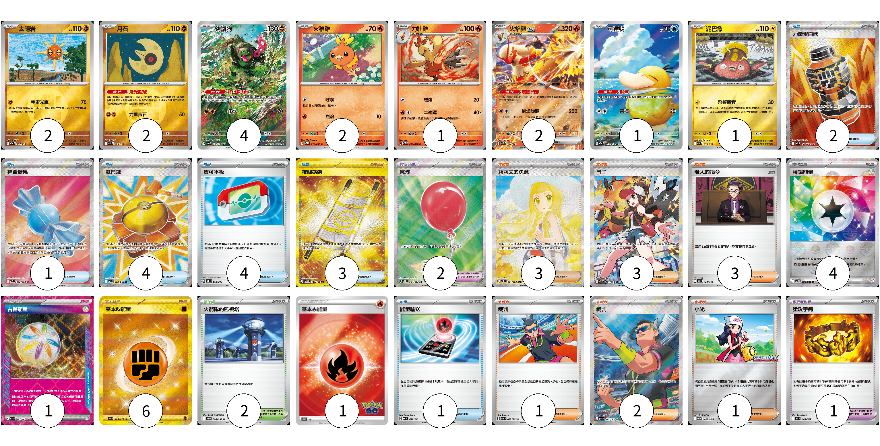 牌組構築方案 以此牌組為基礎新構築牌組 顯示卡面 顯示列表 寶可夢卡(15) 2 2 4 2 1 2 1 1 寶可夢道具(3) 2 1 物品卡(15) 2 1 4 4 3 1 支援者卡(13) 3 3 3 1 2 1 競技場卡(2) 2 能量卡(12) 4 1 6 1 寶可夢卡(15) 卡牌名稱 張數 卡牌名稱 張數 太陽岩 M2a 087/193 02 月石 M2a 086/193 02 夠讚狗 SV6 110/101 04 火稚雞 SV10 018/098 02 力壯雞 SV10 019/098 01 火焰雞ex SVM 016/175 02 可達鴨 M2a 199/193 01 泥巴魚 M2a 050/193 01 寶可夢道具(3) 卡牌名稱 張數 卡牌名稱 張數 氣球 M1L 084/063 02 猛攻手鐲 MC 689/742 01 物品卡(15) 卡牌名稱 張數 卡牌名稱 張數 力量蛋白飲 M1L 081/063 02 神奇糖果 M1S 082/063 01 戰鬥鑼 M1L 082/063 04 寶可平板 MC 662/742 04 夜間擔架 SV8 137/106 03 能量輸送 MC 639/742 01 支援者卡(13) 卡牌名稱 張數 卡牌名稱 張數 莉莉艾的決意 M1L 091/063 03 鬥子 SV11W 173/086 03 老大的指令 MC 724/742 03 裁判 SV9a 062/063 01 裁判 SV9a 083/063 02 小光 M-P 028/M-P 01 競技場卡(2) 卡牌名稱 張數 卡牌名稱 張數 火箭隊的監視塔 SV10 096/098 02 能量卡(12) 卡牌名稱 張數 卡牌名稱 張數 稜鏡能量 SV11B 086/086 04 古舊能量 SV8a 187/187 01 基本【鬥】能量 SV1S 108/078 06 基本火能量 S10b FIR 01 以此牌組為基礎新構築牌組 牌組編碼 gjnvpJ-YjcUeC-oINIUZ copy 列印牌組單 牌組編碼已複製 分享至SNS