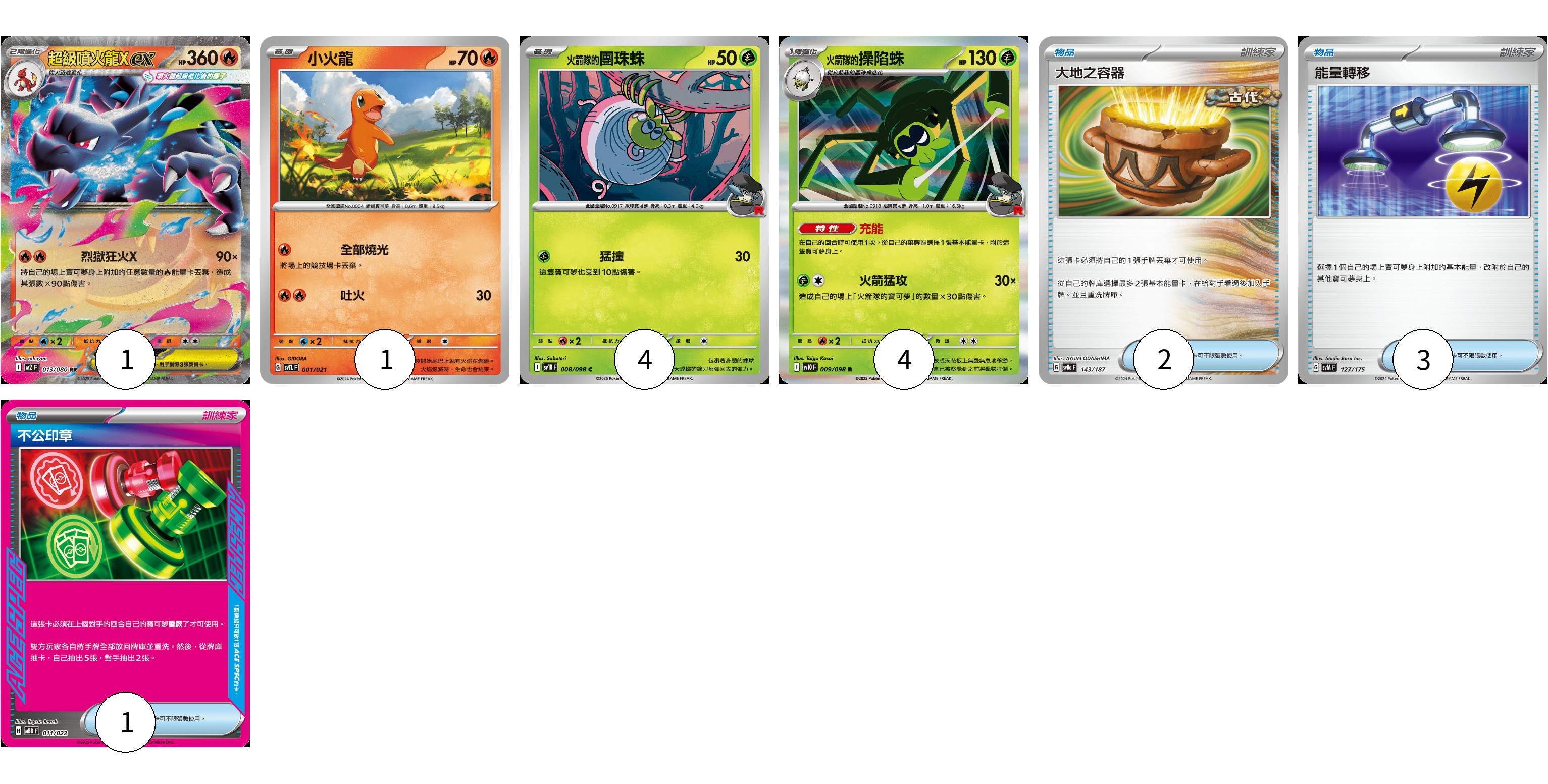 牌組構築方案 以此牌組為基礎新構築牌組 顯示卡面 顯示列表 寶可夢卡(10) 1 1 4 4 物品卡(6) 2 3 1 寶可夢卡(10) 卡牌名稱 張數 卡牌名稱 張數 超級噴火龍Xex M2 013/080 01 小火龍 SVTL 001/021 01 <火箭隊的>團珠蛛 SV10 008/098 04 <火箭隊的>操陷蛛 SV10 009/098 04 物品卡(6) 卡牌名稱 張數 卡牌名稱 張數 大地之容器 SV8a 143/187 02 能量轉移 SVM 127/175 03 不公印章 MBD 011/022 01 以此牌組為基礎新構築牌組 牌組編碼 gkJgRz-JNwQLy-OHGzPv copy 列印牌組單 牌組編碼已複製 分享至SNS