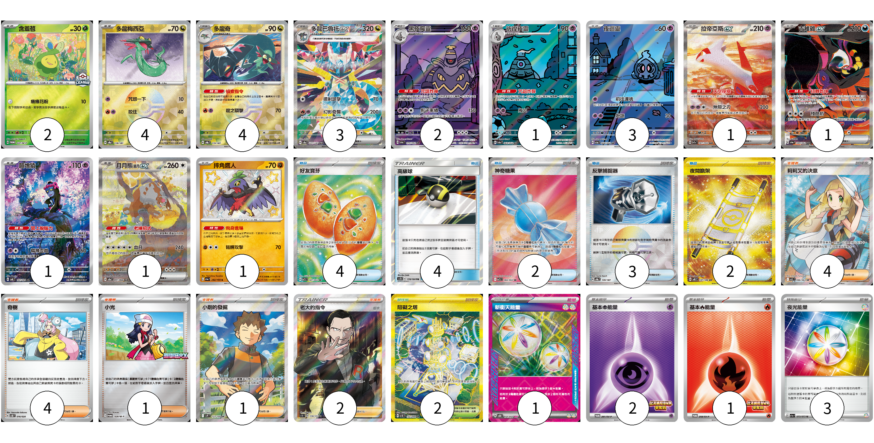 牌組構築方案 以此牌組為基礎新構築牌組 顯示卡面 顯示列表 寶可夢卡(24) 2 4 4 3 2 1 3 1 1 1 1 1 物品卡(15) 4 4 2 3 2 支援者卡(12) 4 4 1 1 2 競技場卡(2) 2 能量卡(7) 1 2 1 3 寶可夢卡(24) 卡牌名稱 張數 卡牌名稱 張數 含羞苞 M-P 037/M-P 02 多龍梅西亞 SV8a 118/187 04 多龍奇 SV8a 119/187 04 多龍巴魯托ex SV8a 221/187 03 黑夜魔靈 SV6a 070/064 02 彷徨夜靈 SV6a 069/064 01 夜巡靈 SV6a 068/064 03 拉帝亞斯ex SV7a 087/064 01 吉雉雞ex SV6a 089/064 01 願增猿 SV6 107/101 01 月月熊 赫月 ex SV5a 091/066 01 摔角鷹人 SV4a 282/190 01 物品卡(15) 卡牌名稱 張數 卡牌名稱 張數 好友寶芬 M1S 081/063 04 高級球 AS5b 178/186 04 神奇糖果 M1S 082/063 02 反擊捕捉器 SV8a 139/187 03 夜間擔架 SV8 137/106 02 支援者卡(12) 卡牌名稱 張數 卡牌名稱 張數 莉莉艾的決意 M1L 086/063 04 奇樹 SVOD 016/020 04 小光 M-P 028/M-P 01 小剛的發掘 SV9 123/100 01 老大的指令(坂木) SC1b 170/153 02 競技場卡(2) 卡牌名稱 張數 卡牌名稱 張數 阻礙之塔 SV10 132/098 02 能量卡(7) 卡牌名稱 張數 卡牌名稱 張數 新衝天能量 SV5K 071/071 01 基本【超】能量 SV-P 261/SV-P 02 基本【火】能量 SV-P 258/SV-P 01 夜光能量 SV1a 073/073 03 以此牌組為基礎新構築牌組 牌組編碼 gkmMFQ-uzrzqs-MSEWfe copy 列印牌組單 牌組編碼已複製 分享至SNS