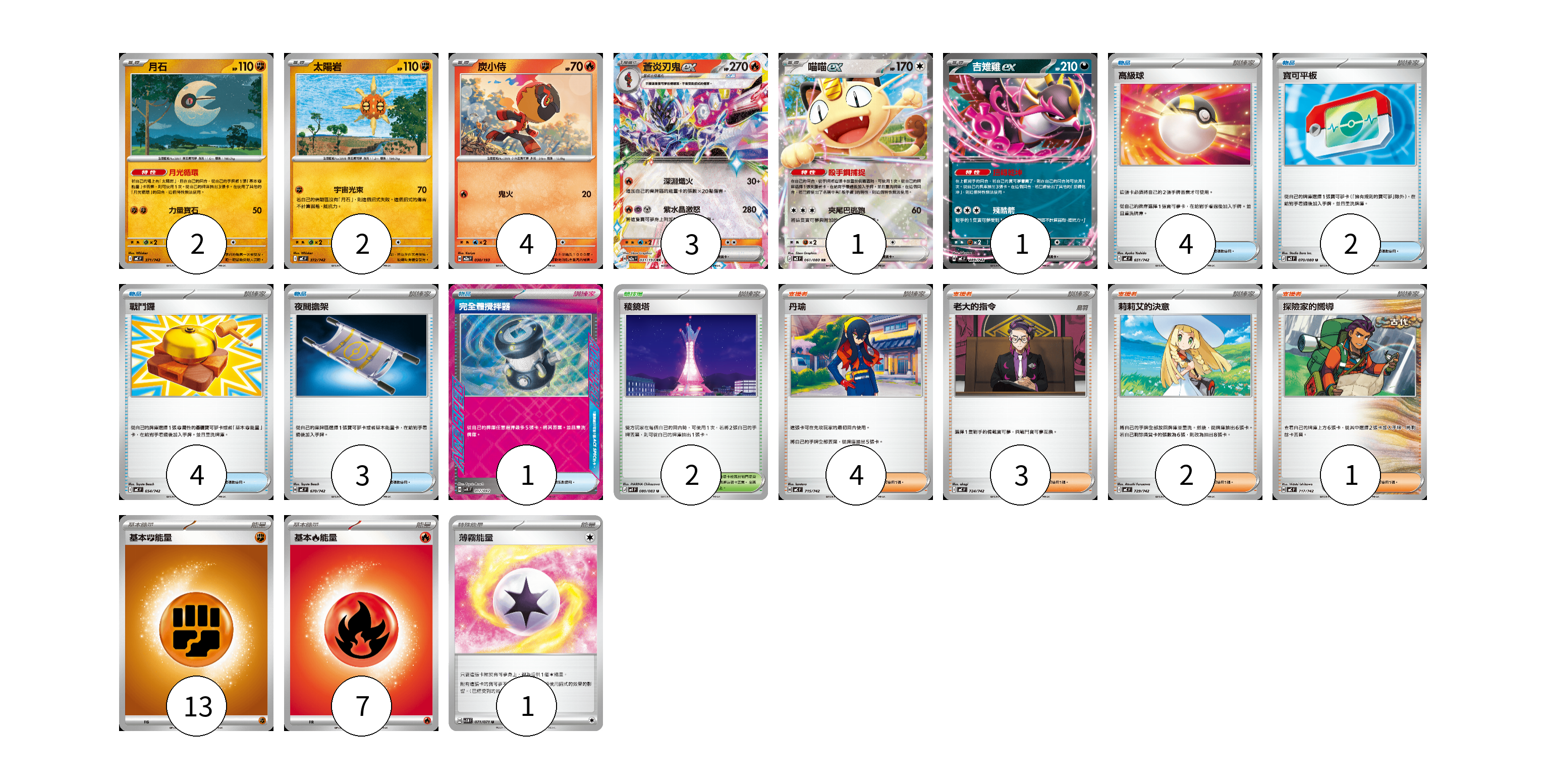 牌組構築方案 以此牌組為基礎新構築牌組 顯示卡面 顯示列表 寶可夢卡(13) 2 2 4 3 1 1 物品卡(14) 4 2 4 3 1 支援者卡(10) 4 3 2 1 競技場卡(2) 2 能量卡(21) 13 7 1 寶可夢卡(13) 卡牌名稱 張數 卡牌名稱 張數 月石 MC 371/742 02 太陽岩 MC 372/742 02 炭小侍 M2a 030/193 04 蒼炎刃鬼ex M2a 031/193 03 喵喵ex M3 061/080 01 吉雉雞ex MC 489/742 01 物品卡(14) 卡牌名稱 張數 卡牌名稱 張數 高級球 MC 651/742 04 寶可平板 M3 070/080 02 戰鬥鑼 MC 654/742 04 夜間擔架 MC 670/742 03 完全體攪拌器 SVK 017/042 01 支援者卡(10) 卡牌名稱 張數 卡牌名稱 張數 丹瑜 MC 715/742 04 老大的指令 MC 724/742 03 莉莉艾的決意 MC 729/742 02 探險家的嚮導 MC 717/742 01 競技場卡(2) 卡牌名稱 張數 卡牌名稱 張數 稜鏡塔 M4 080/083 02 能量卡(21) 卡牌名稱 張數 卡牌名稱 張數 基本【鬥】能量 MC FIG 13 基本【火】能量 MC FIR 07 薄霧能量 SV5M 071/071 01 以此牌組為基礎新構築牌組 牌組編碼 glklPn-JSuSUx-mGYXoQ copy 列印牌組單 牌組編碼已複製 分享至SNS