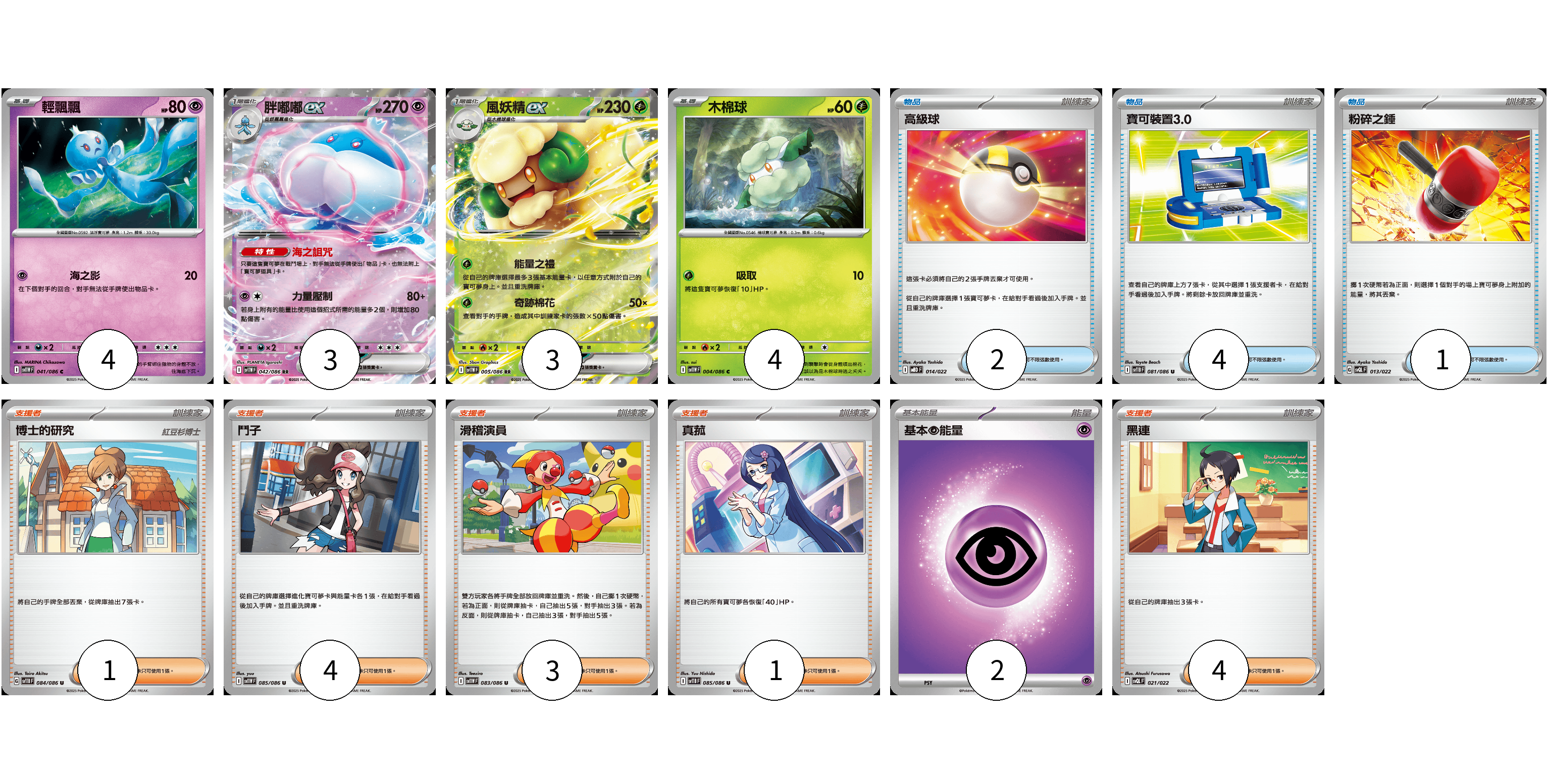 牌組構築方案 以此牌組為基礎新構築牌組 顯示卡面 顯示列表 寶可夢卡(14) 4 3 3 4 物品卡(7) 2 4 1 支援者卡(13) 1 4 3 1 4 能量卡(2) 2 寶可夢卡(14) 卡牌名稱 張數 卡牌名稱 張數 輕飄飄 SV11W 041/086 04 胖嘟嘟ex SV11W 042/086 03 風妖精ex SV11W 005/086 03 木棉球 SV11W 004/086 04 物品卡(7) 卡牌名稱 張數 卡牌名稱 張數 高級球 MBD 014/022 02 寶可裝置3.0 SV11B 081/086 04 粉碎之錘 SVQL 013/022 01 支援者卡(13) 卡牌名稱 張數 卡牌名稱 張數 博士的研究 SV11B 084/086 01 鬥子 SV11W 085/086 04 滑稽演員 SV11W 083/086 03 真菰 SV11B 085/086 01 黑連 SVQL 021/022 04 能量卡(2) 卡牌名稱 張數 卡牌名稱 張數 基本【超】能量 MBD PSY 02 以此牌組為基礎新構築牌組 牌組編碼 goJRjJ-STjIcq-qjIRIJ copy 列印牌組單 牌組編碼已複製 分享至SNS