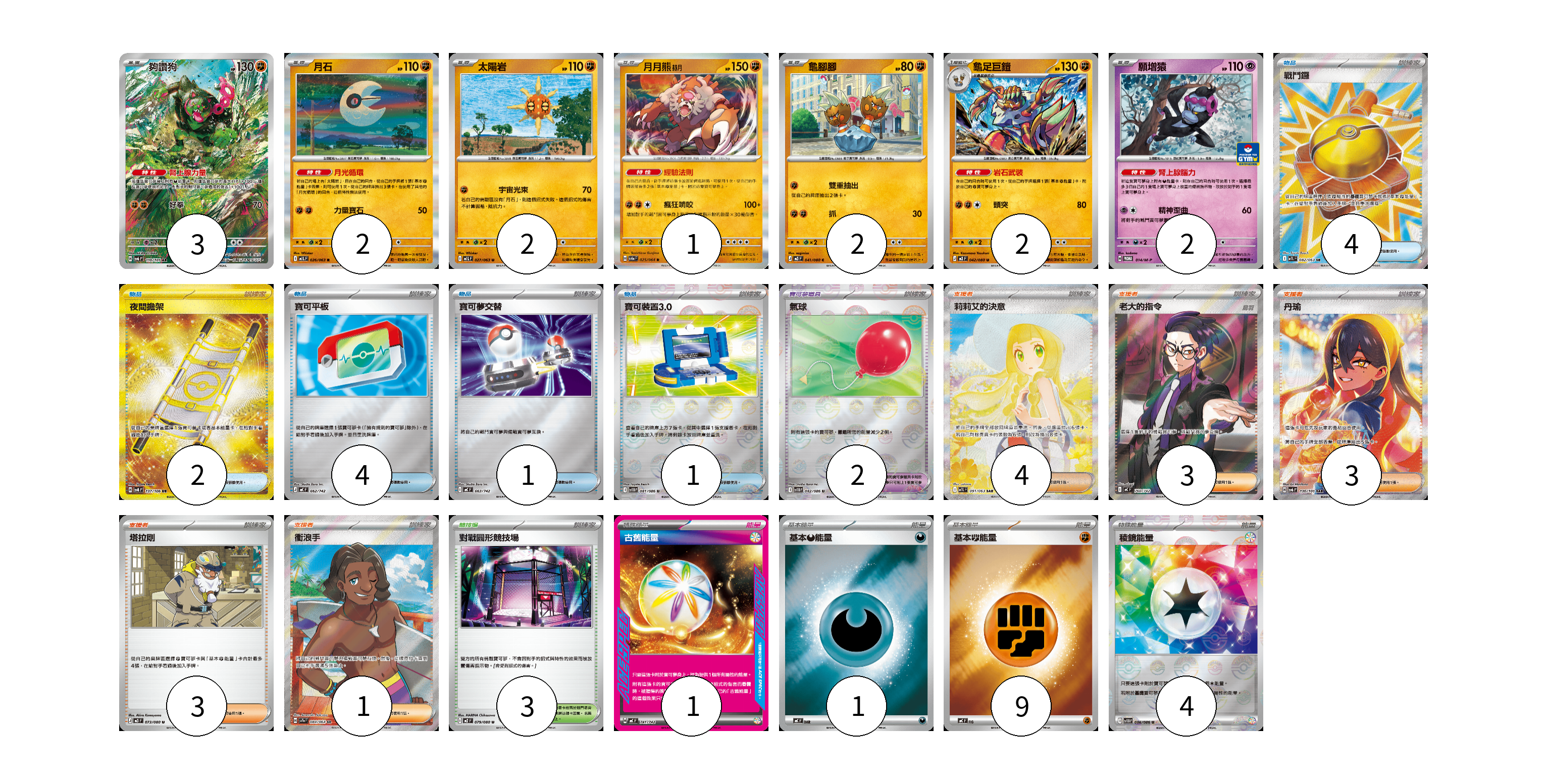 牌組構築方案 以此牌組為基礎新構築牌組 顯示卡面 顯示列表 寶可夢卡(14) 3 2 2 1 2 2 2 寶可夢道具(2) 2 物品卡(12) 4 2 4 1 1 支援者卡(14) 4 3 3 3 1 競技場卡(3) 3 能量卡(15) 1 1 9 4 寶可夢卡(14) 卡牌名稱 張數 卡牌名稱 張數 夠讚狗 SV6 110/101 03 月石 M1L 026/063 02 太陽岩 M1L 027/063 02 月月熊 赫月 SV6a 025/064 01 龜腳腳 M3 041/080 02 龜足巨鎧 M3 042/080 02 願增猿 M-P 014/M-P 02 寶可夢道具(2) 卡牌名稱 張數 卡牌名稱 張數 氣球 SV11B 082/086 02 物品卡(12) 卡牌名稱 張數 卡牌名稱 張數 戰鬥鑼 M1L 082/063 04 夜間擔架 SV8 137/106 02 寶可平板 MC 662/742 04 寶可夢交替 MC 663/742 01 寶可裝置3.0 SV11B 081/086 01 支援者卡(14) 卡牌名稱 張數 卡牌名稱 張數 莉莉艾的決意 M1L 091/063 04 老大的指令(烏羽) MC 760/742 03 丹瑜 SV6 130/101 03 塔拉剛 M3 073/080 03 衝浪手 SV7a 084/064 01 競技場卡(3) 卡牌名稱 張數 卡牌名稱 張數 對戰圓形競技場 M2 079/080 03 能量卡(15) 卡牌名稱 張數 卡牌名稱 張數 古舊能量 MC 741/742 01 基本【惡】能量 MC DAR 01 基本【鬥】能量 MC FIG 09 稜鏡能量 SV11B 086/086 04 以此牌組為基礎新構築牌組 牌組編碼 gpJpKQ-IxGgKT-EZfYts copy 列印牌組單 牌組編碼已複製 分享至SNS